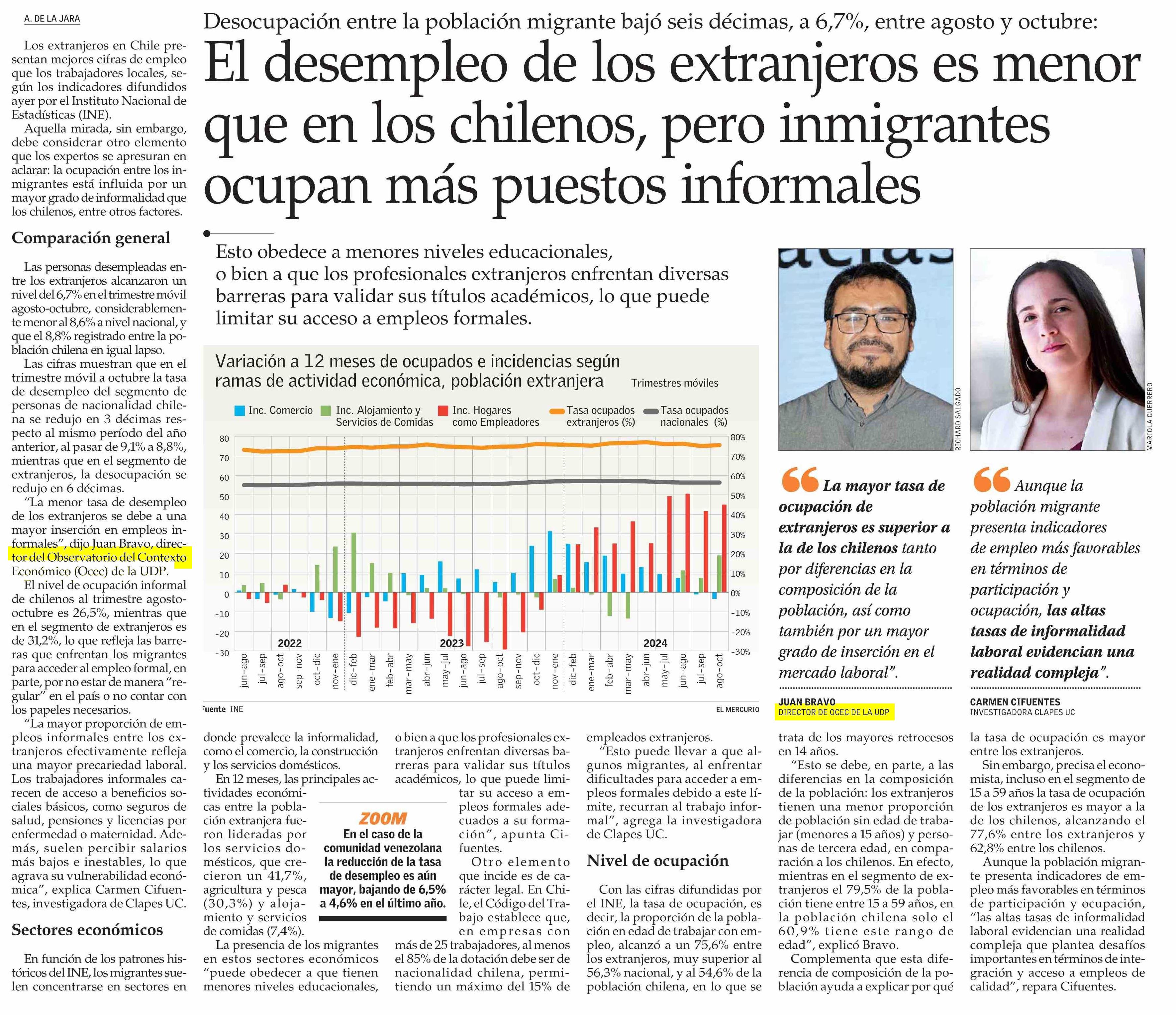 El desempleo de los extranjeros es menor que en los chilenos, pero inmigrantes ocupan más puestos informales 04-12-2024 El Mercurio |