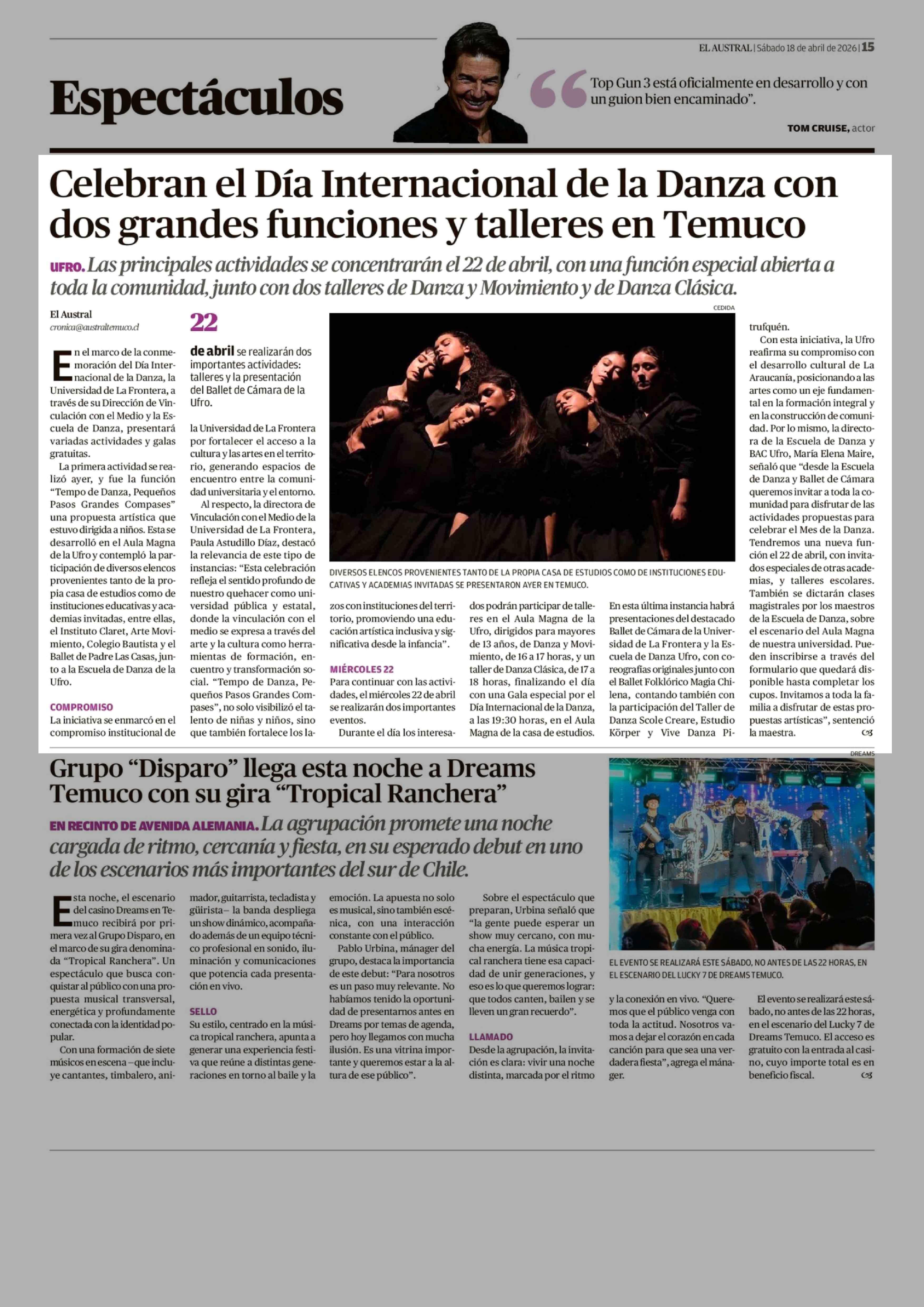 | Título: | Celebran el Día Internacional de la Danza con dos grandes funciones y talleres en Temuco |