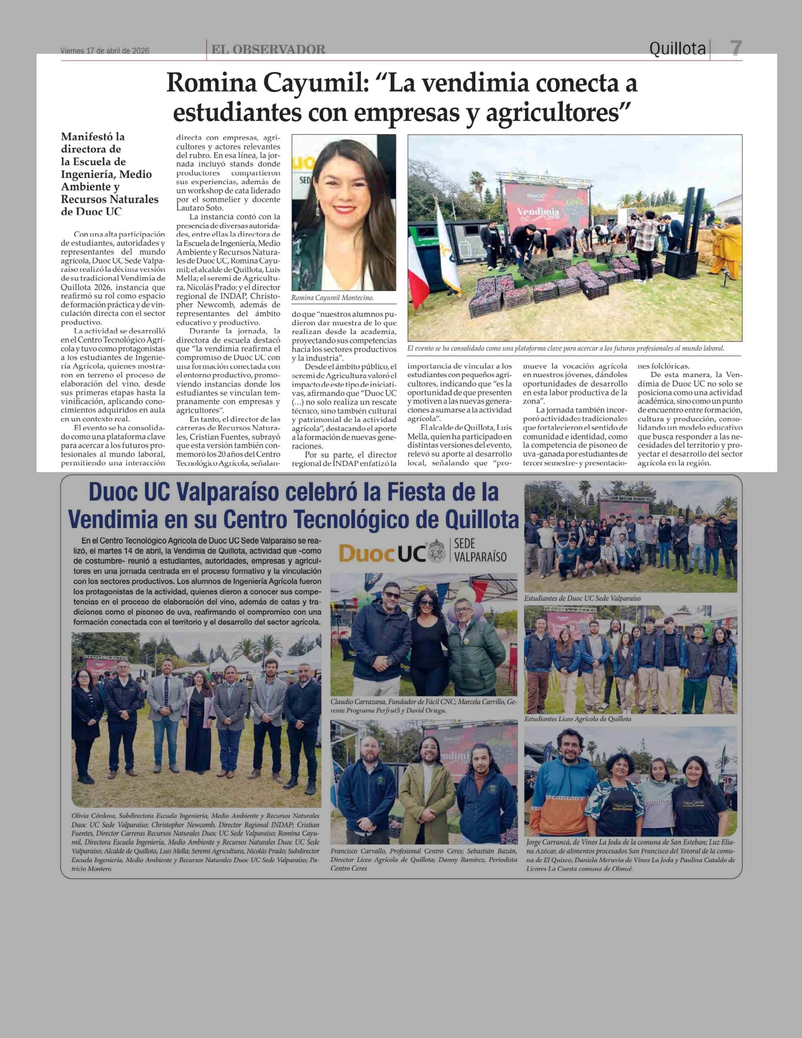 Romina Cayumil: “La vendimia conecta a estudiantes con empresas v aericultores” 17-04-2026 El Observador |