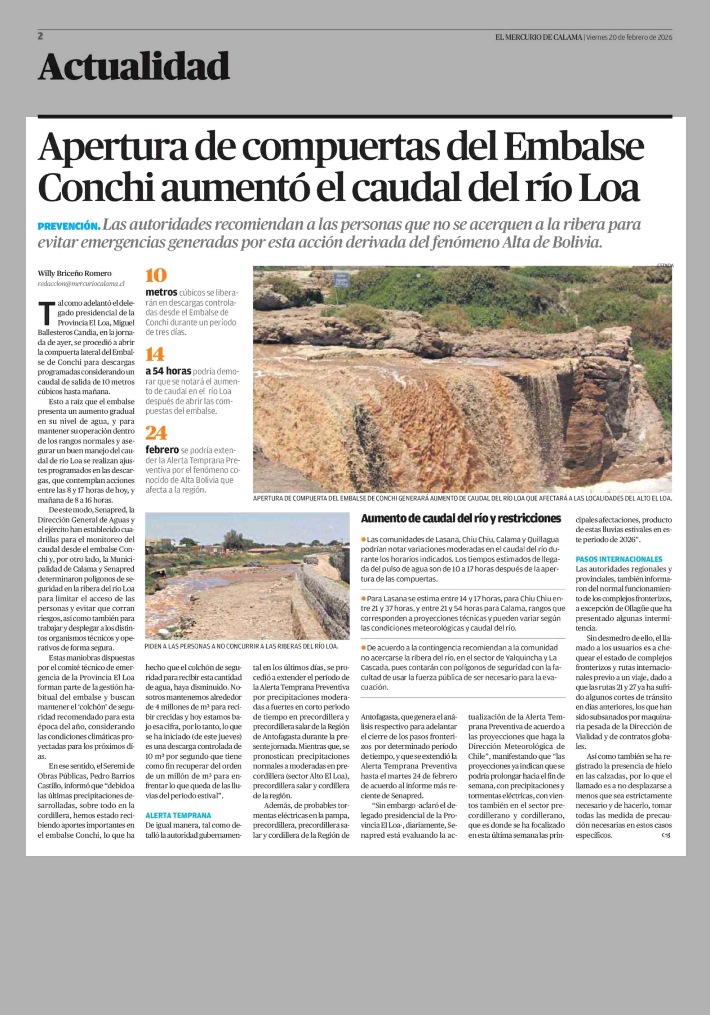 Apertura de compuertas del Embalse Conchi aumentó el caudal del río Loa 20-02-2026 El Mercurio de Calama |