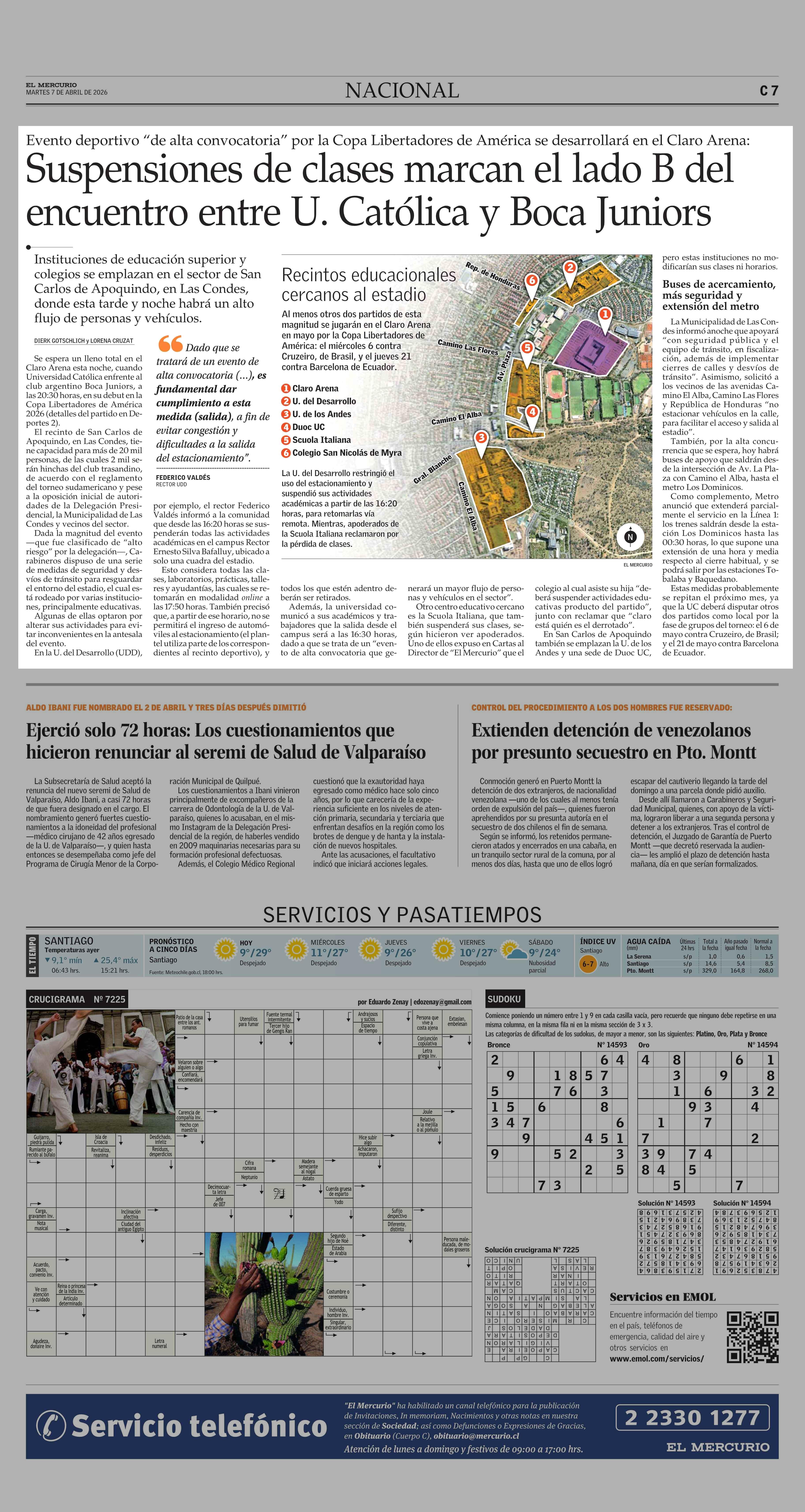 Suspensiones de clases marcan el lado B del encuentro entre U. Católica y Boca Juniors 07-04-2026 El Mercurio |