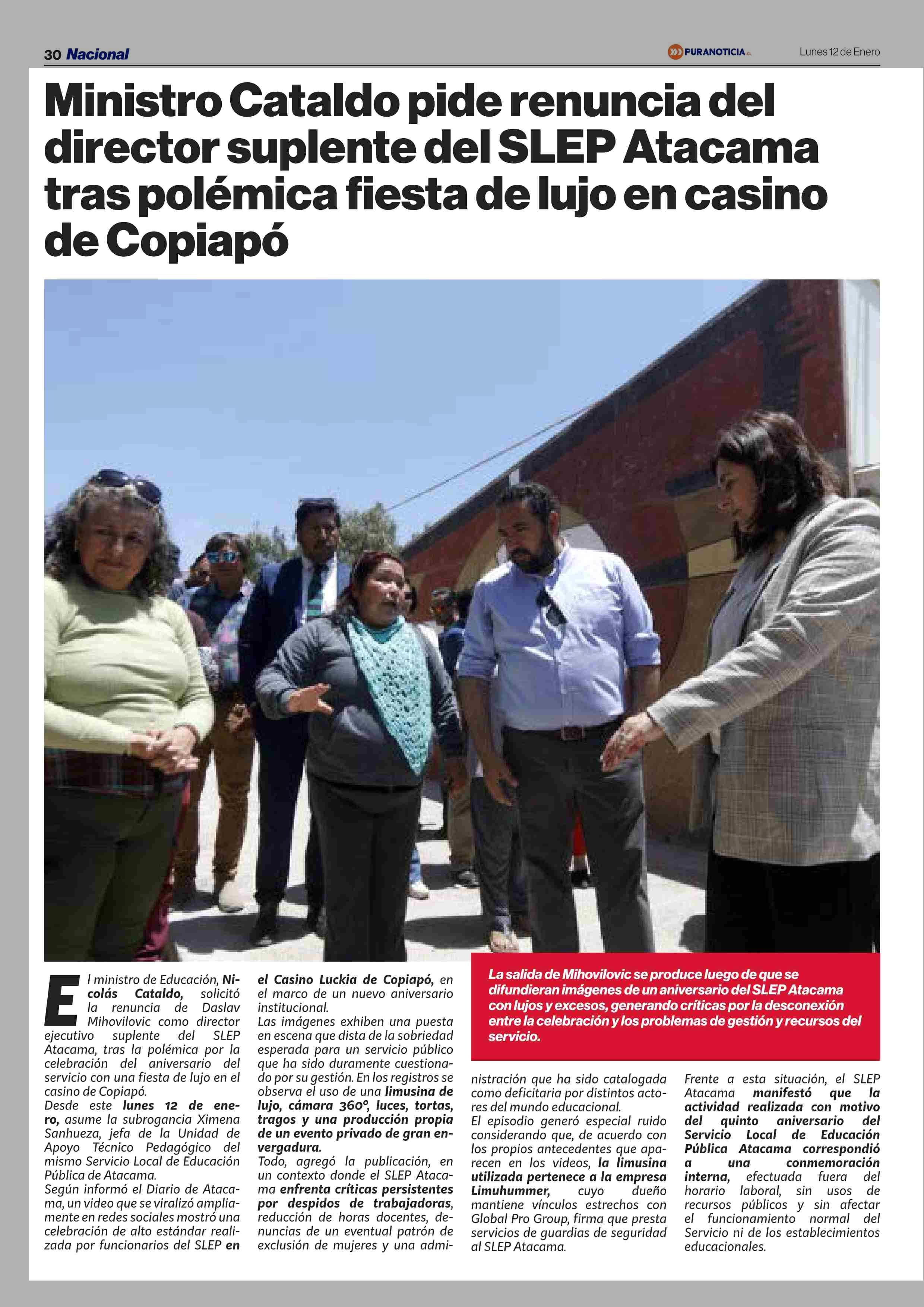Ministro Cataldo pide renuncia del director suplente del SLEP Atacama tras polémica fiesta de lujo en casino de Copiapó 12-01-2026 Puranoticia.cl |