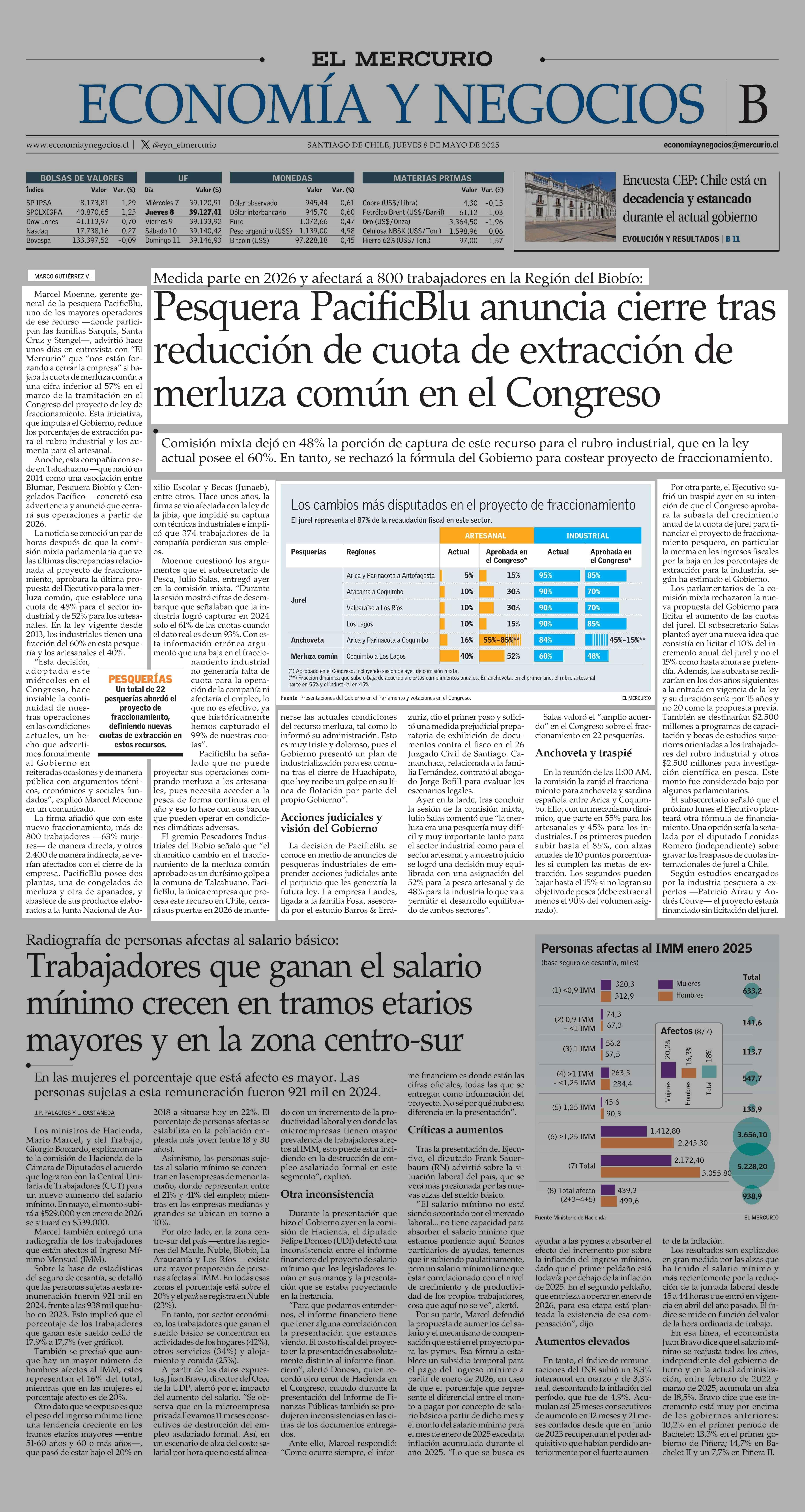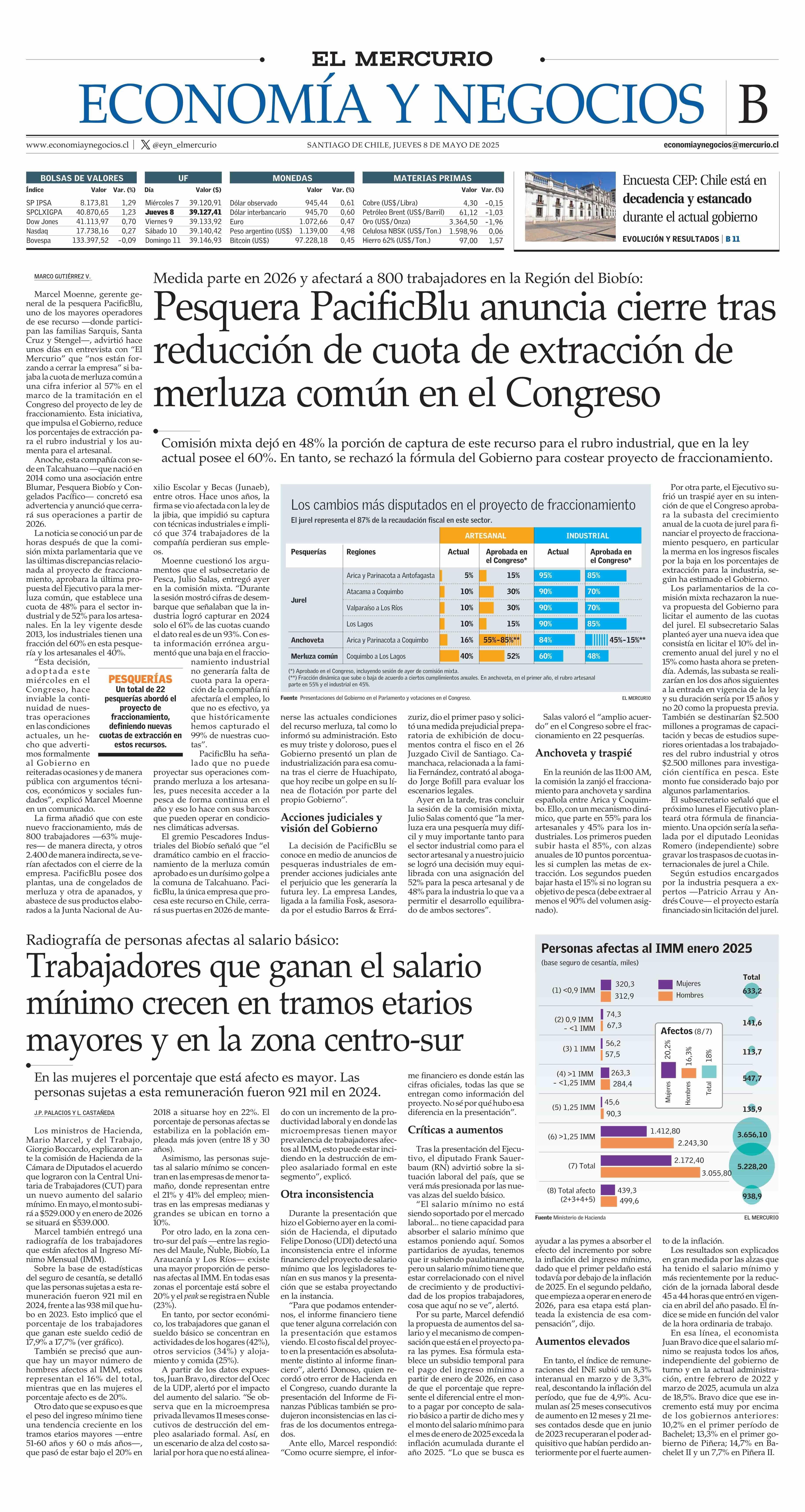 Pesquera PacificBlu anuncia cierre tras reducción de cuota de extracción de merluza común en el Congreso 08-05-2025 El Mercurio |