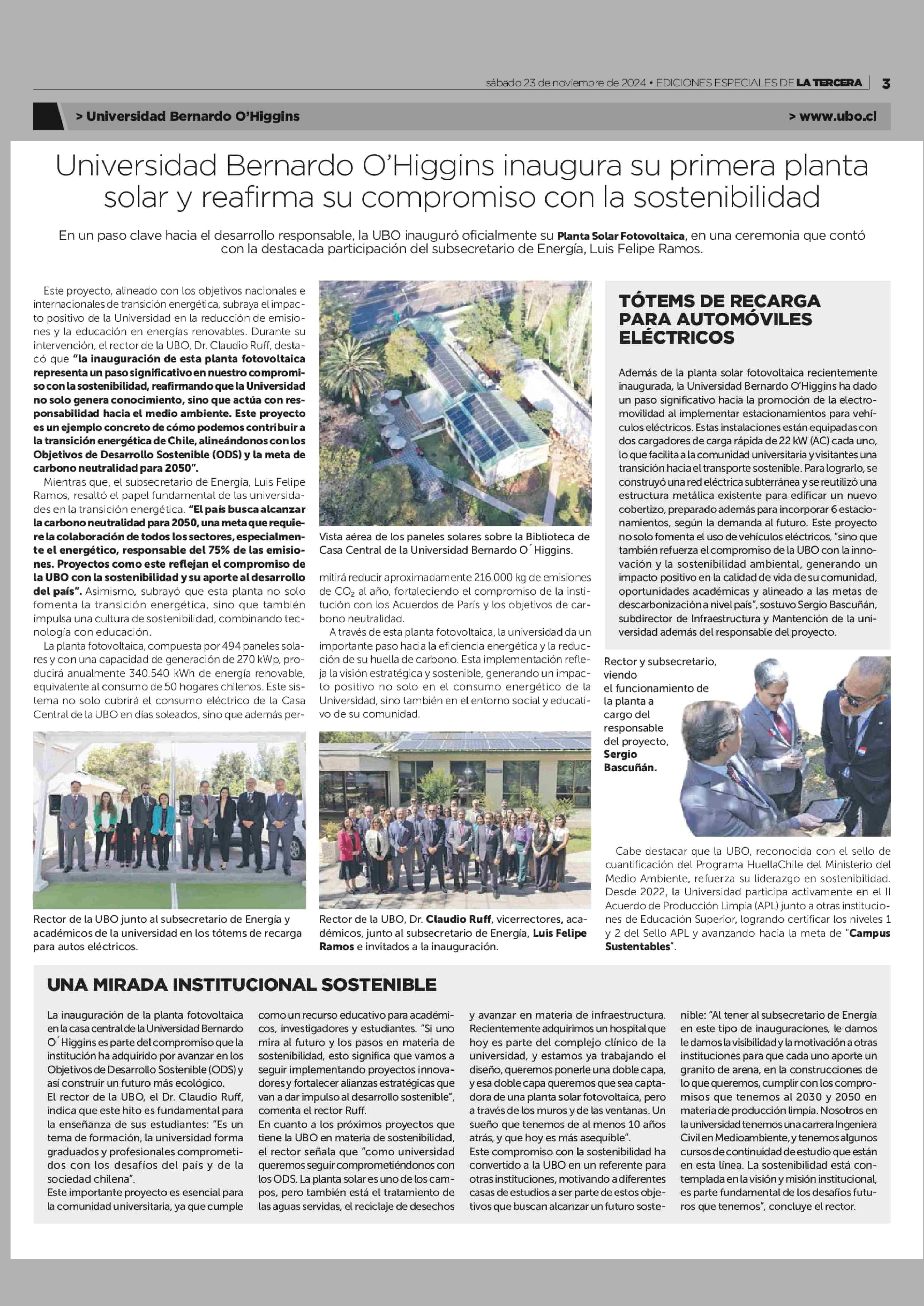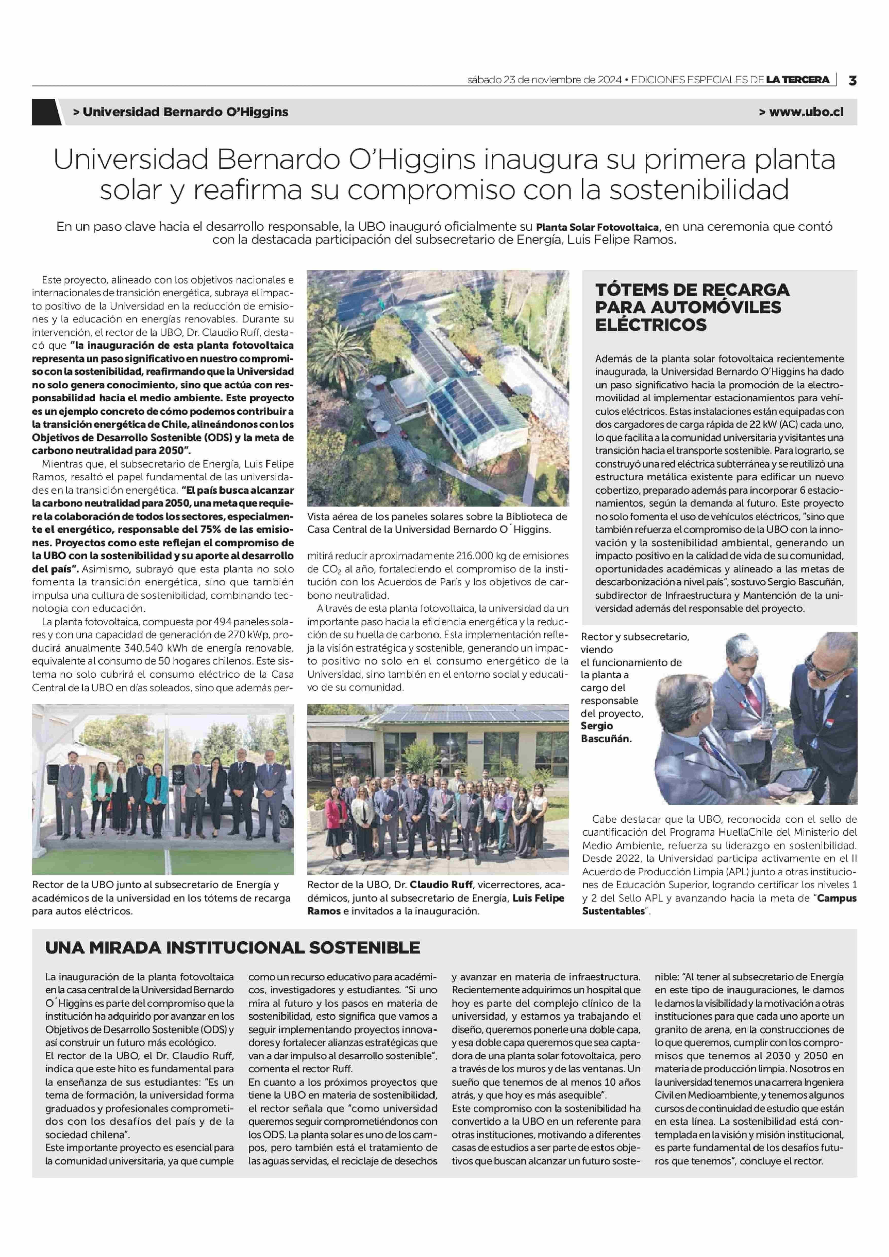 Universidad Bernardo O'Higgins inaugura su primera planta solar y reafirma su compromiso con la sostenibilidad 23-11-2024 La Tercera |