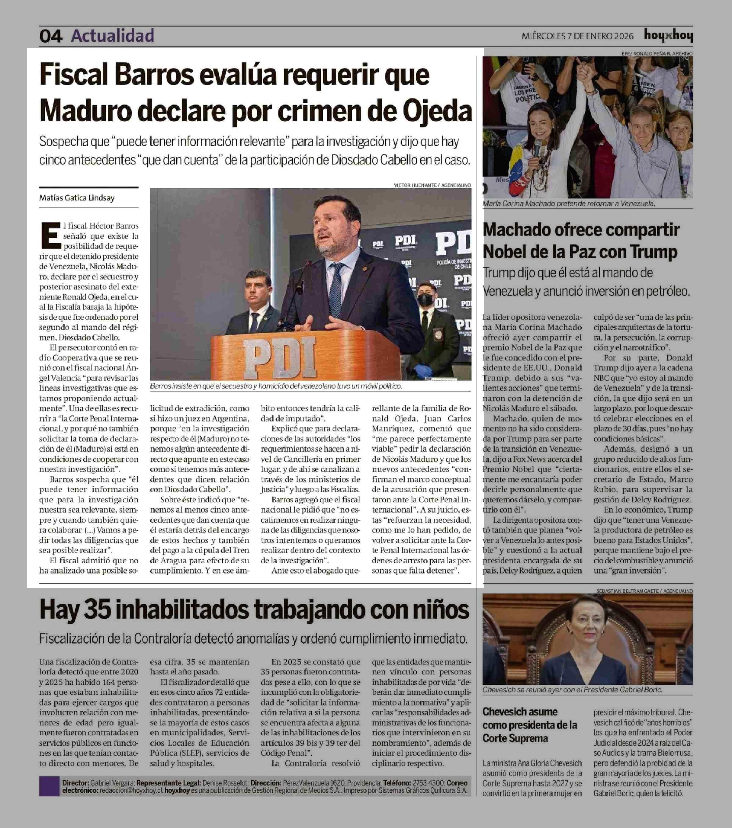 Fiscal Barros evalúa requerir que Maduro declare por crimen de Ojeda 07-01-2026 Hoy x Hoy Concepción |