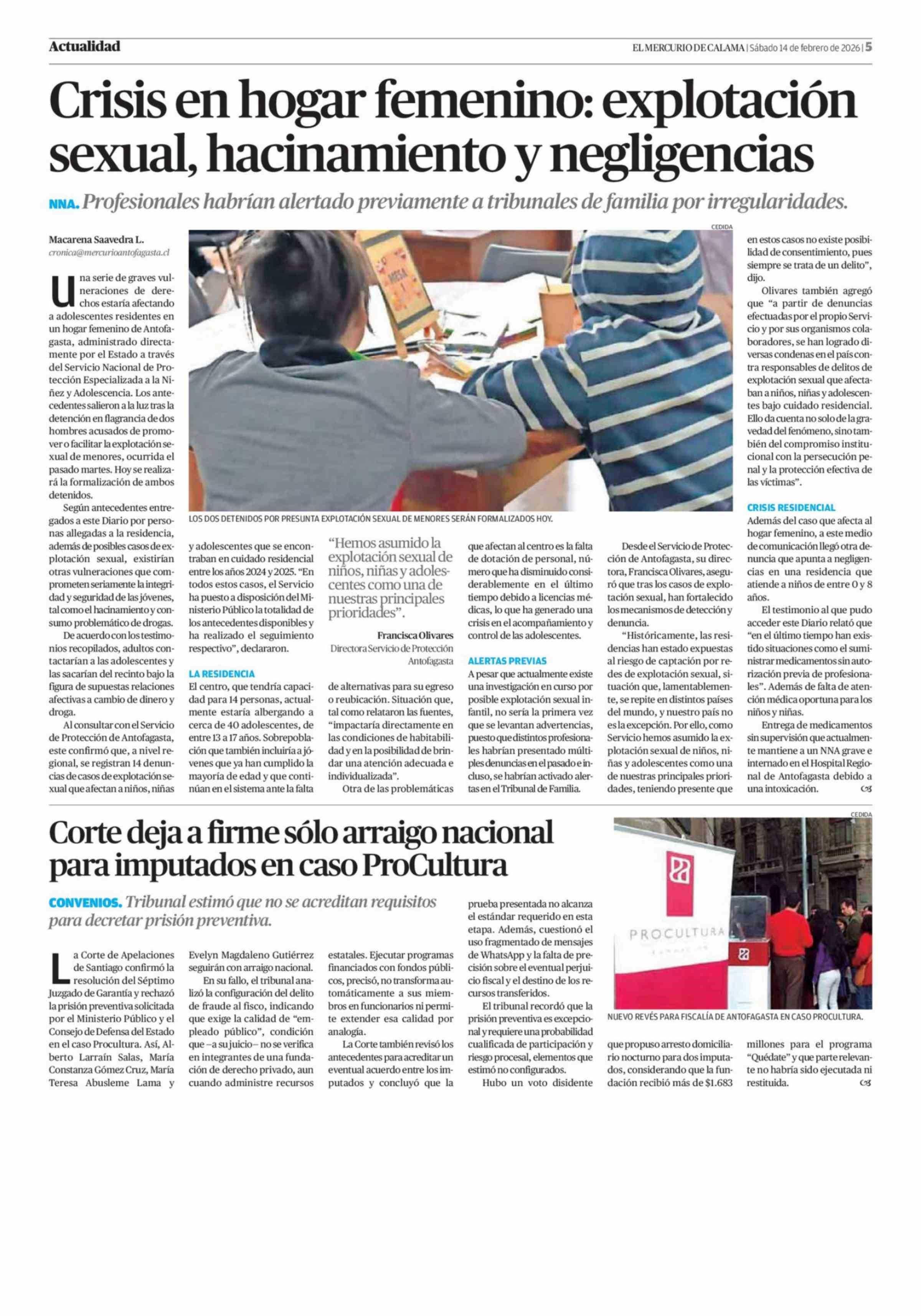 Crisis en hogar femenino: explotación sexual, hacinamiento y negligencias 14-02-2026 El Mercurio de Calama |