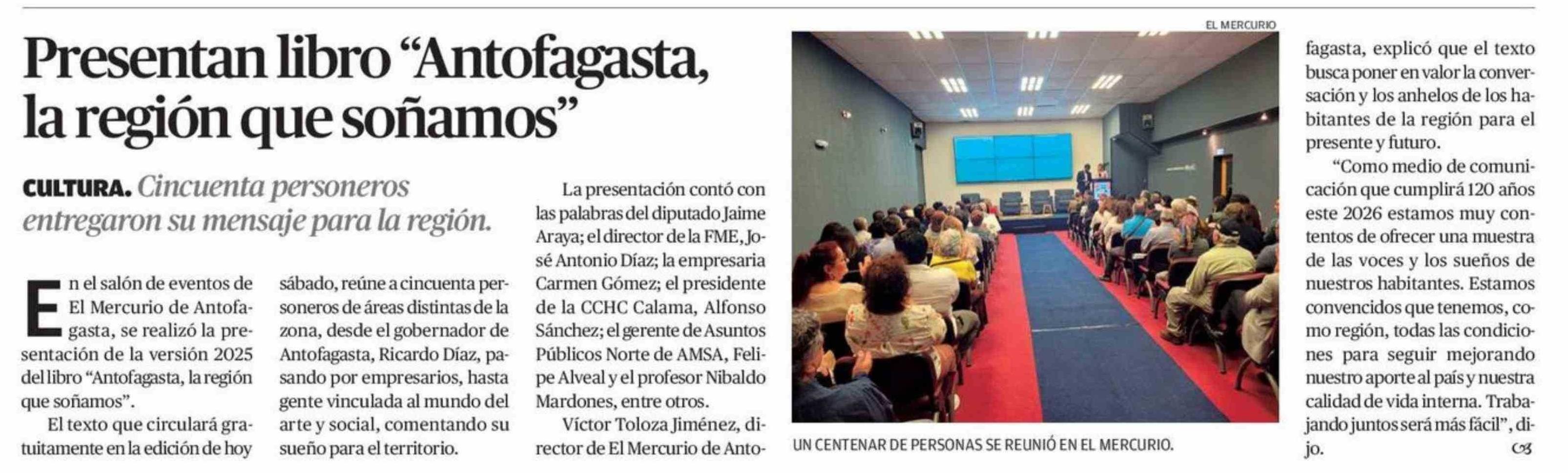 Presentan libro "Antofagasta, la región que soñamos" 17-01-2026 El Mercurio de Antofagasta |