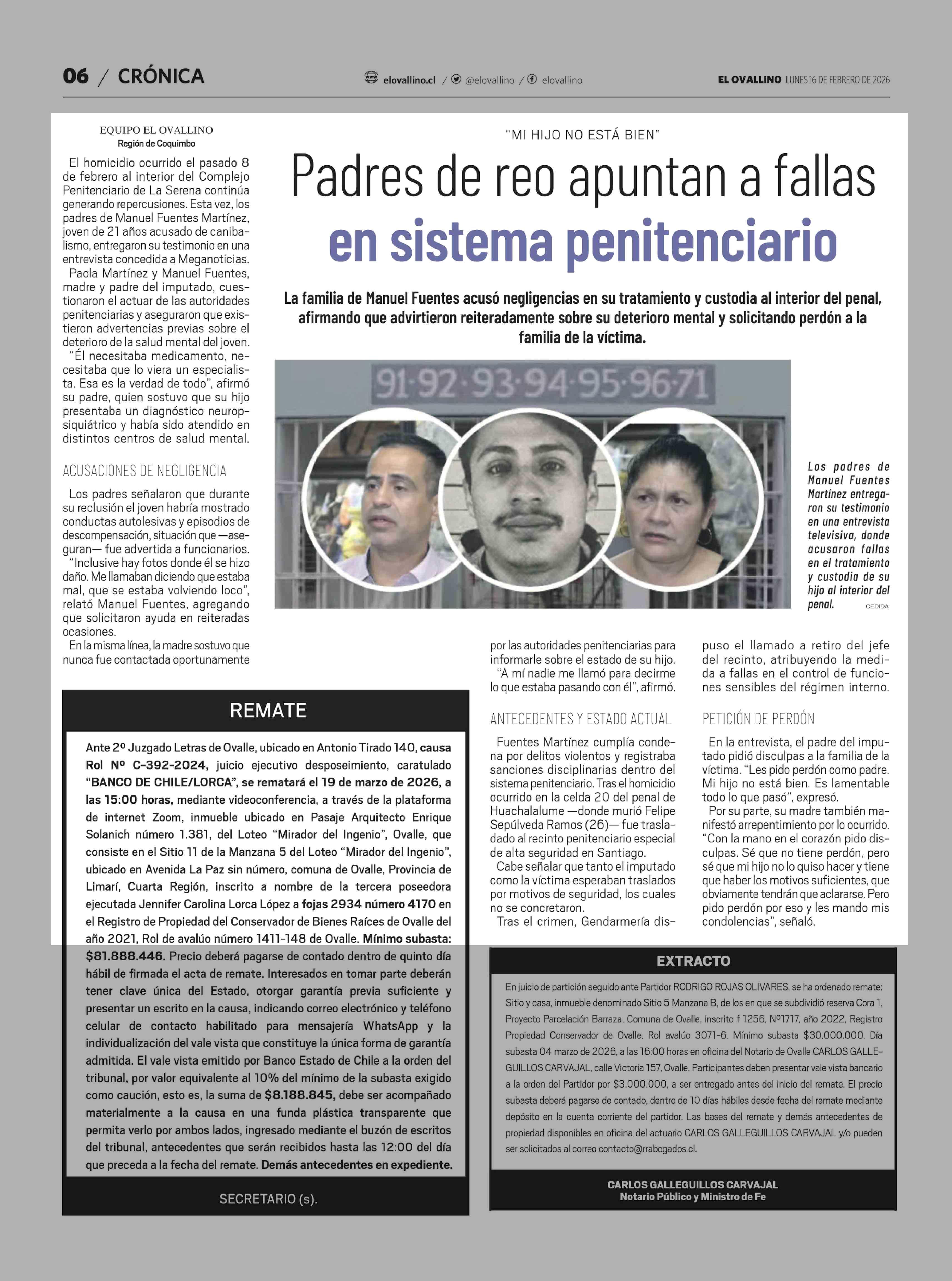 Padres de reo apuntan a fallas en sistema penitenciario 16-02-2026 El Ovallino |