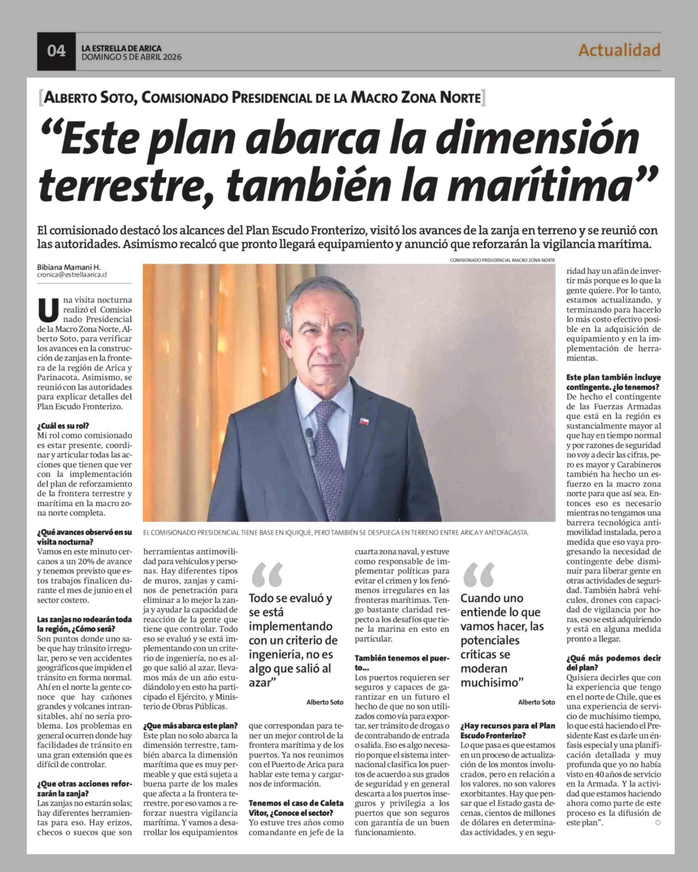 "Este plan abarca la dimensión terrestre, también la marítima" 05-04-2026 La Estrella de Arica |