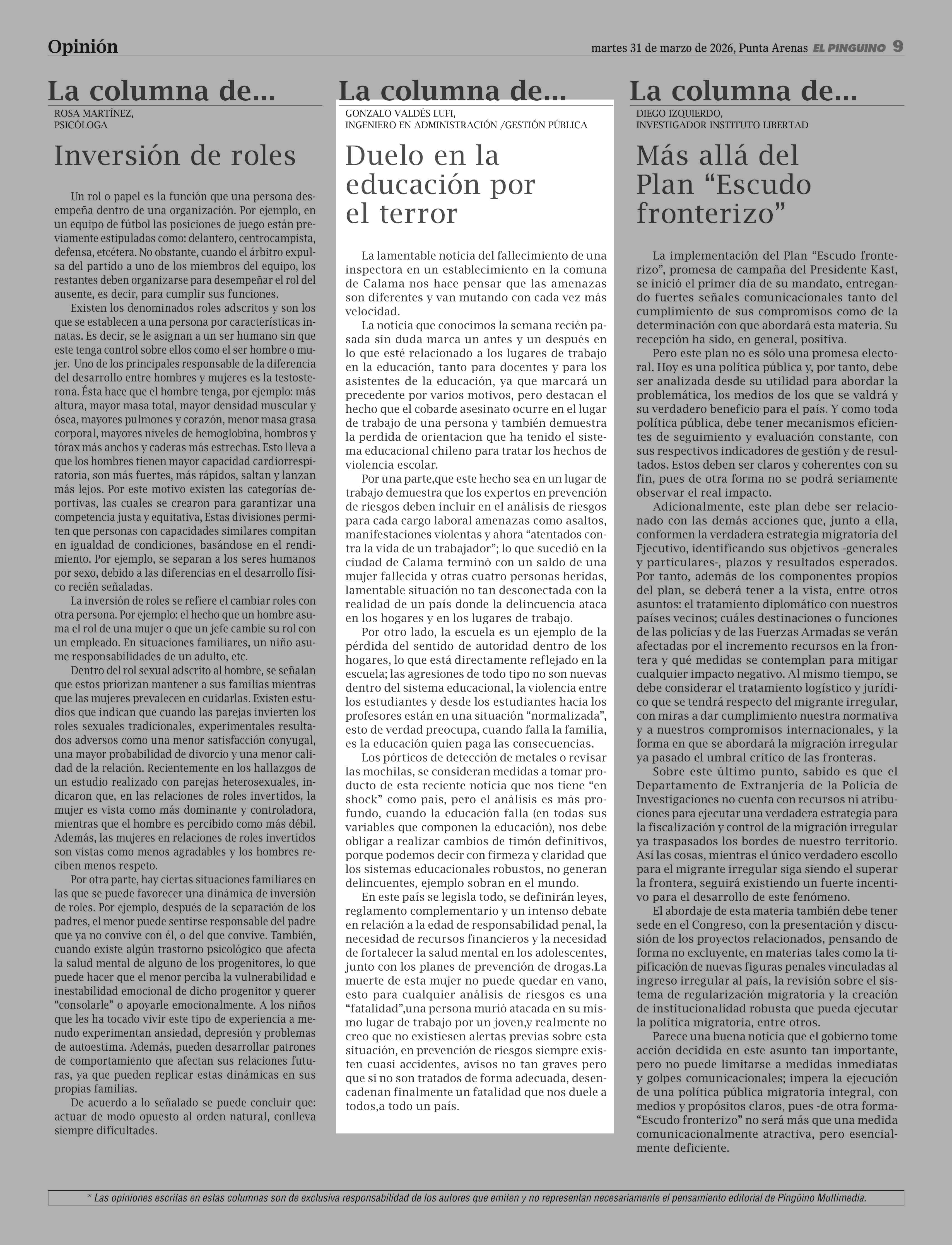 Columnas de Opinión: Duelo en la educación por el terror 31-03-2026 El Pingüino |