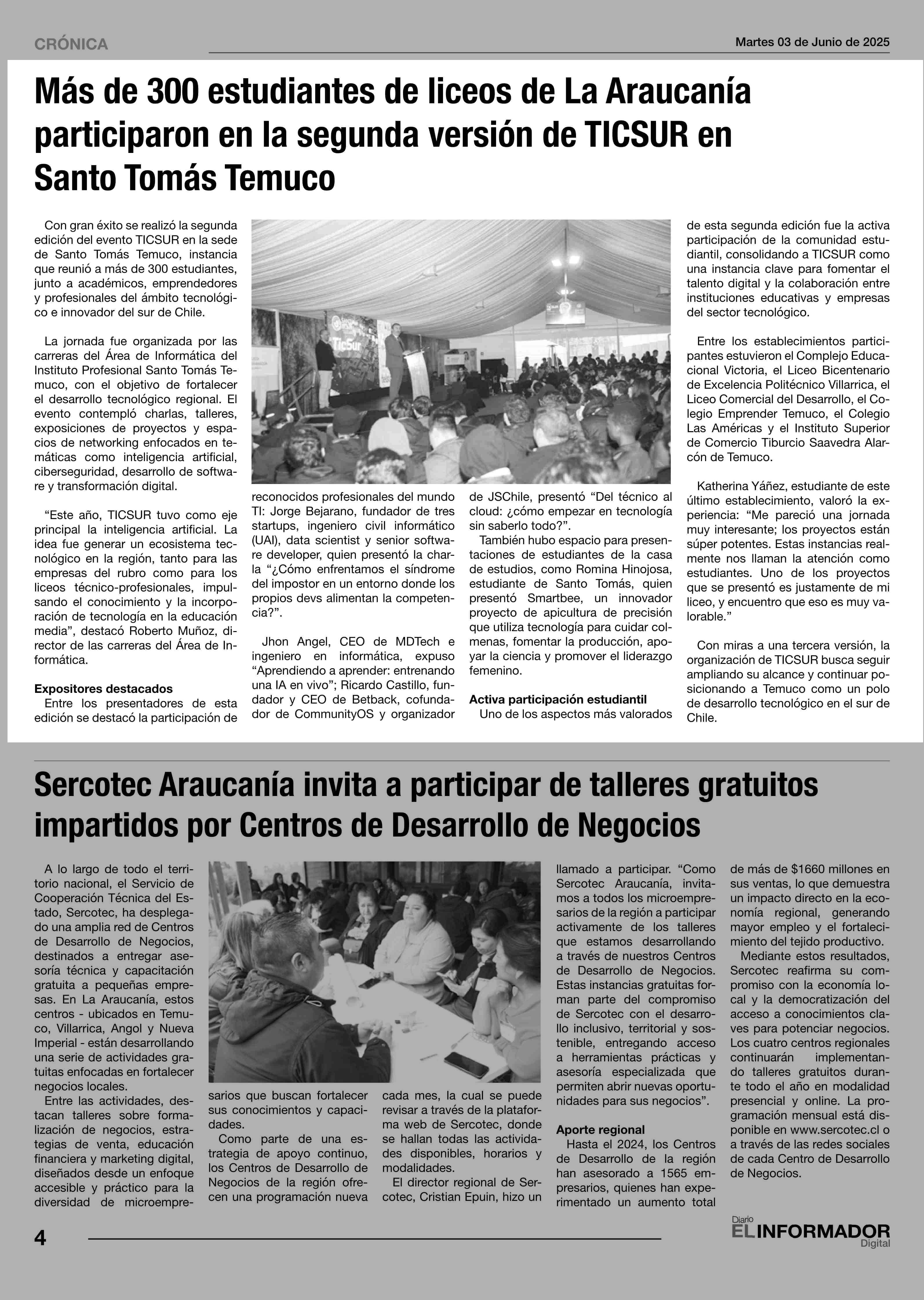Más de 300 estudiantes de liceos de La Araucanía participaron en la segunda versión de TICSUR en Santo Tomás Temuco 03-06-2025 El Informador |