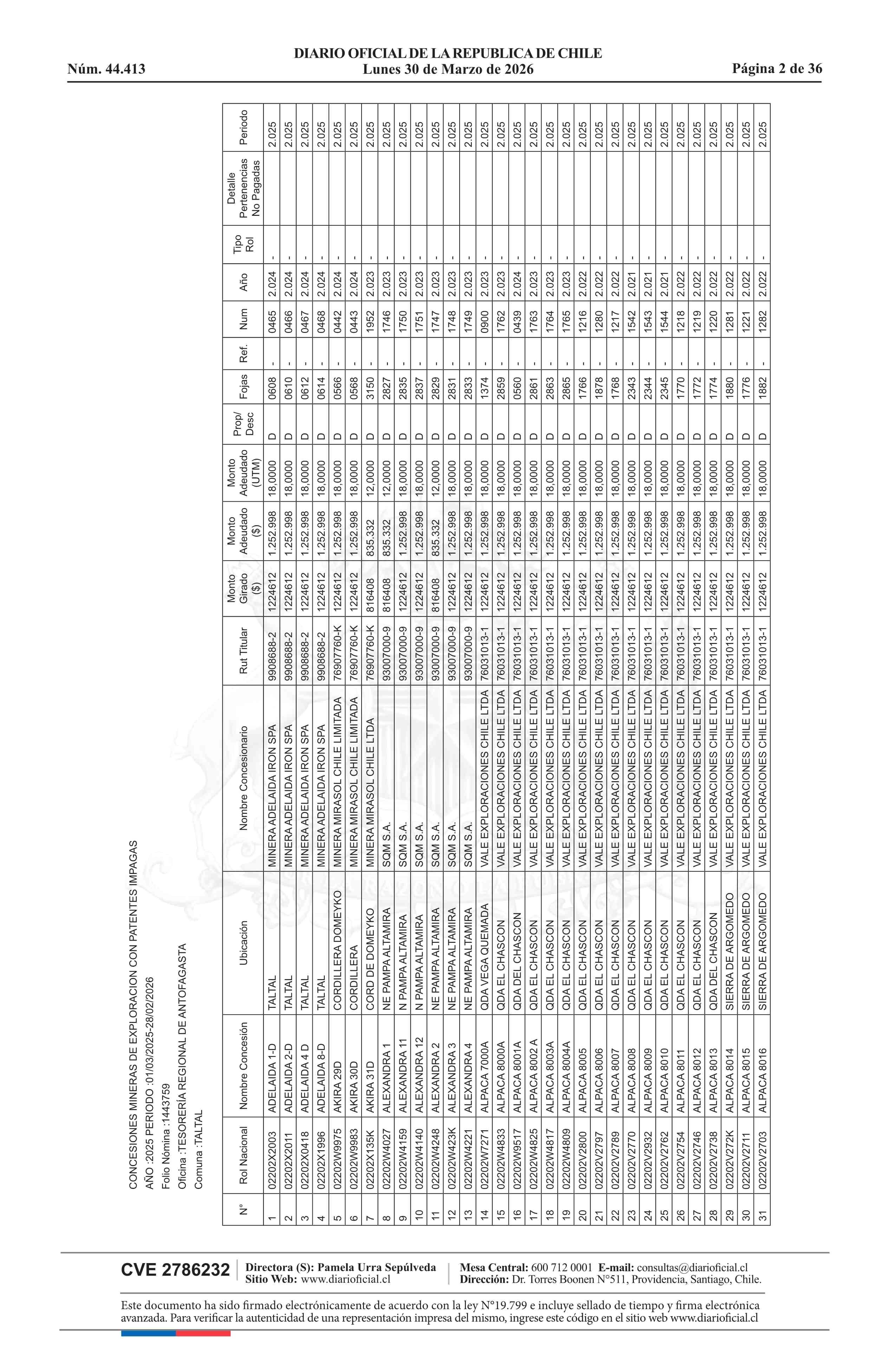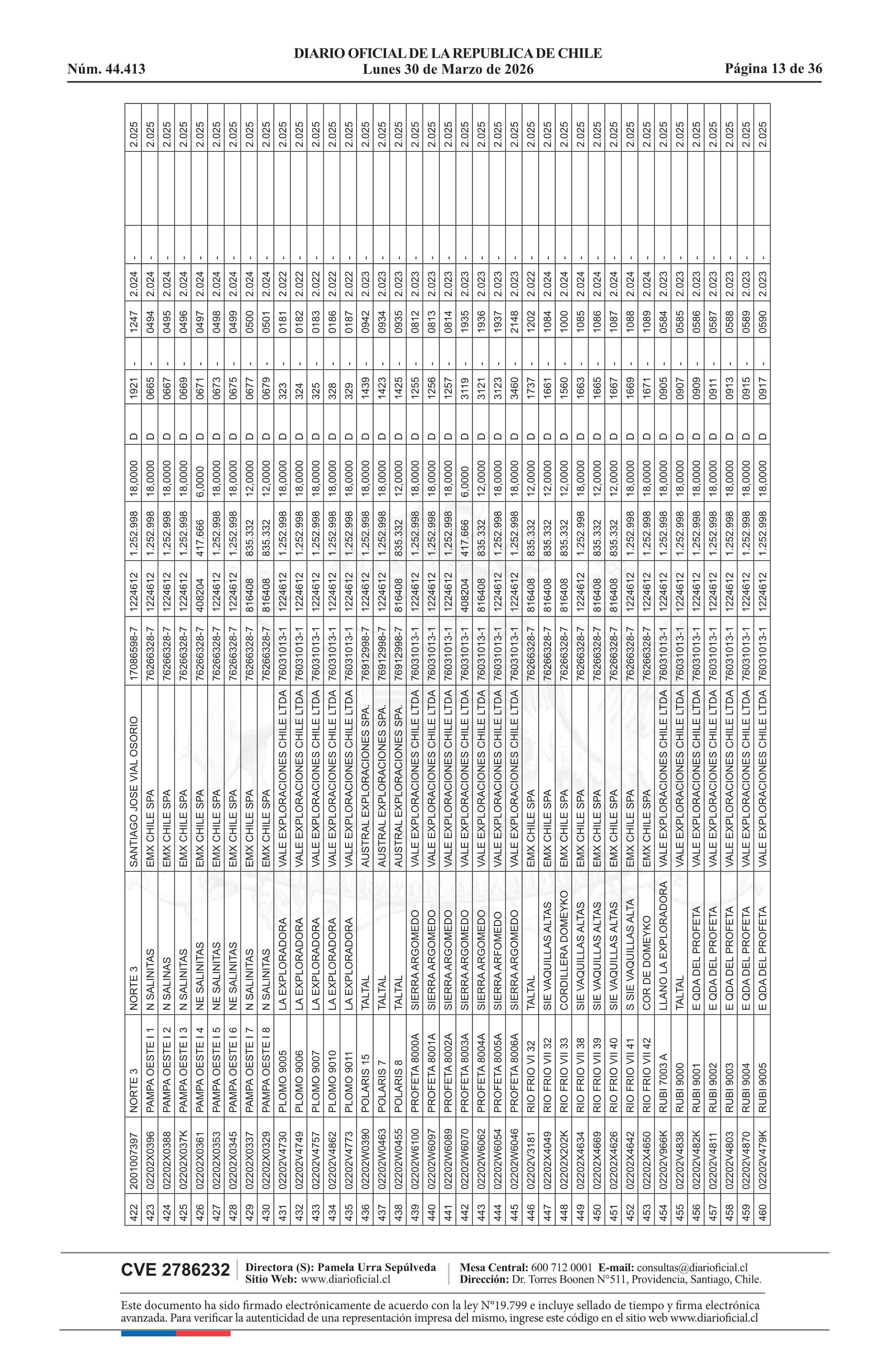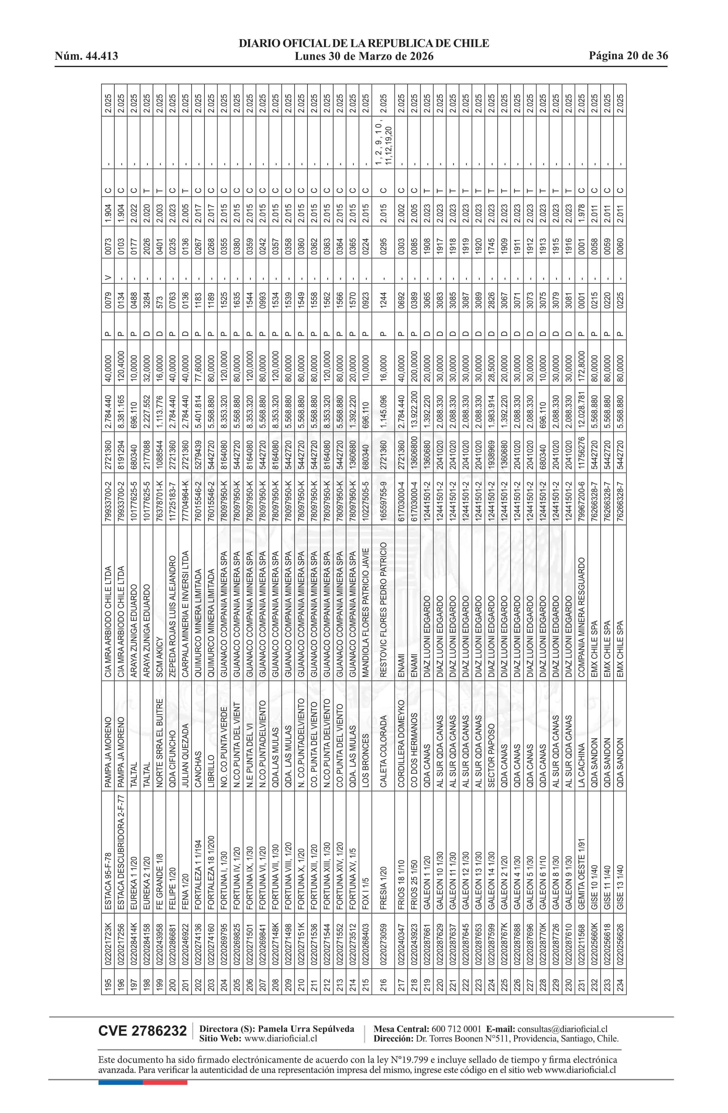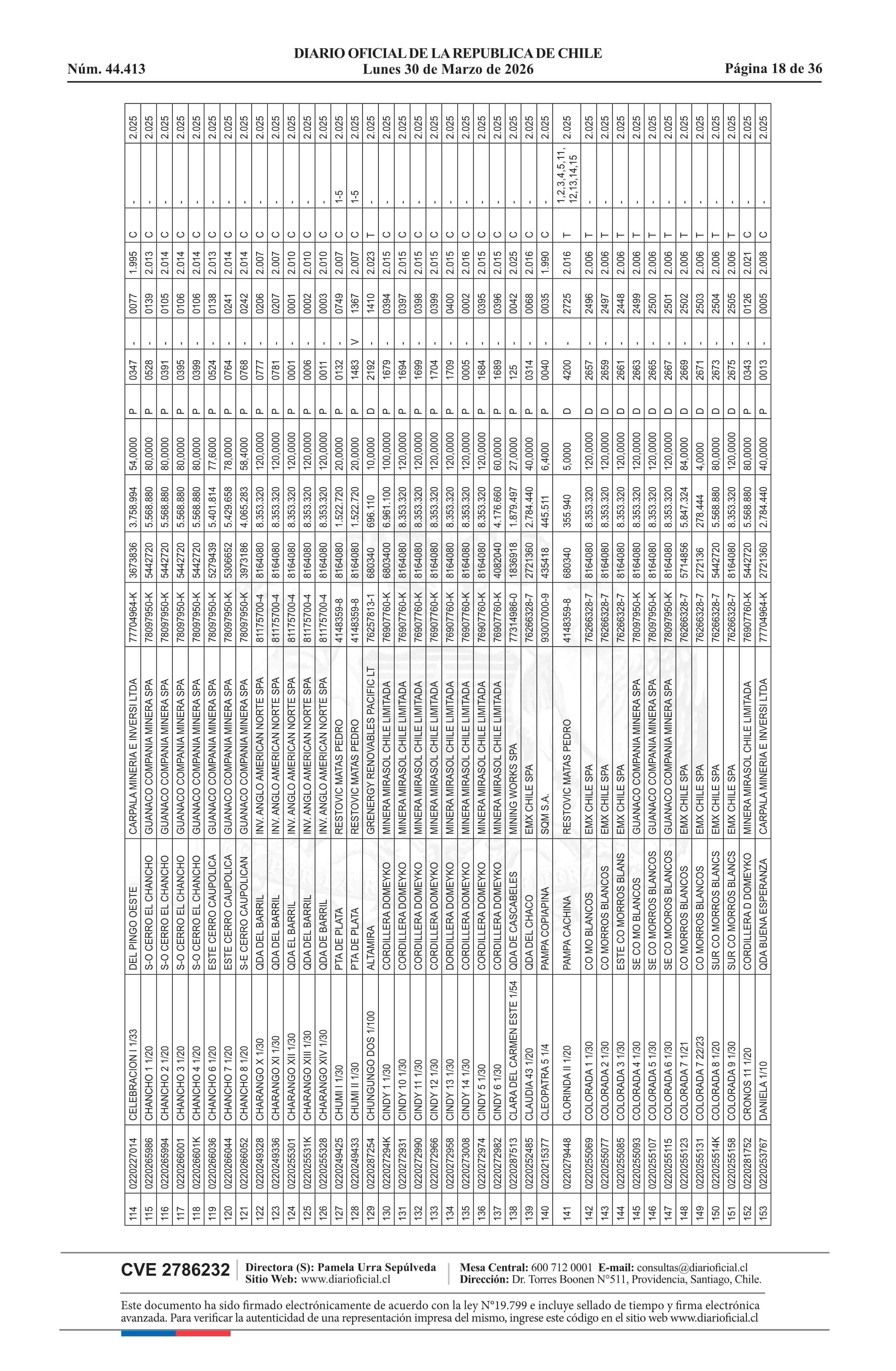 Fuente: DIARIO OFICIAL CHILE - BOLETÍN OFICIAL DE MINERÍA (DIARIO OFICIAL CHILE – BOM – NÓMINA REMATE) Página(s): 54-89