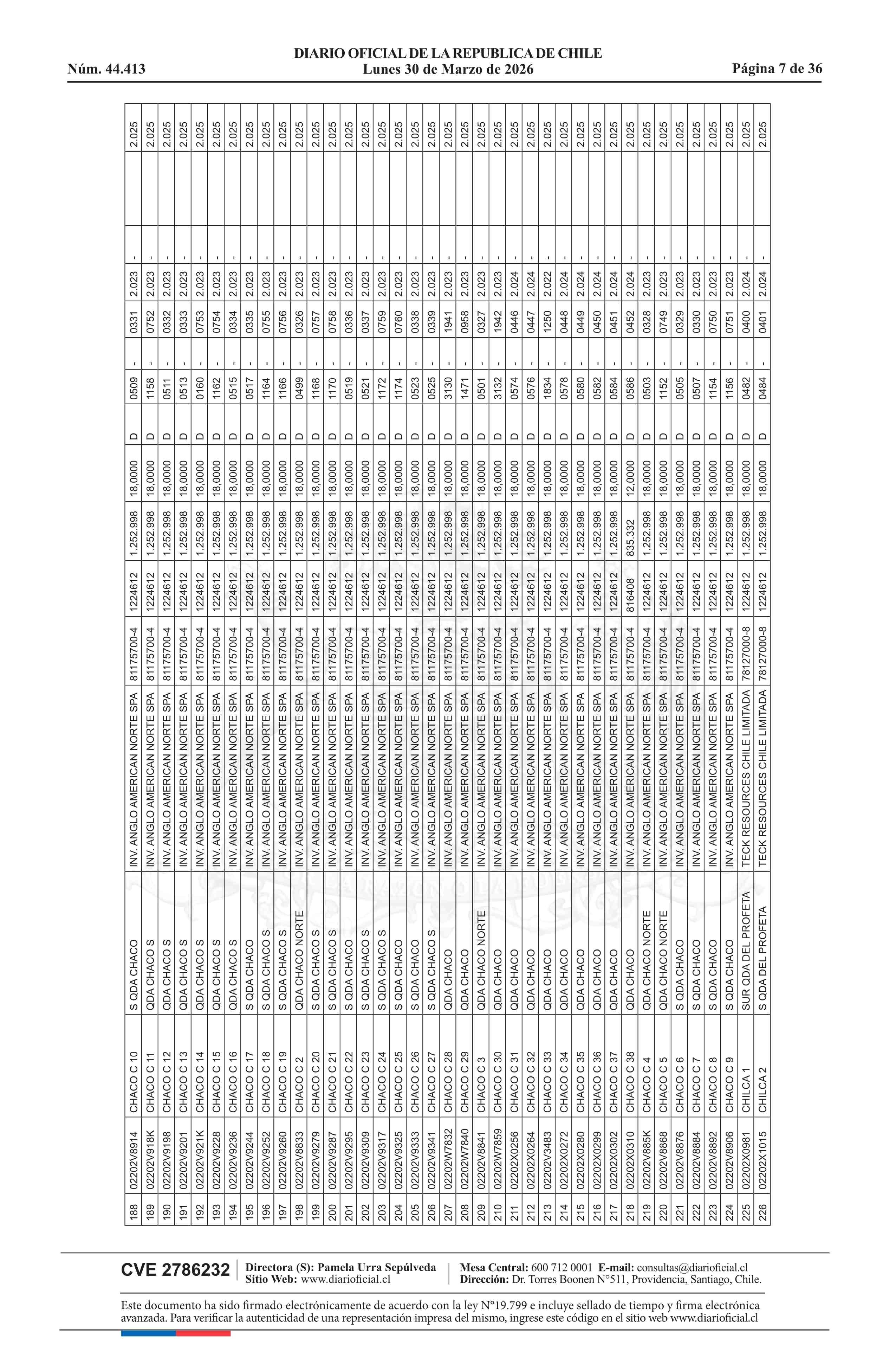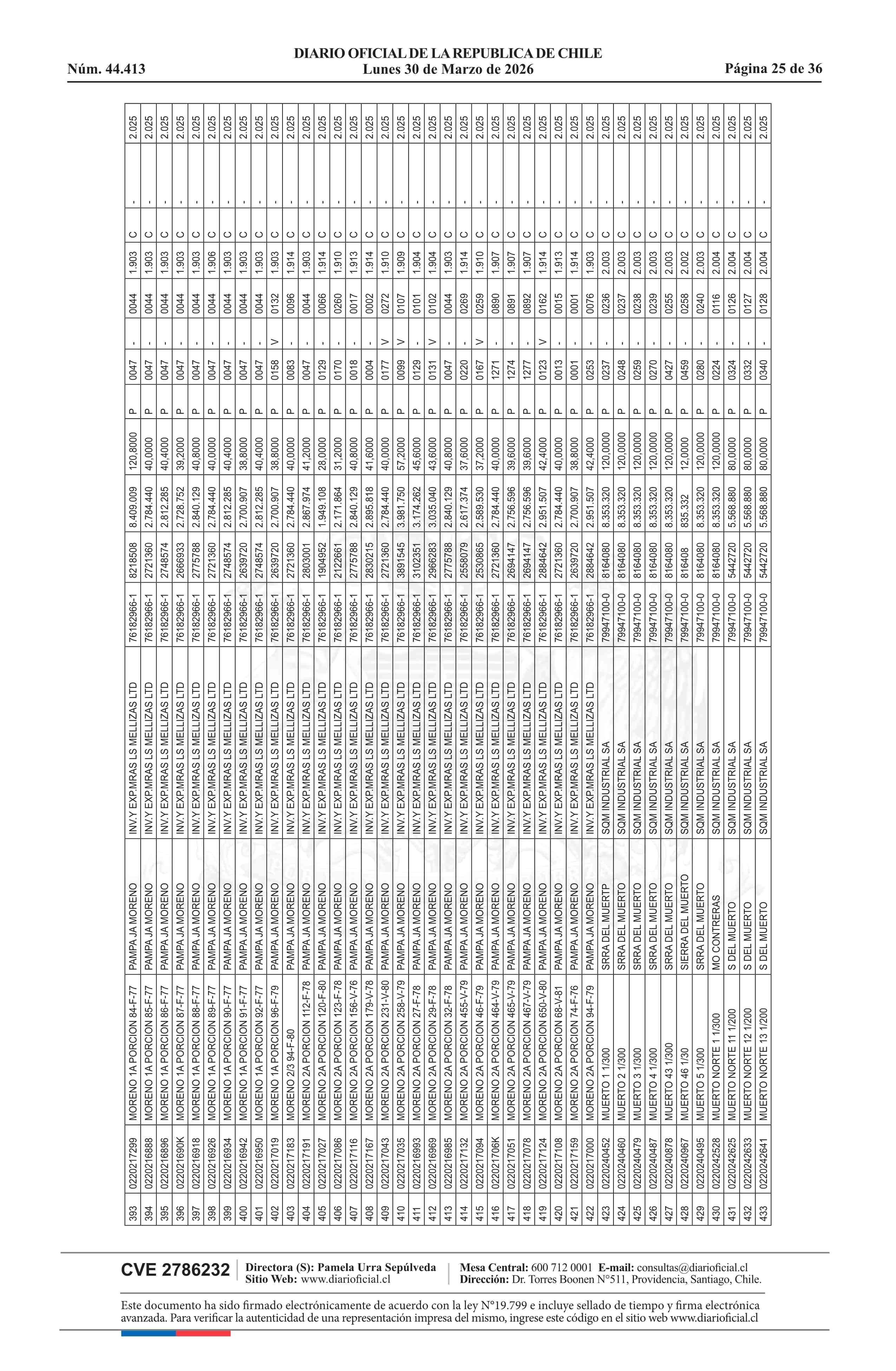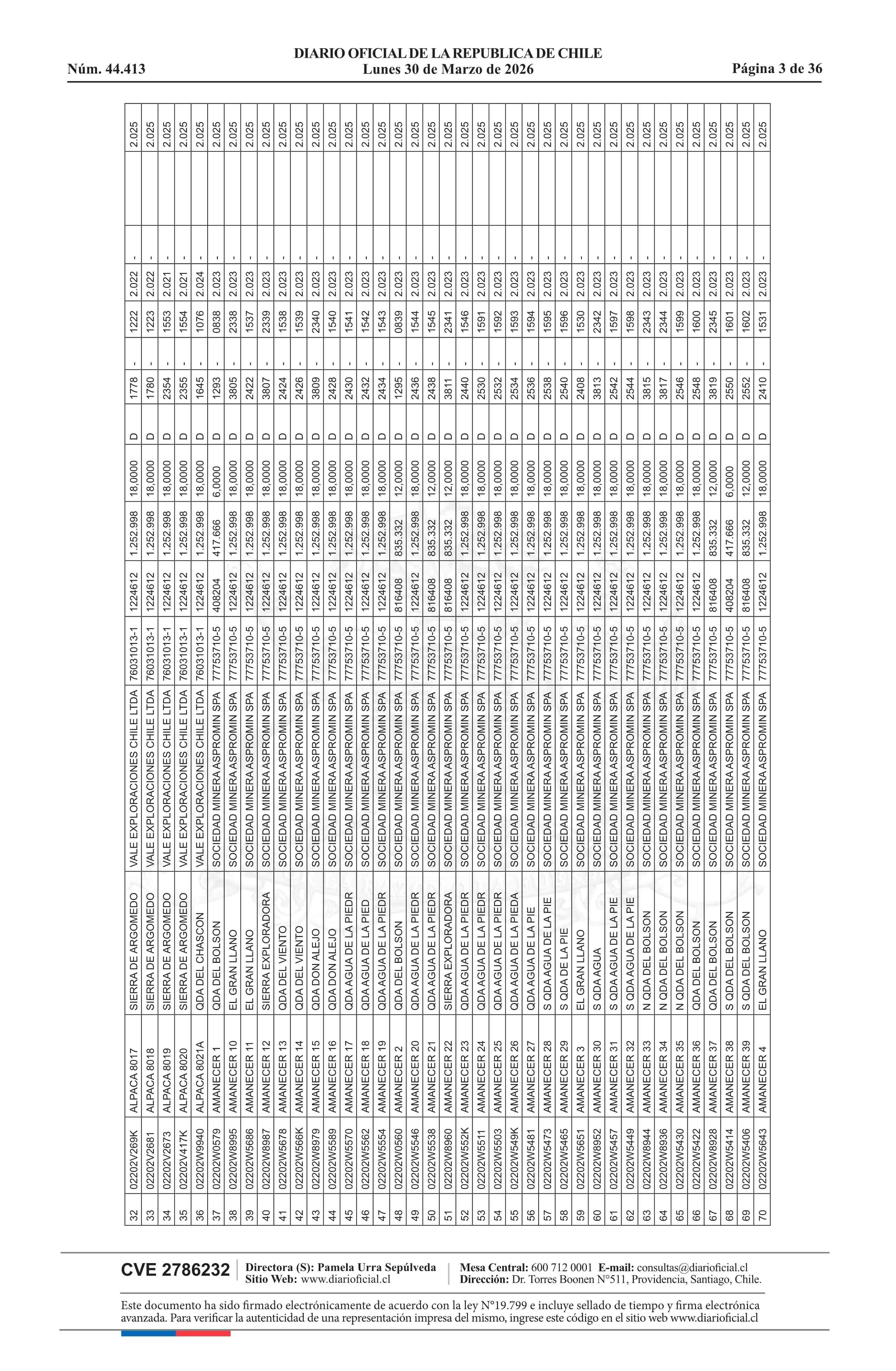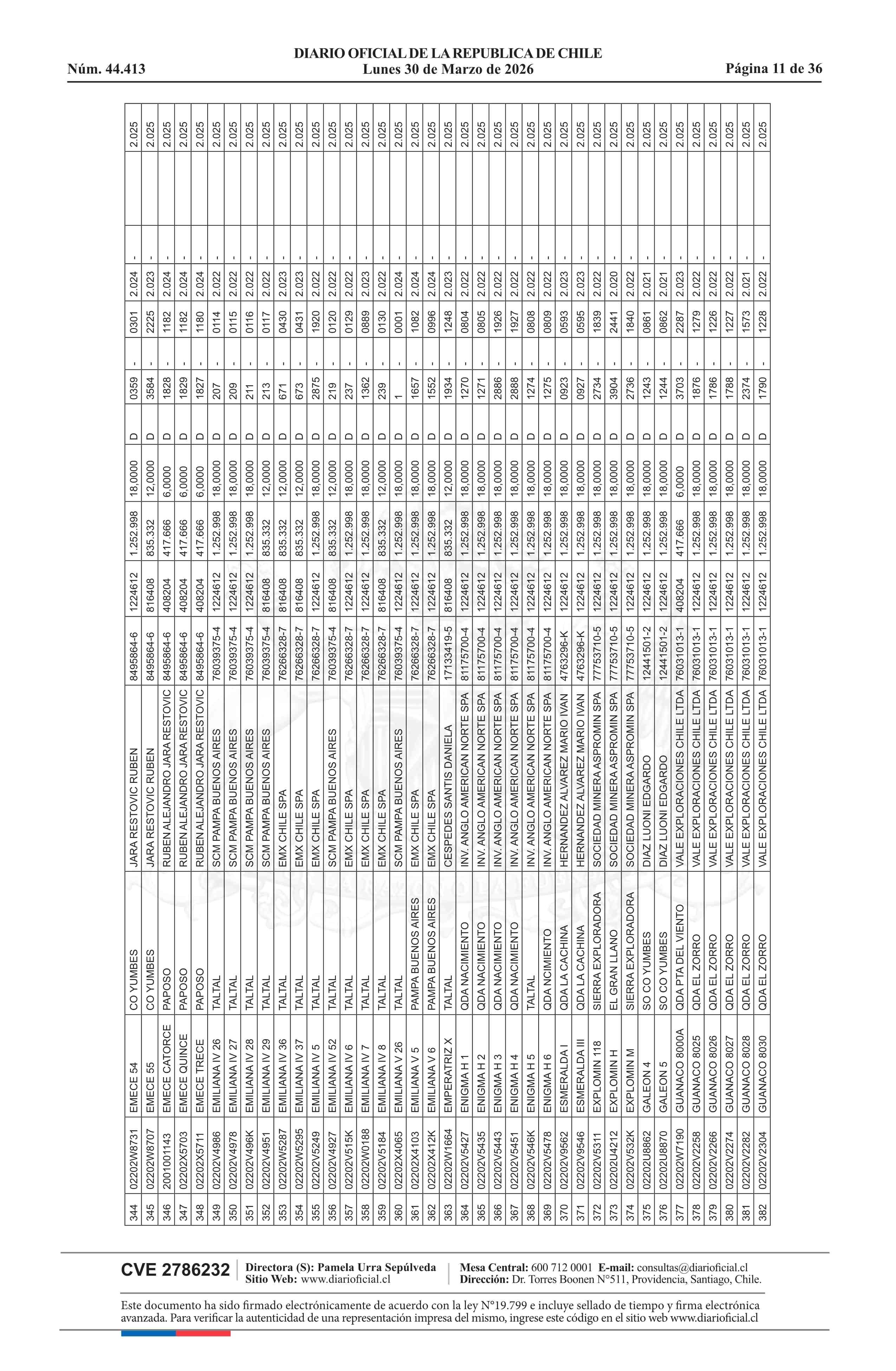 Fuente: DIARIO OFICIAL CHILE - BOLETÍN OFICIAL DE MINERÍA (DIARIO OFICIAL CHILE – BOM – NÓMINA REMATE) Página(s): 54-89