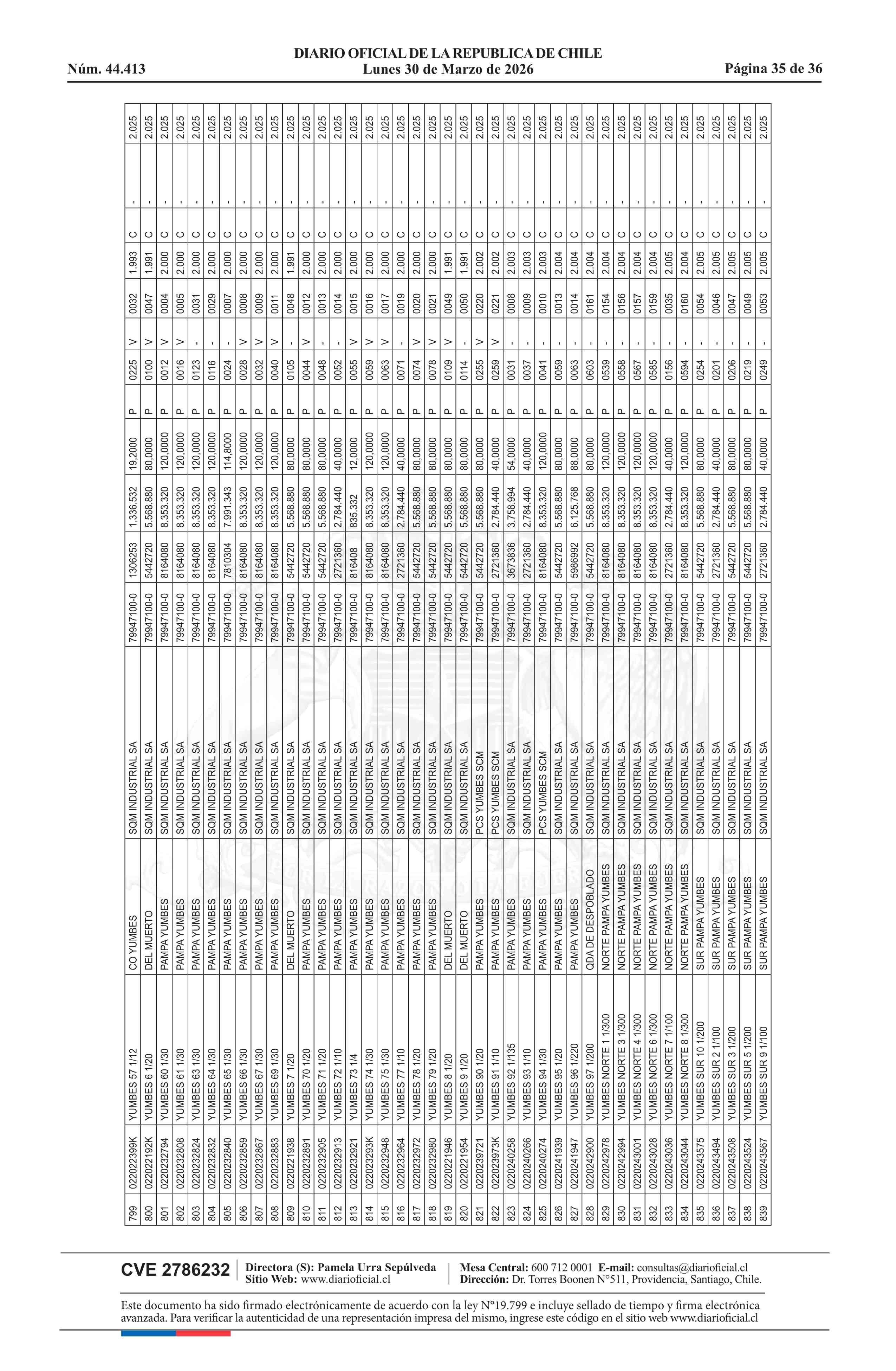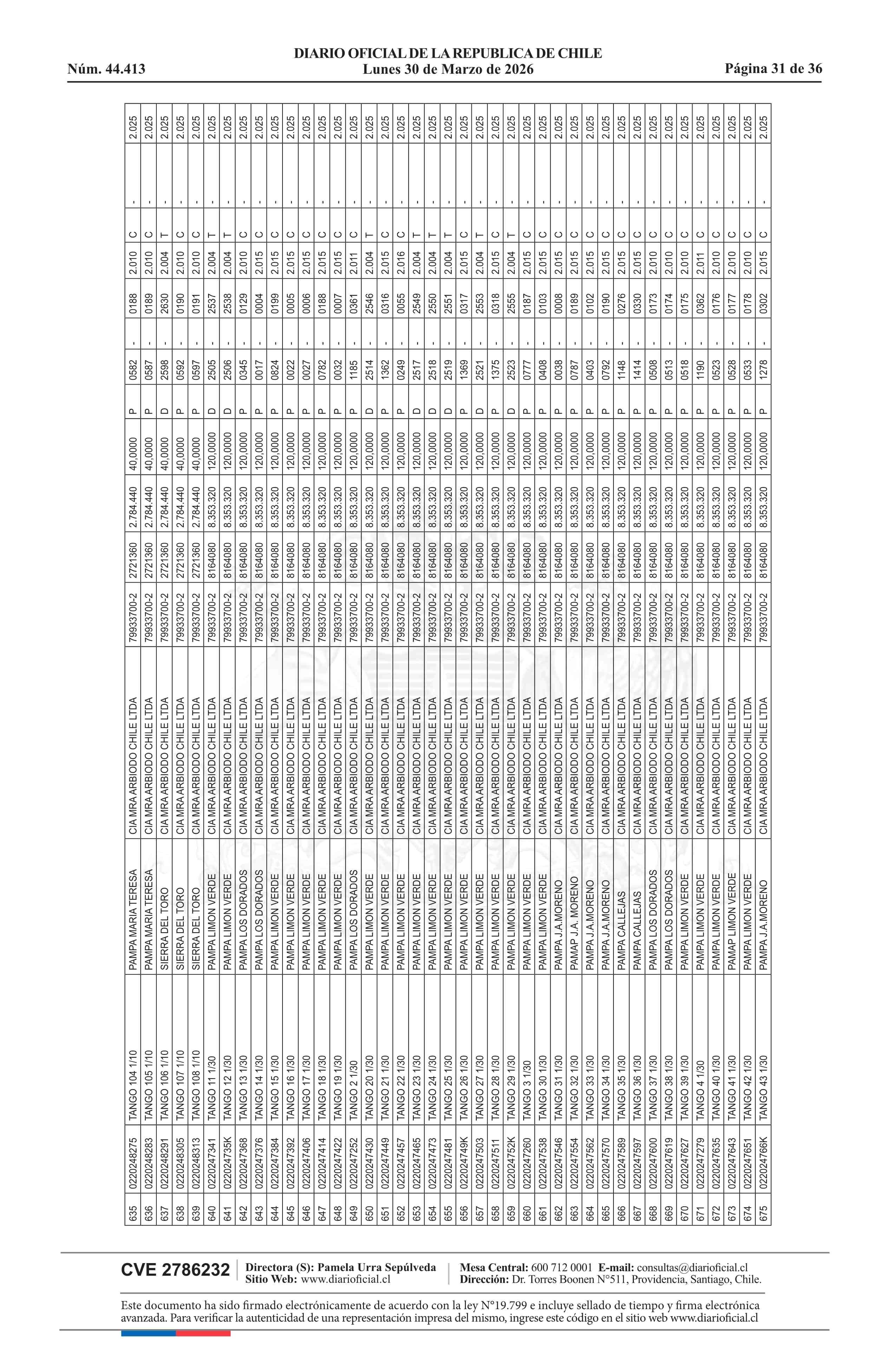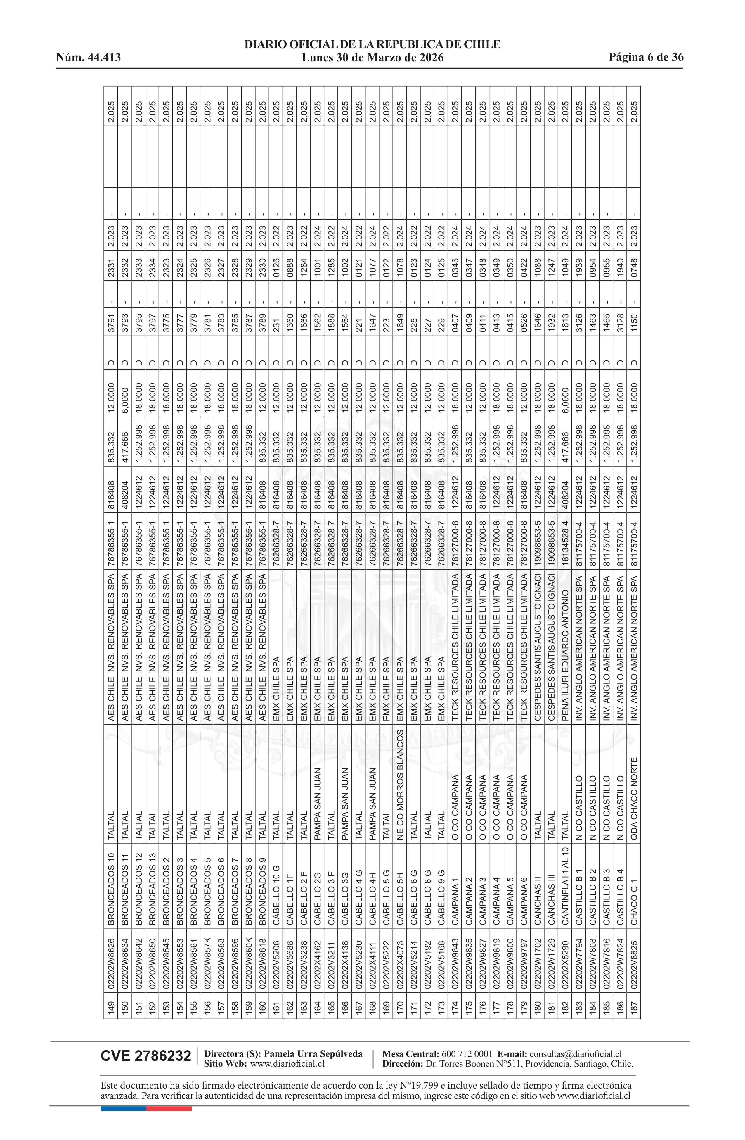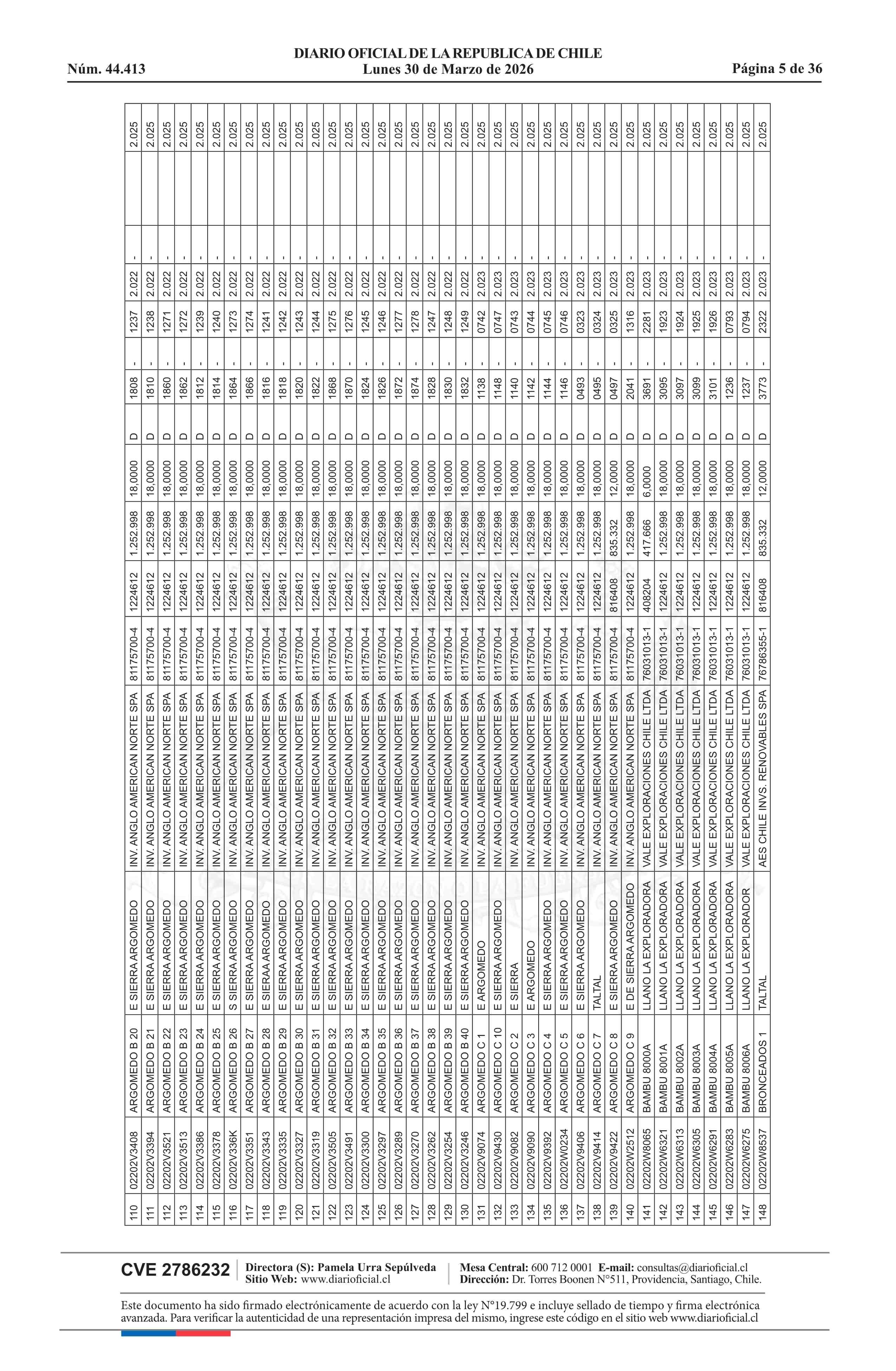 Fuente: DIARIO OFICIAL CHILE - BOLETÍN OFICIAL DE MINERÍA (DIARIO OFICIAL CHILE – BOM – NÓMINA REMATE) Página(s): 54-89