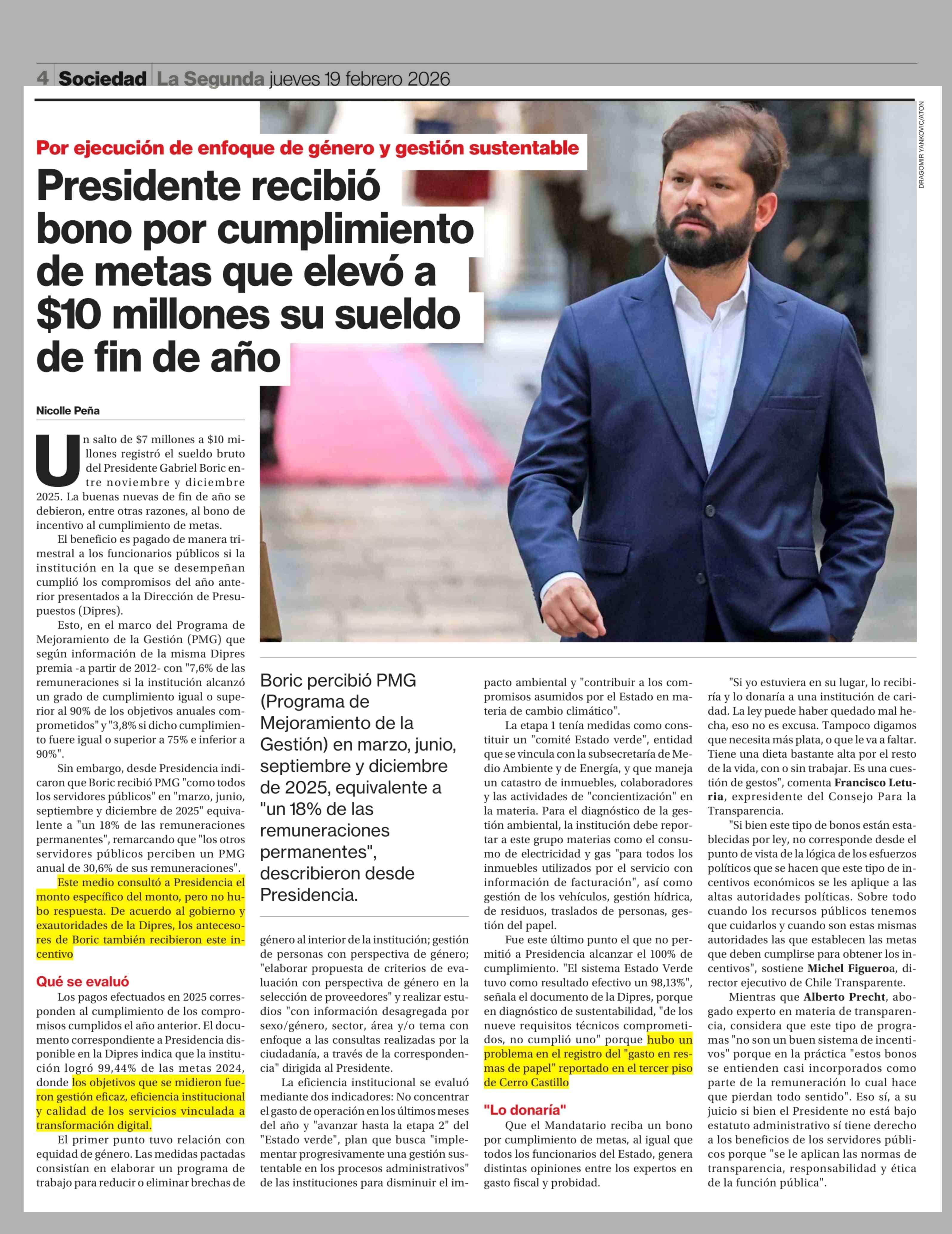 Presidente recibió bono por cumplimiento de metas que elevó a $10 millones su sueldo de fin de año 19-02-2026 La Segunda |