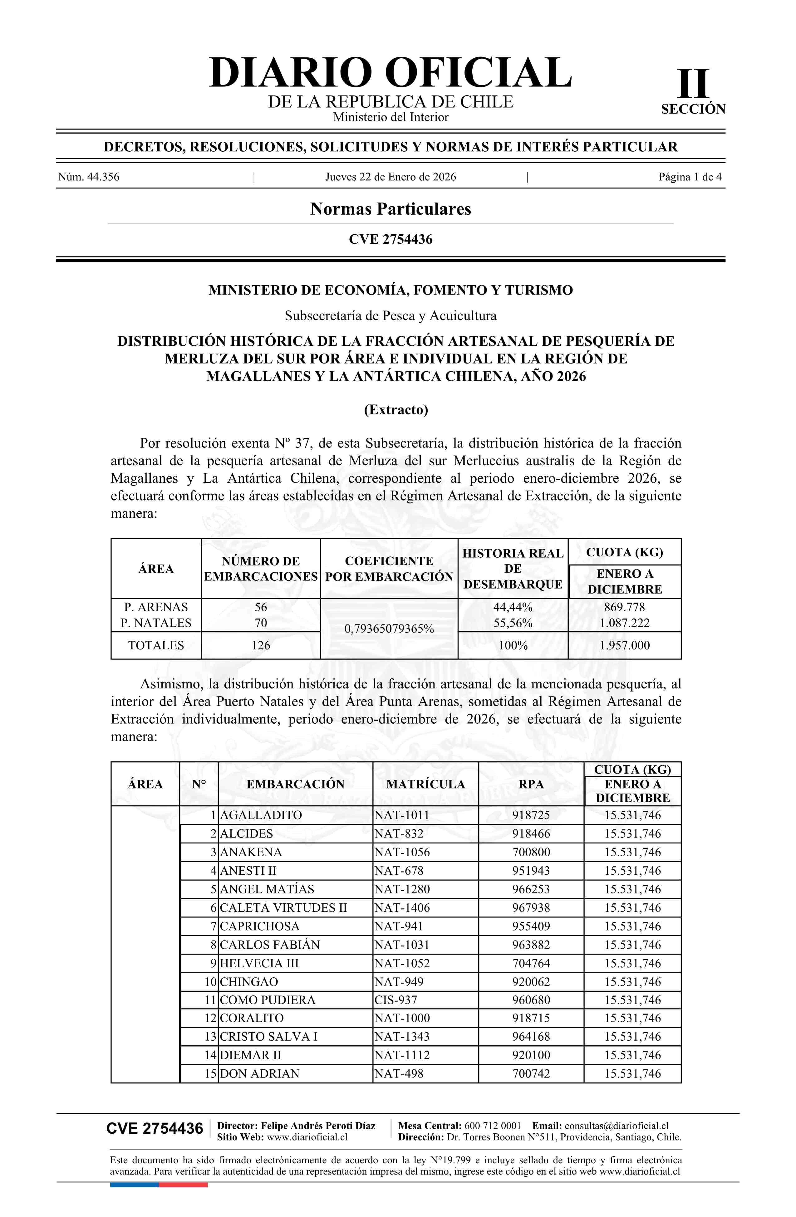 Título: Extracto de resolución exenta número 37, de 2026.- Establece distribución histórica de la fracción artesanal de pesquería de Merluza del sur por área e individual en la Región de Magallanes y la Antártica Chilena, año 2026