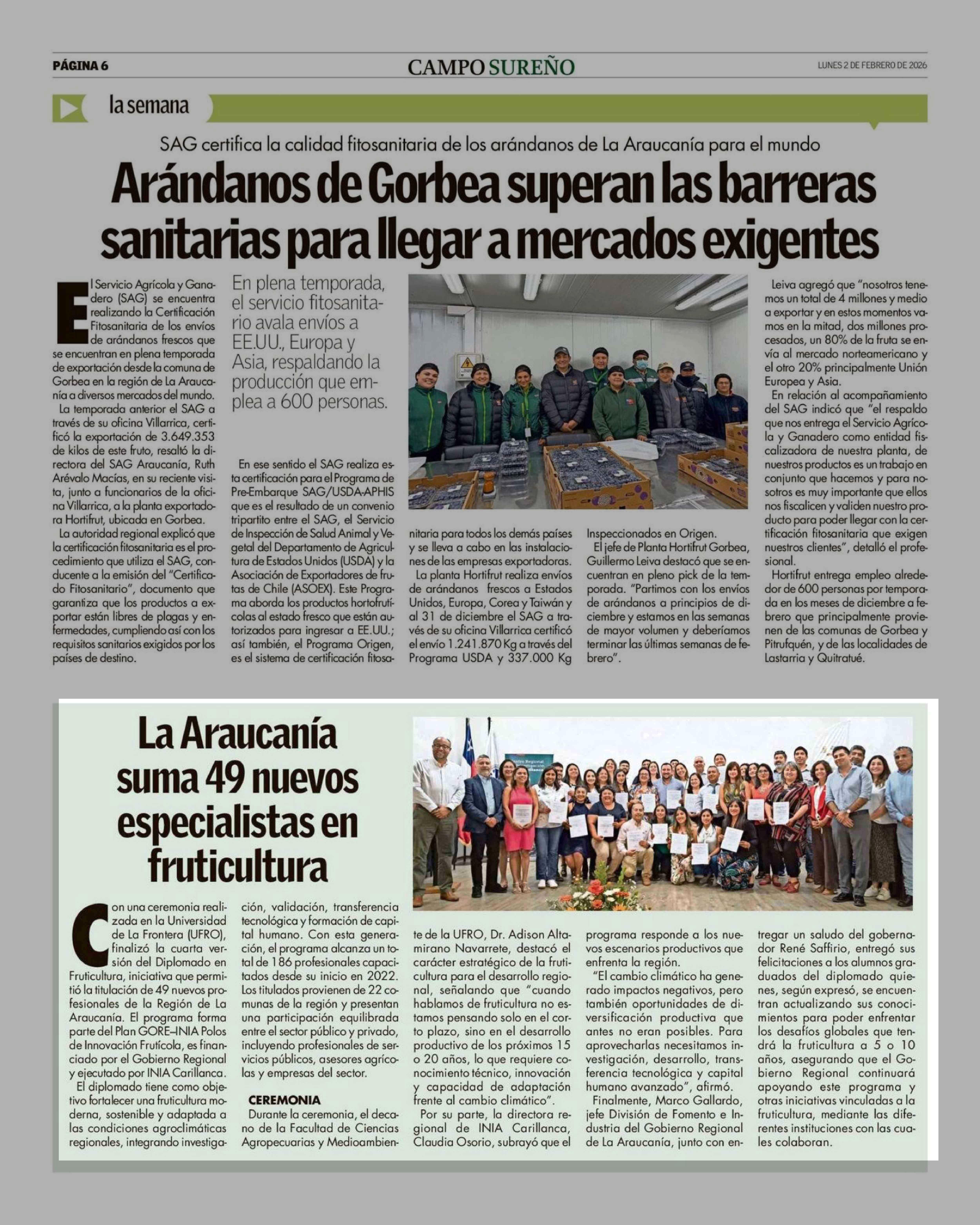 La Araucanía suma 49 nuevos especialistas en fruticultura 02-02-2026 Campo Sureño - Regiones IX, X y XIV |