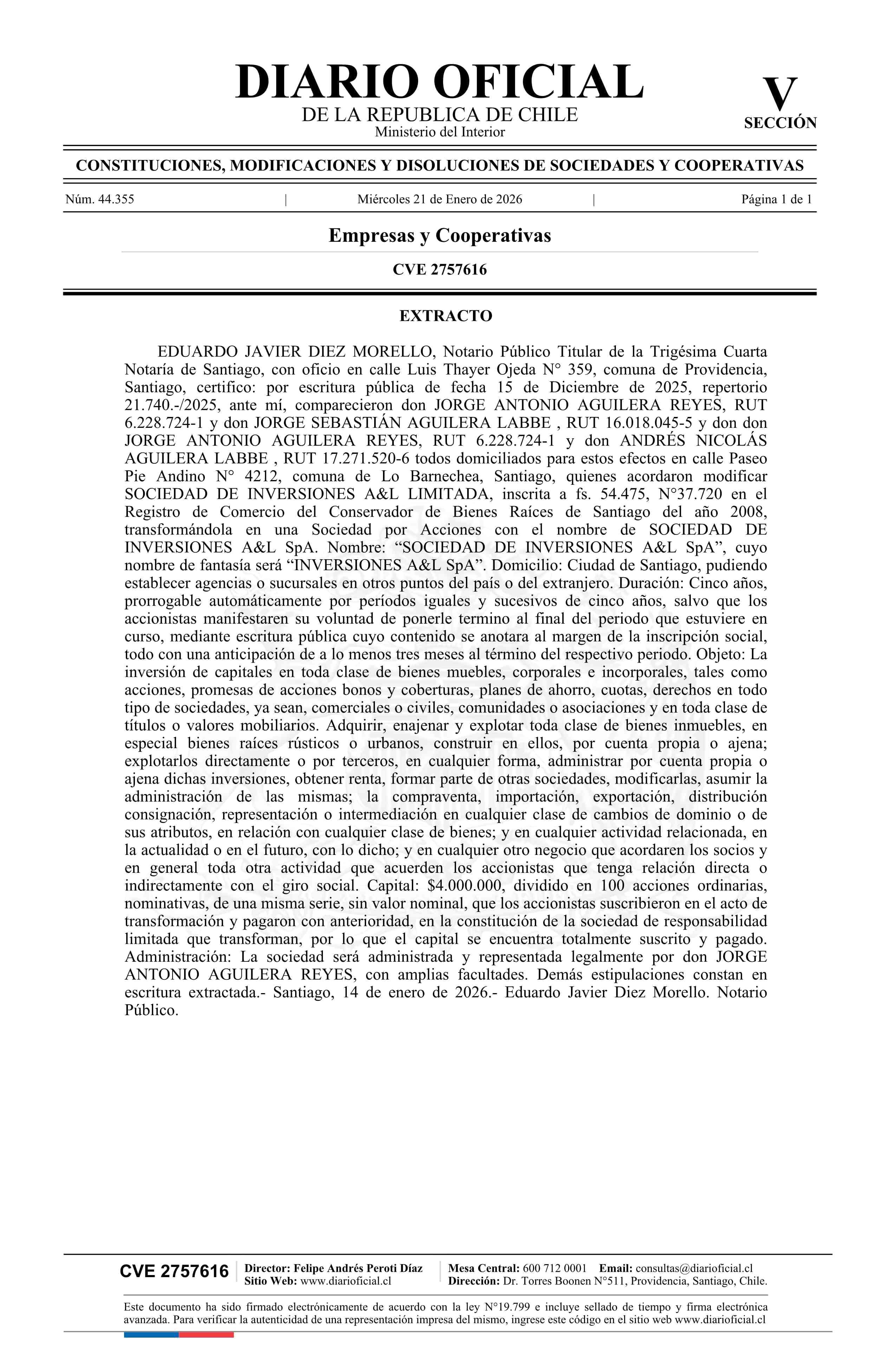 SOCIEDAD DE INVERSIONES A&L LIMITADA 76.042.007-7 21-01-2026 Diario Oficial Edición Electrónica |
