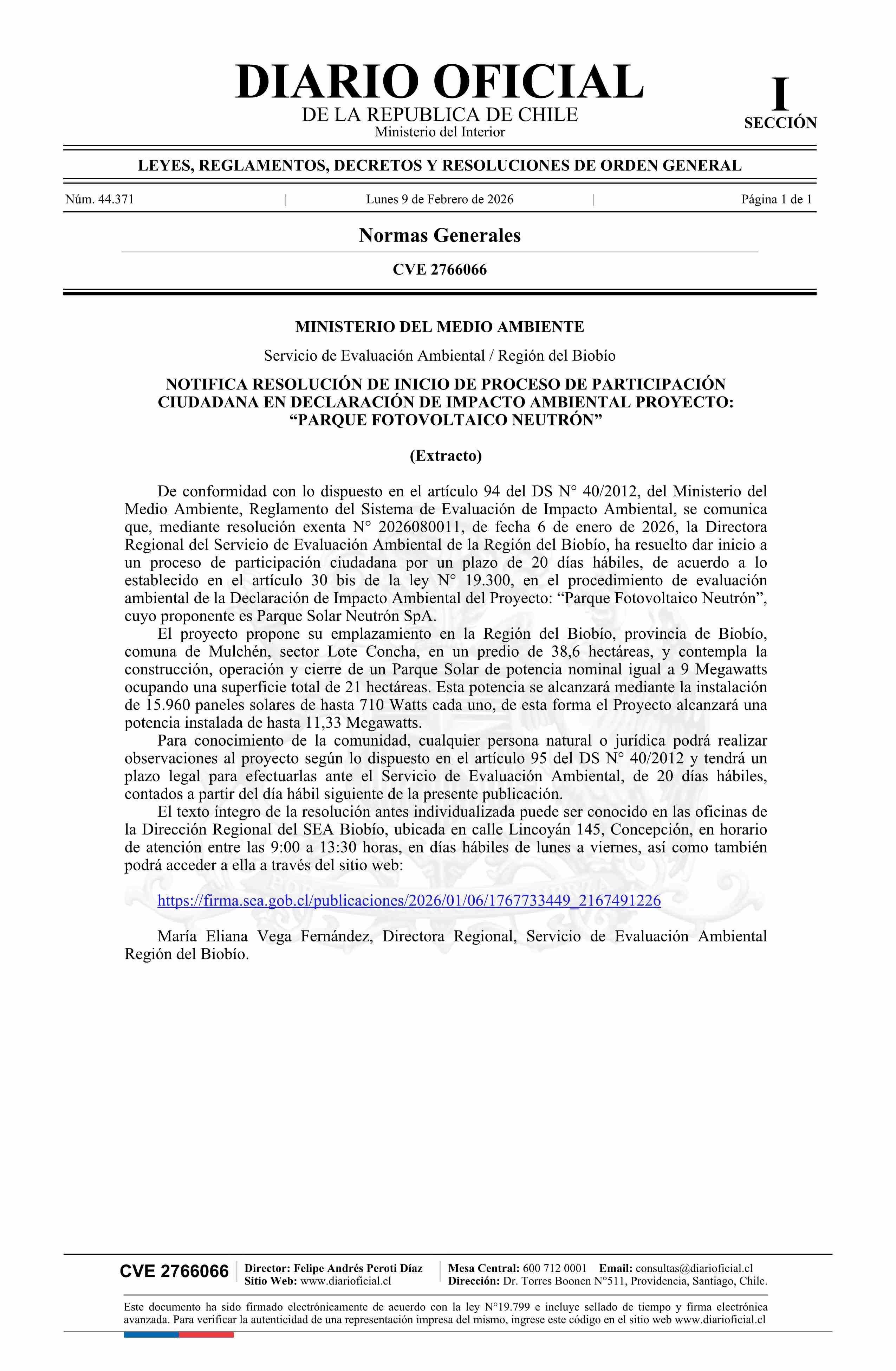 Título: Extracto de resolución exenta número 2026080011, de 2026.- Da inicio a proceso de participación ciudadana en Declaración de Impacto Ambiental del proyecto Parque Fotovoltaico Neutrón