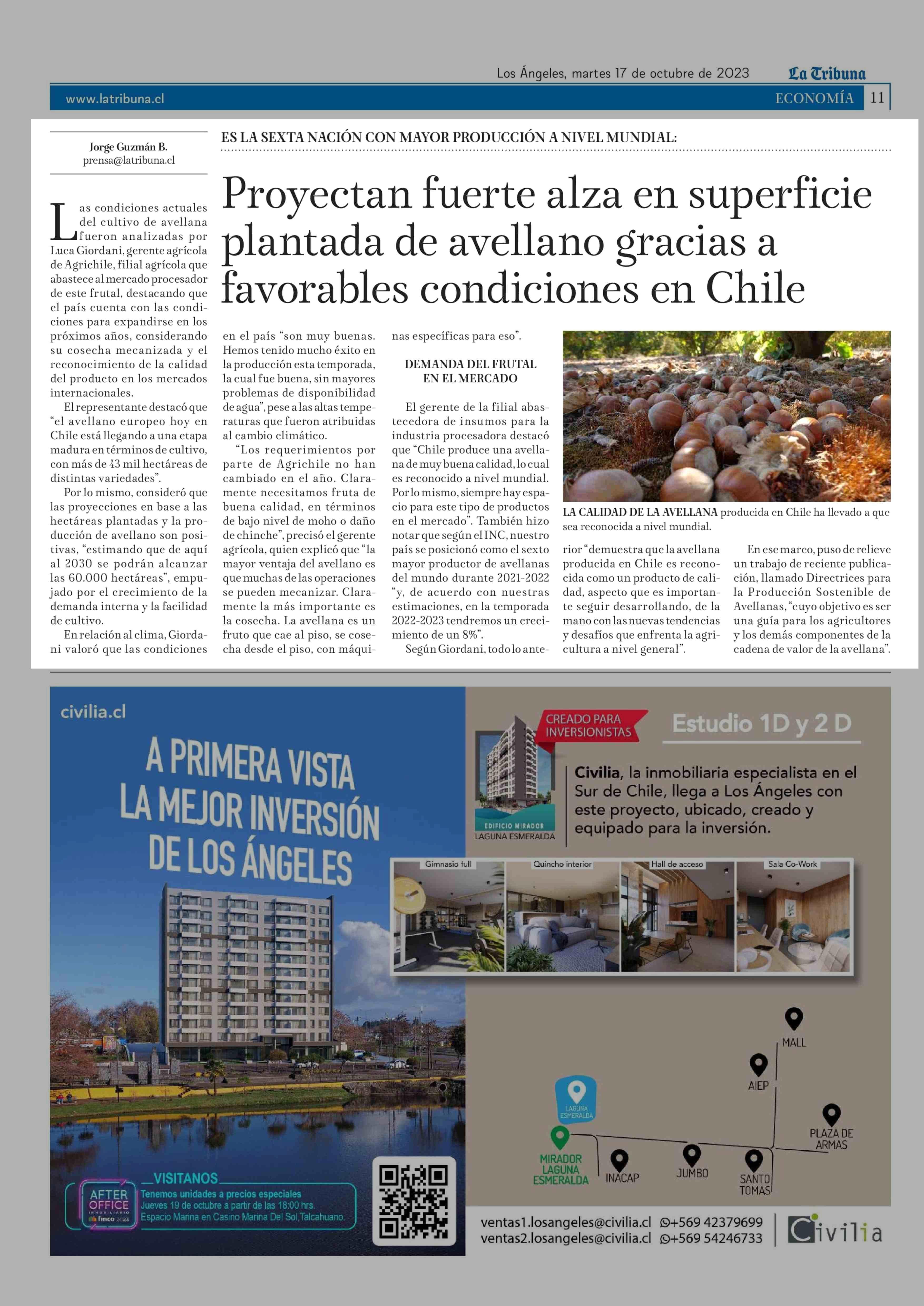Proyectan fuerte alza en superficie de avellano gracias a favorables condiciones en Chile 17-10-2023 La Tribuna |