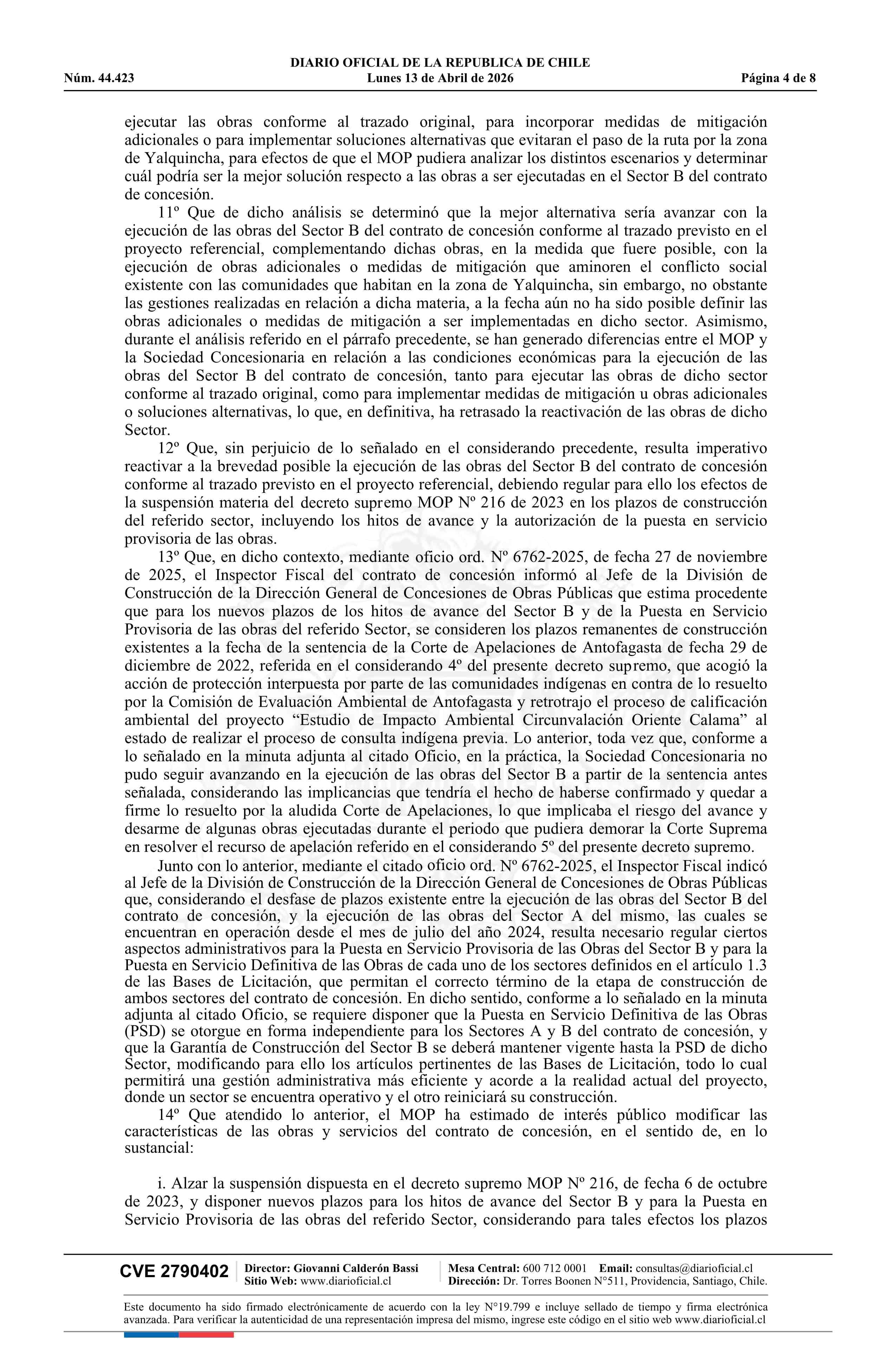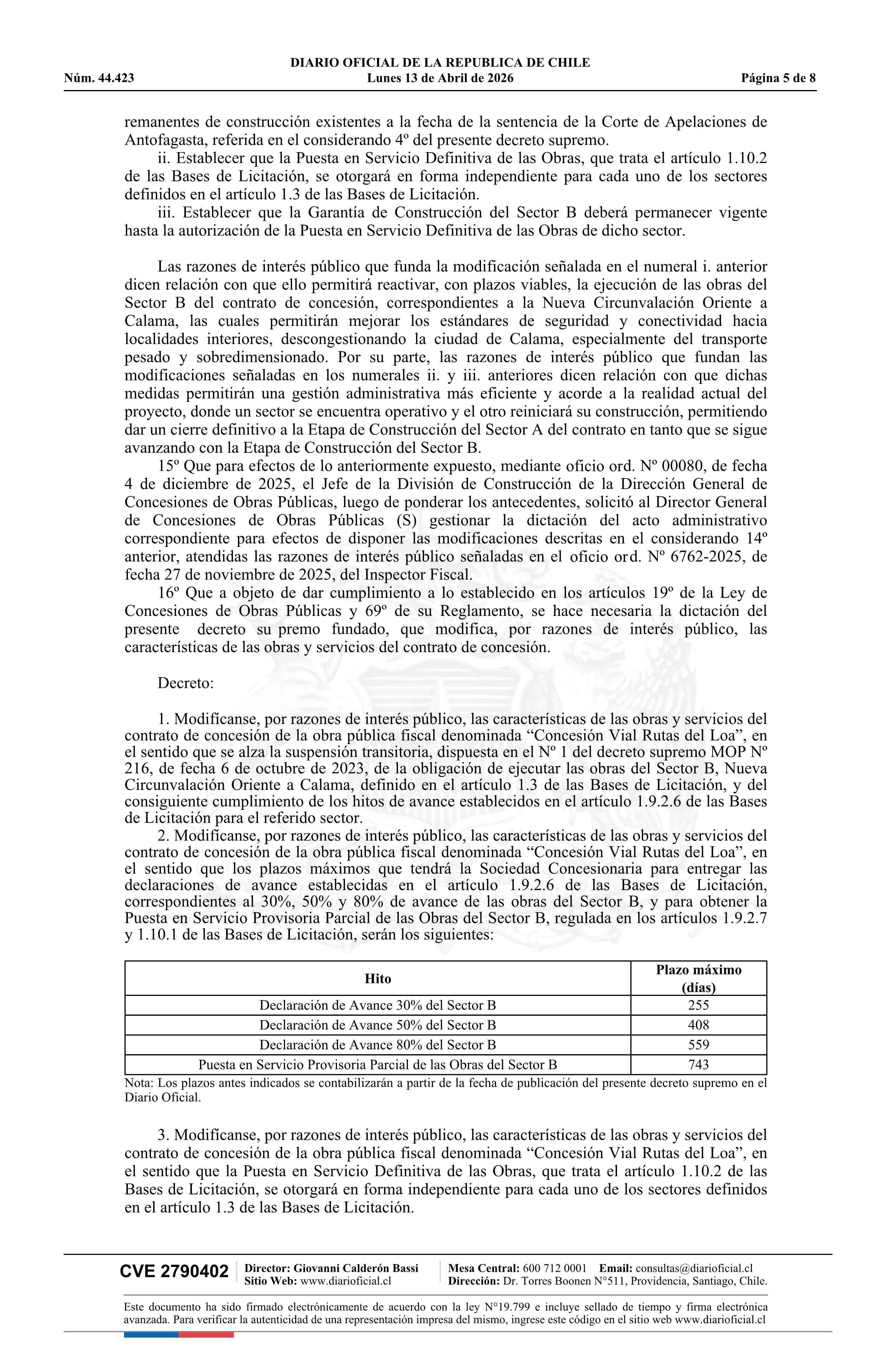 Título: Decreto número 13, de 2026.- Modifica, por razones de interés público, las características de las obras y servicios que indica del contrato de concesión de la obra pública fiscal denominada Concesión Vial Rutas del Loa