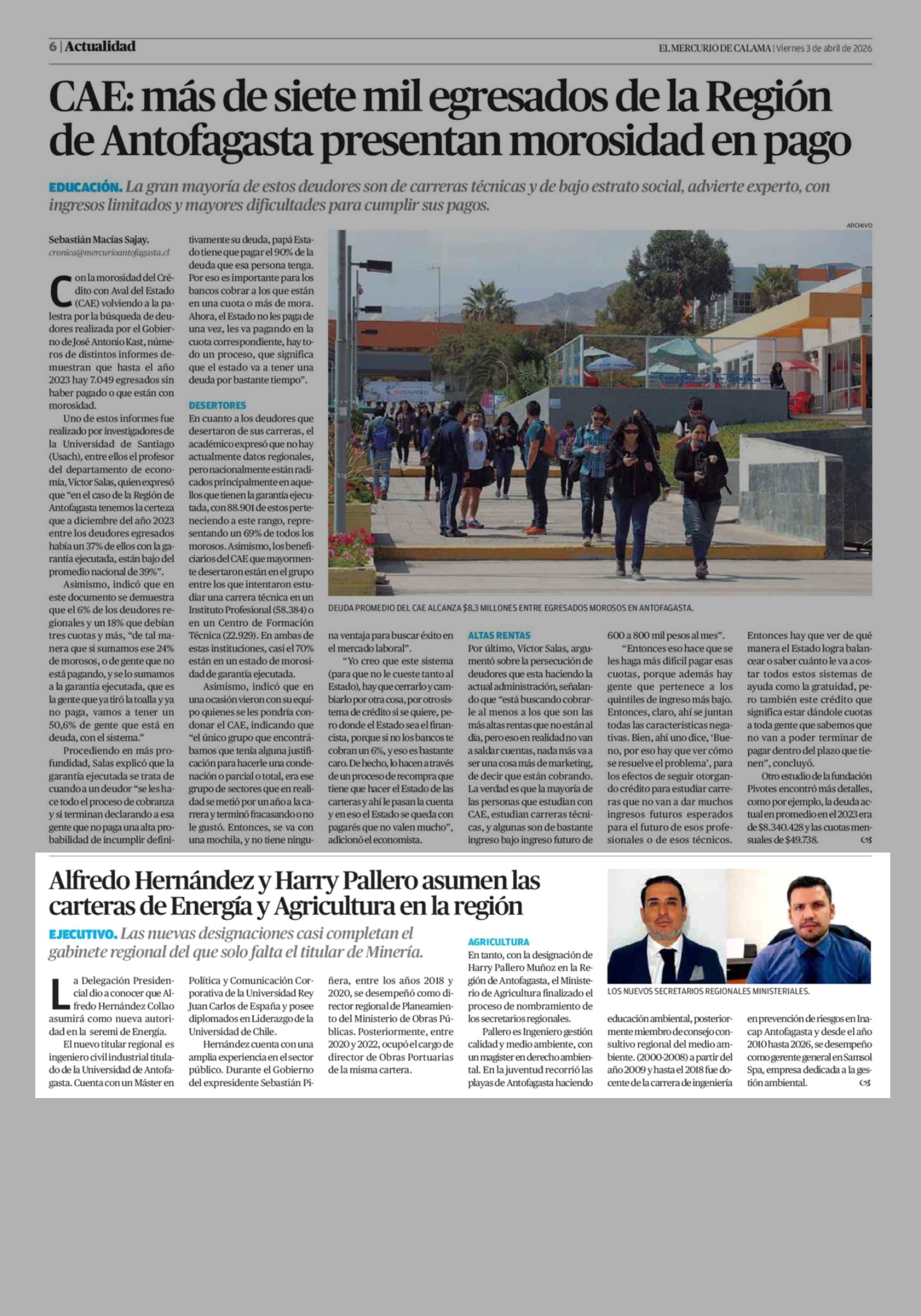 Alfredo Hernández y Harry Pallero asumen las carteras de Energía y Agricultura en la región 03-04-2026 El Mercurio de Calama |