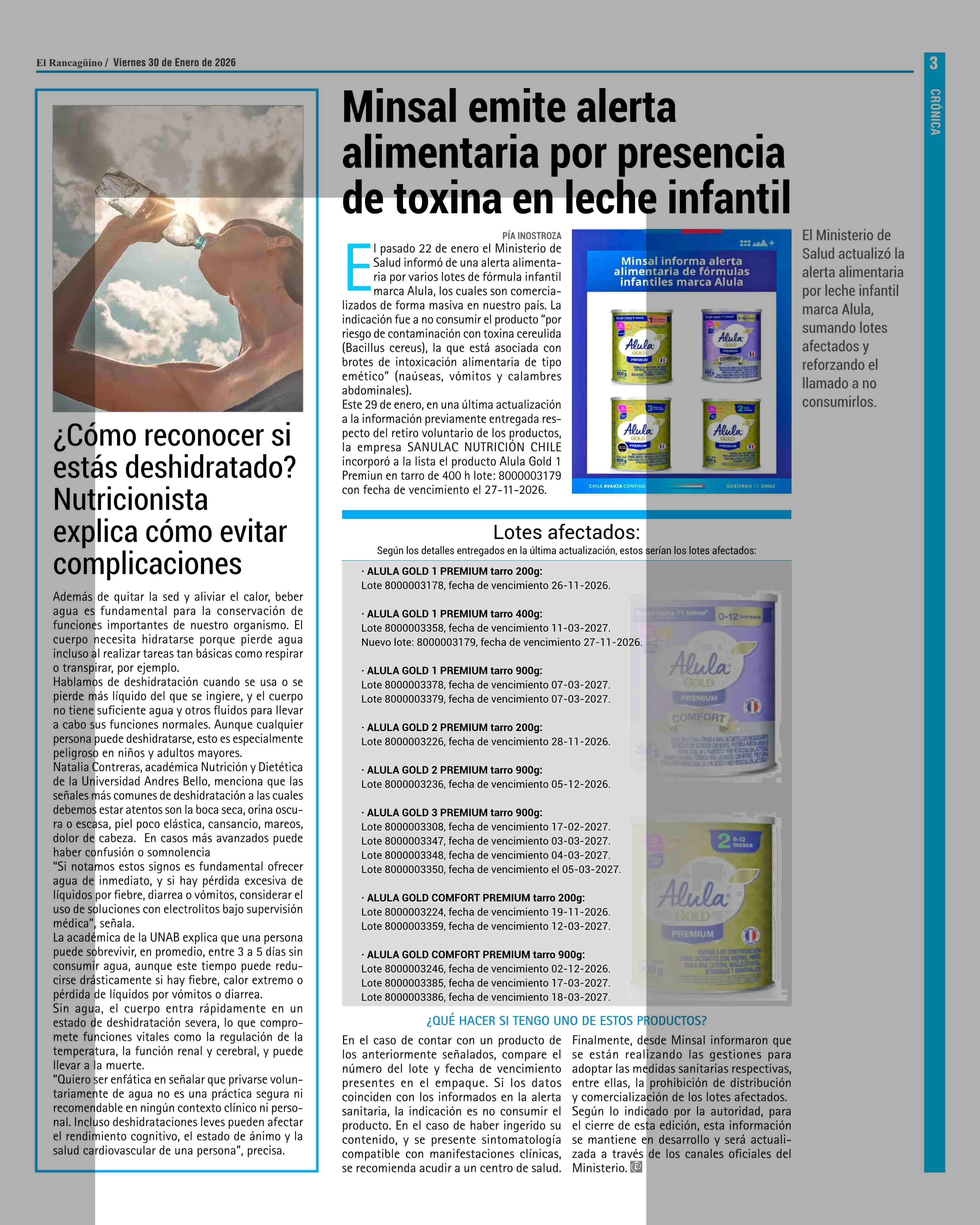 ¿Cómo reconocer si estás deshidratado? Nutricionista explica cómo evitar complicaciones 30-01-2026 El Rancagüino |
