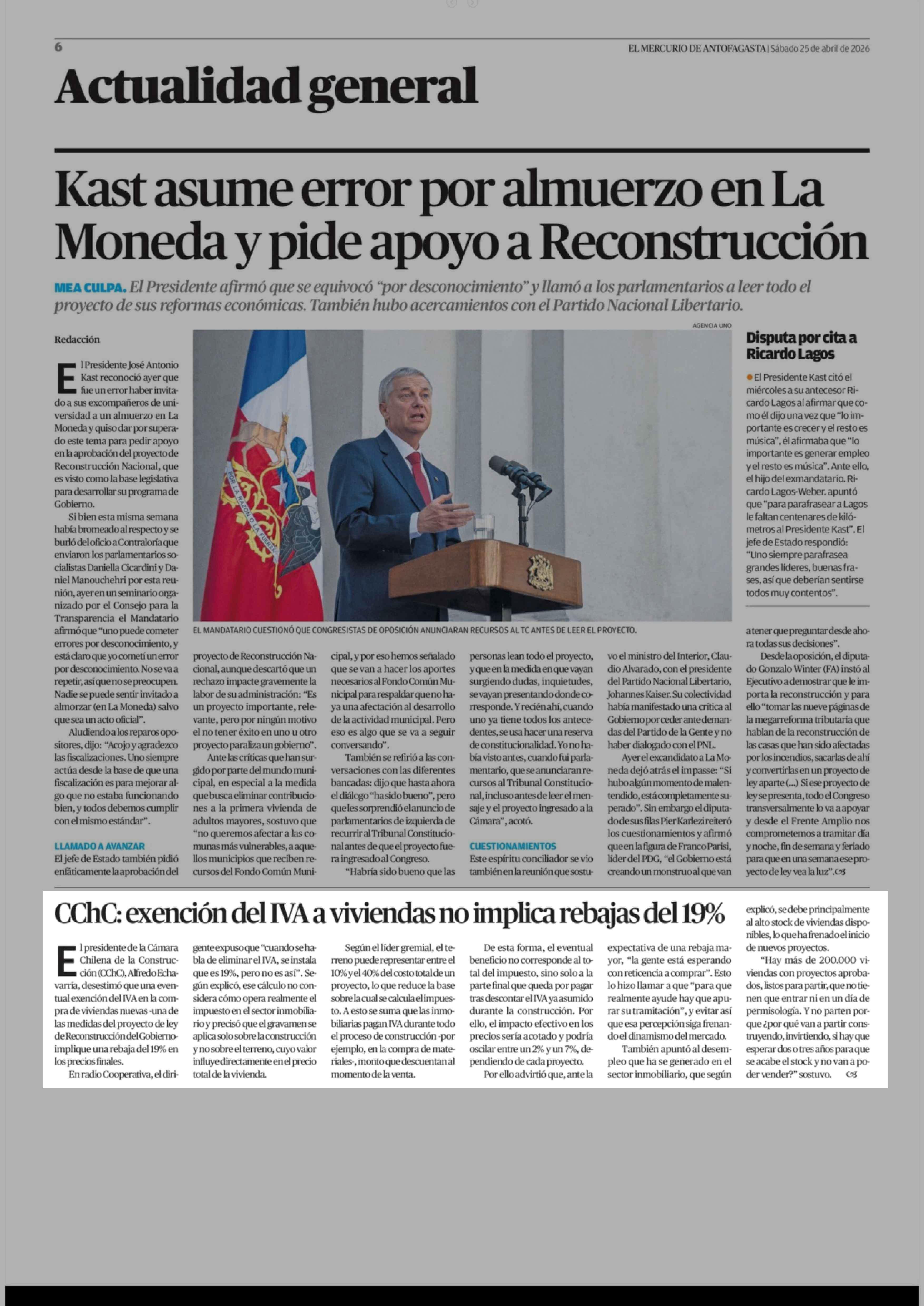 CChC: exención del IVA a viviendas no implica rebajas del 19% 25-04-2026 El Mercurio de Antofagasta |