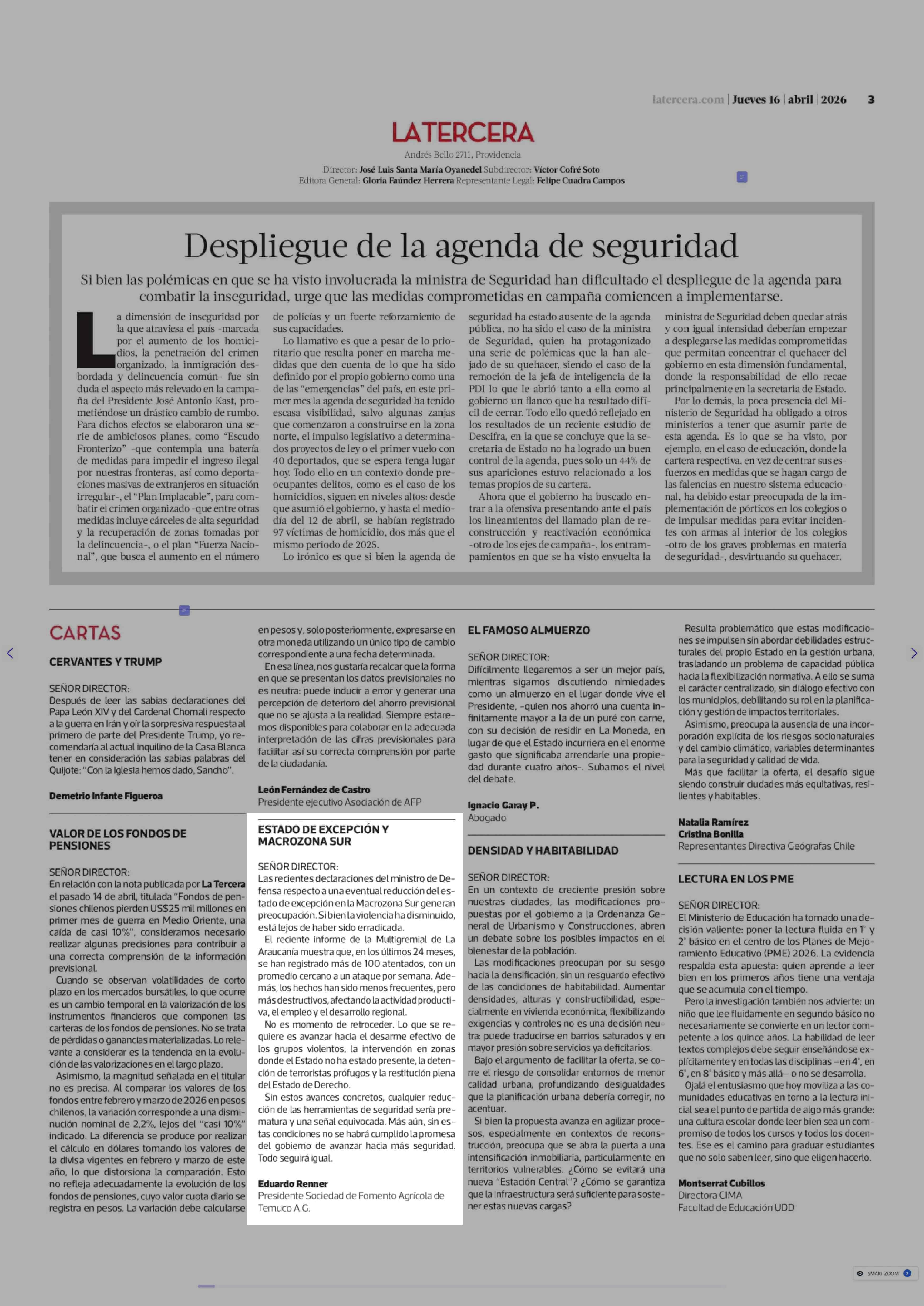 Cartas: ESTADO DE EXCEPCIÓN Y MACROZONA SUR 16-04-2026 La Tercera |