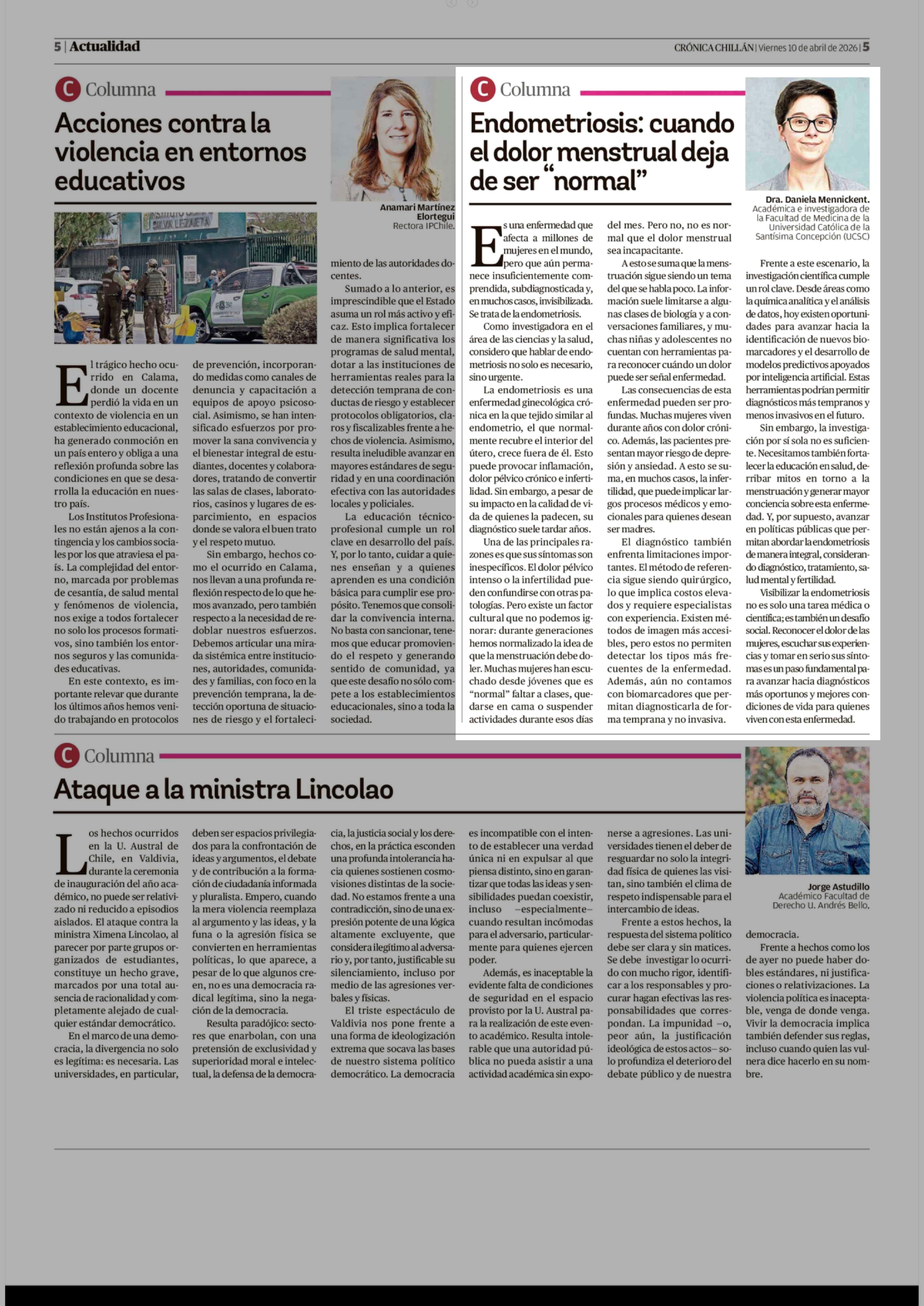 Columnas de Opinión: Endometriosis: cuando el dolor menstrual deja de ser "normal" 10-04-2026 Crónica de Chillán |