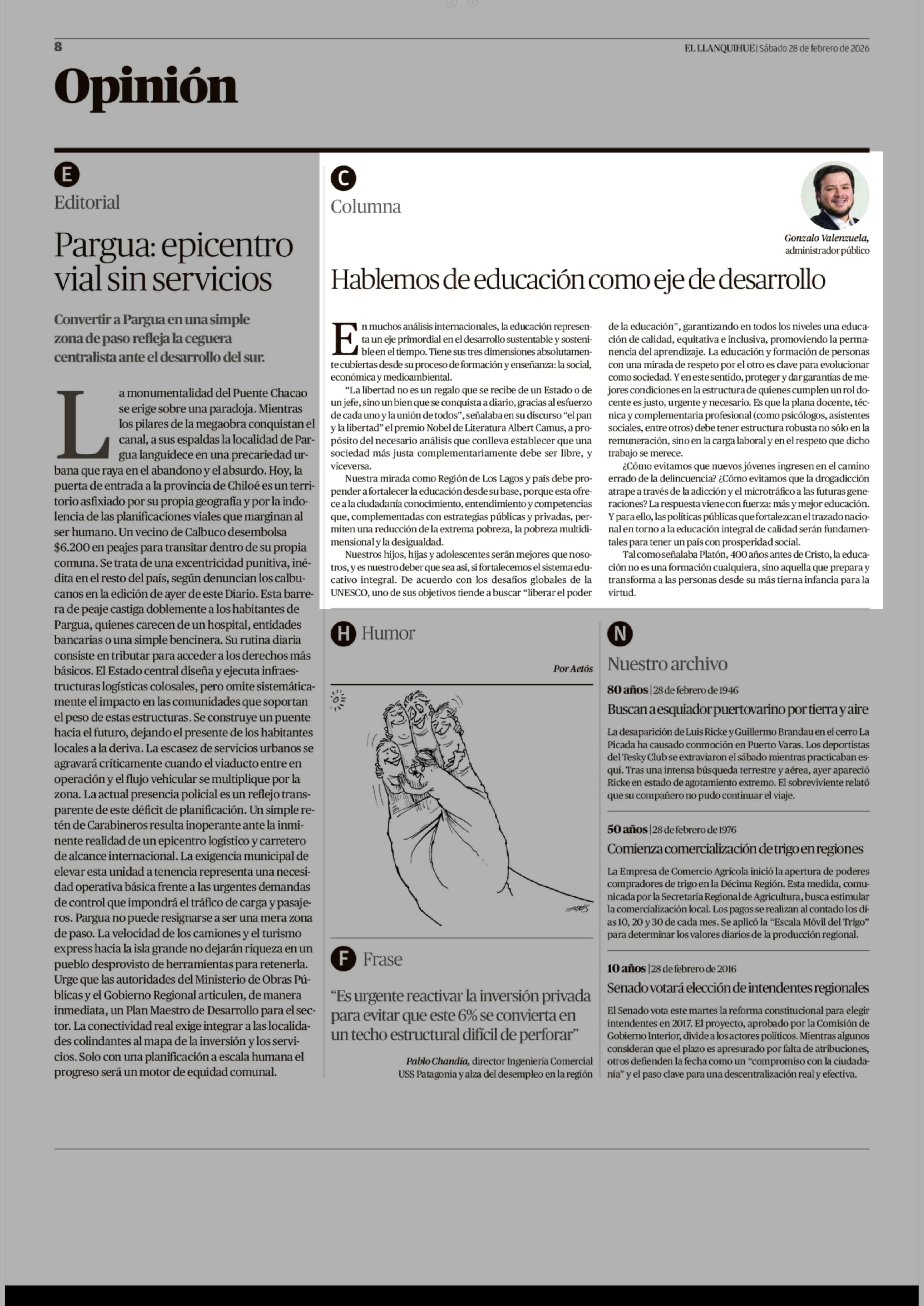 Columnas de Opinión: Hablemos de educación como eje de desarrollo 28-02-2026 El Llanquihue |