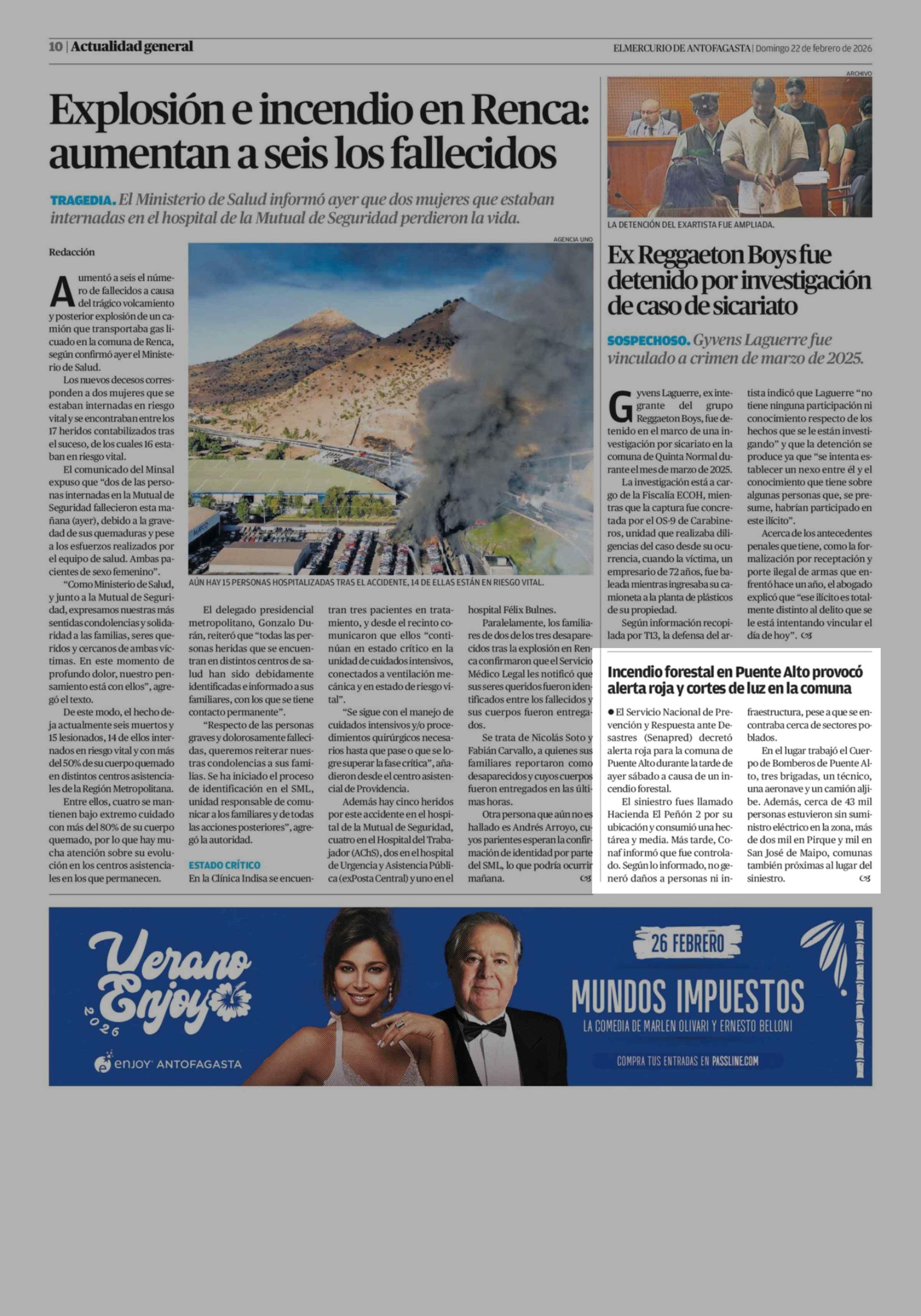 Incendio forestal en Puente Alto provocó alerta roja y cortes de luz en la comuna 22-02-2026 El Mercurio de Antofagasta |