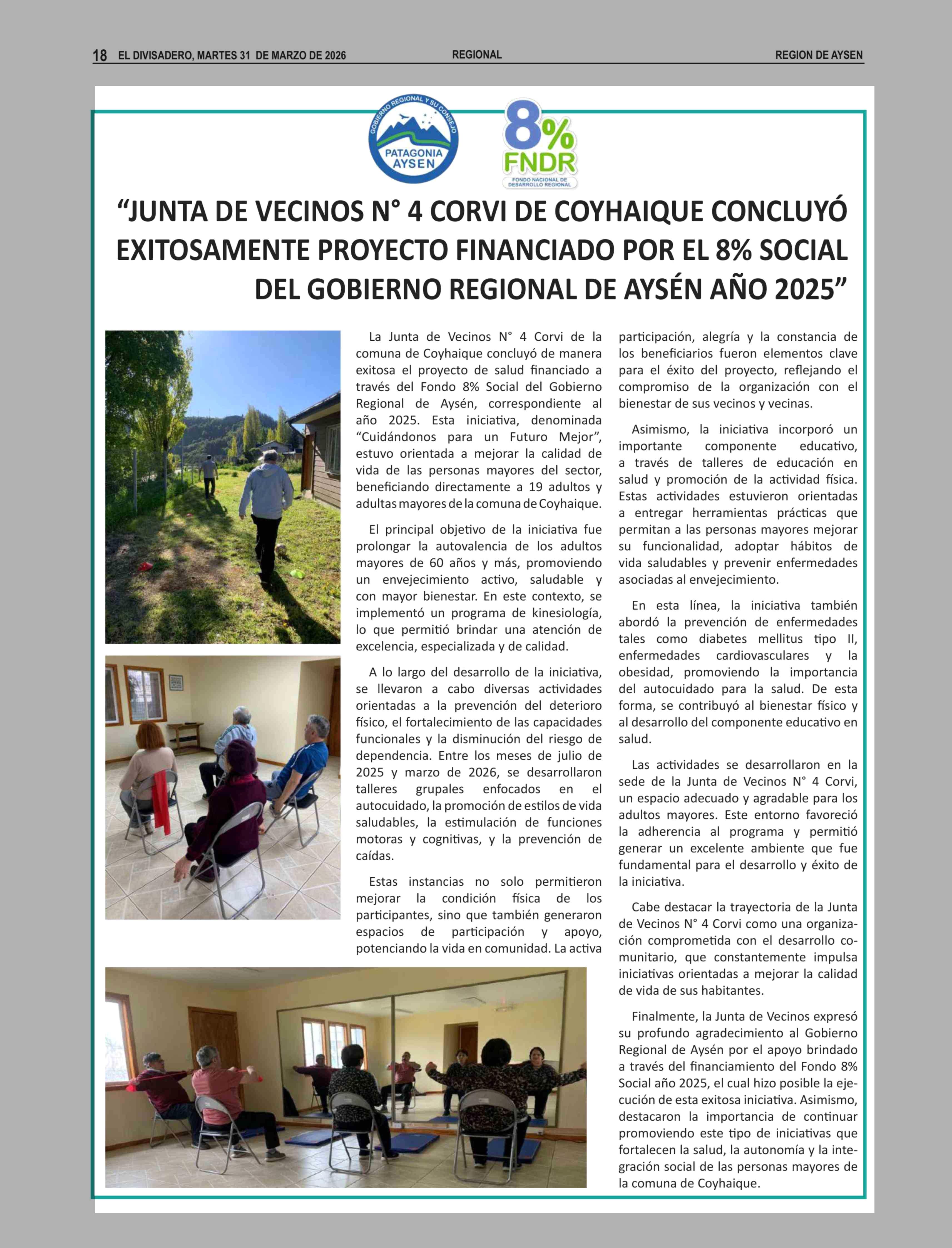 "JUNTA DE VECINOS Nº 4 CORVI DE COYHAIQUE CONCLUYÓ EXITOSAMENTE PROYECTO FINANCIADO POR EL 8% SOCIAL DEL GOBIERNO REGIONAL DE AYSÉN AÑO 2025" 31-03-2026 El Divisadero |