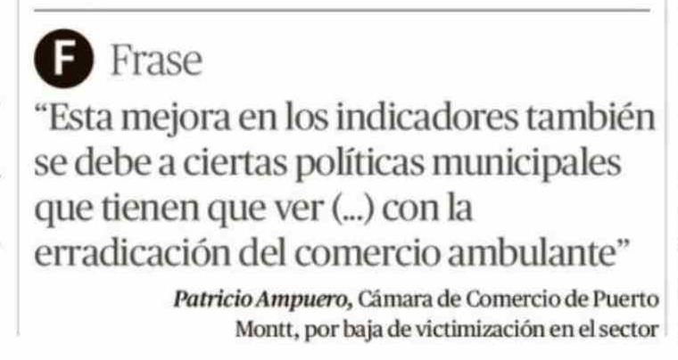 | Título: | F Frase "Esta mejora en los indicadores también se debe a ciertas políticas municipales que tienen que ver ( ... ) con la erradicación del comercio ambulante" Patricio Ampuero, Cámara de Comercio de Puerto |