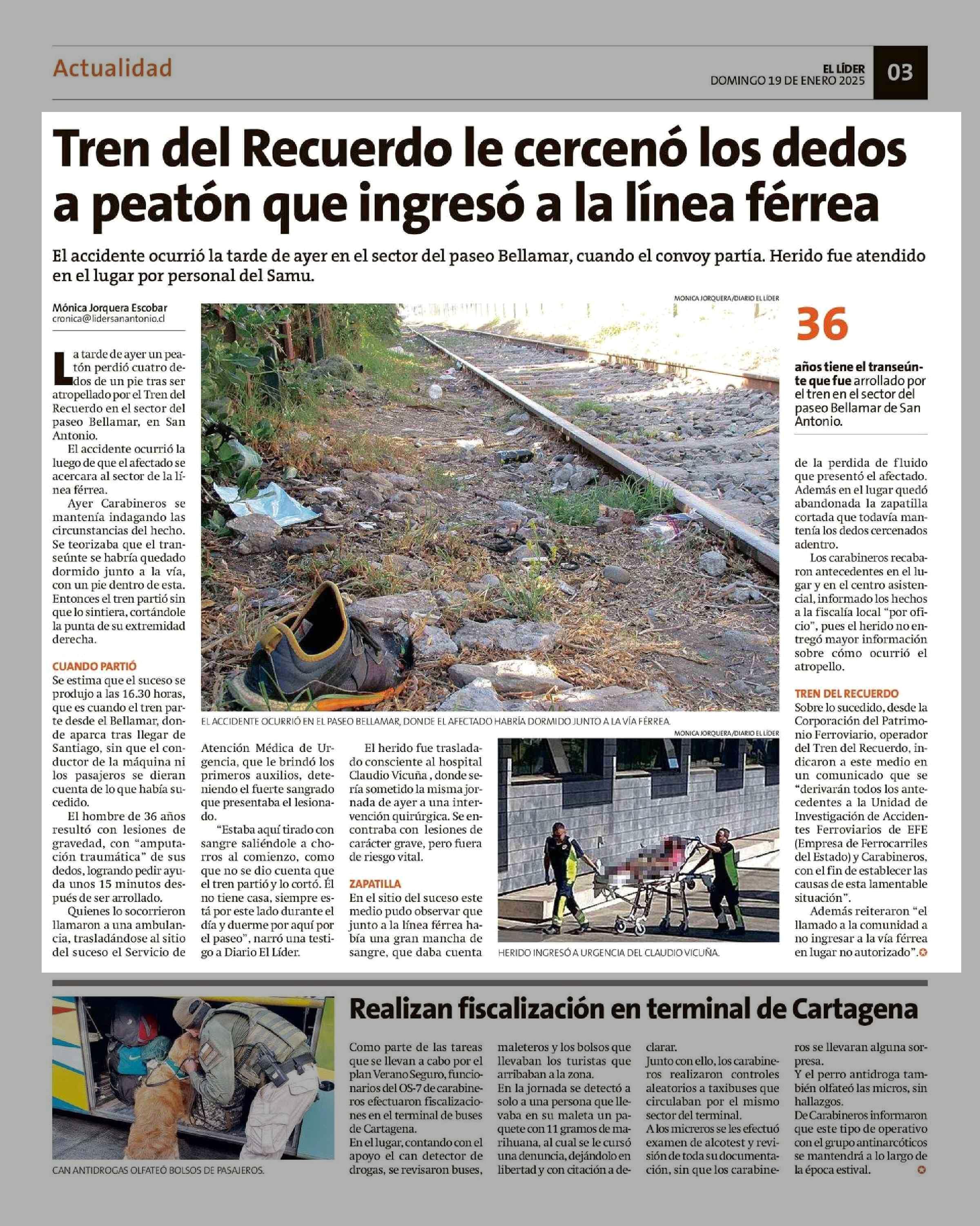 Tren del Recuerdo le cercenó los dedos a peatón que ingresó a la linea férrea 19-01-2025 El Líder |