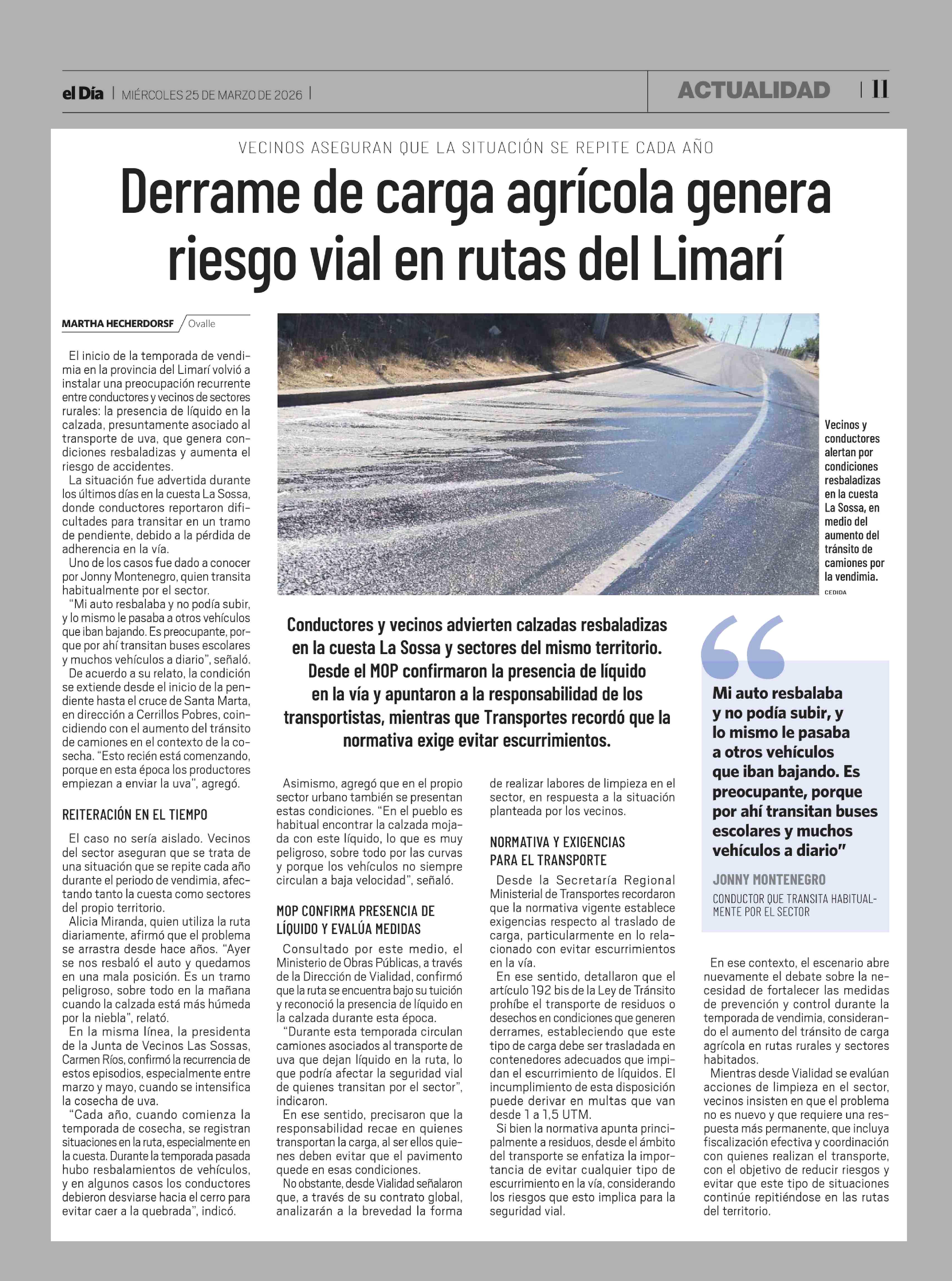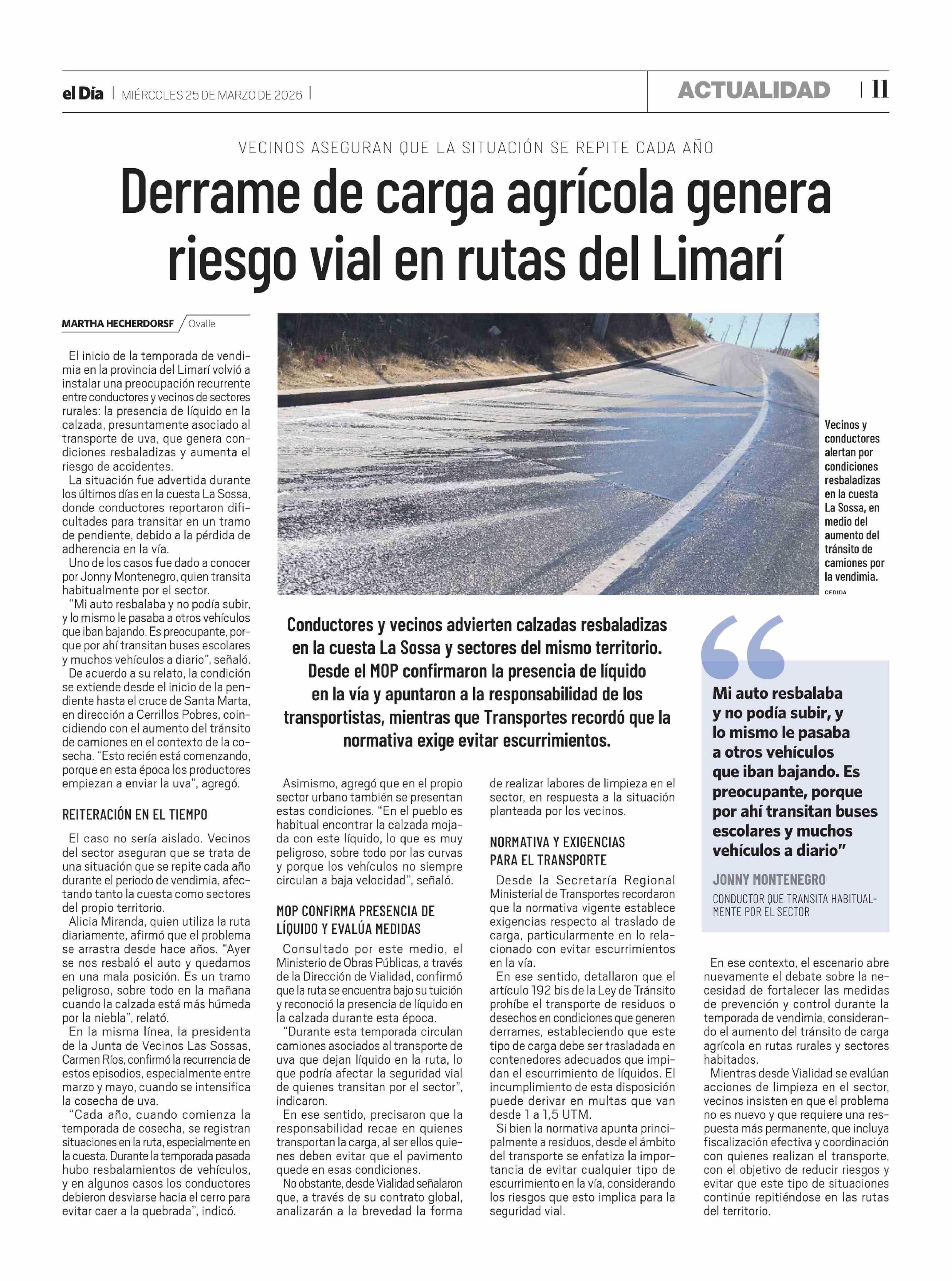 Título: Derrame de carga agrícola genera riesgo vial en rutas del Limarí