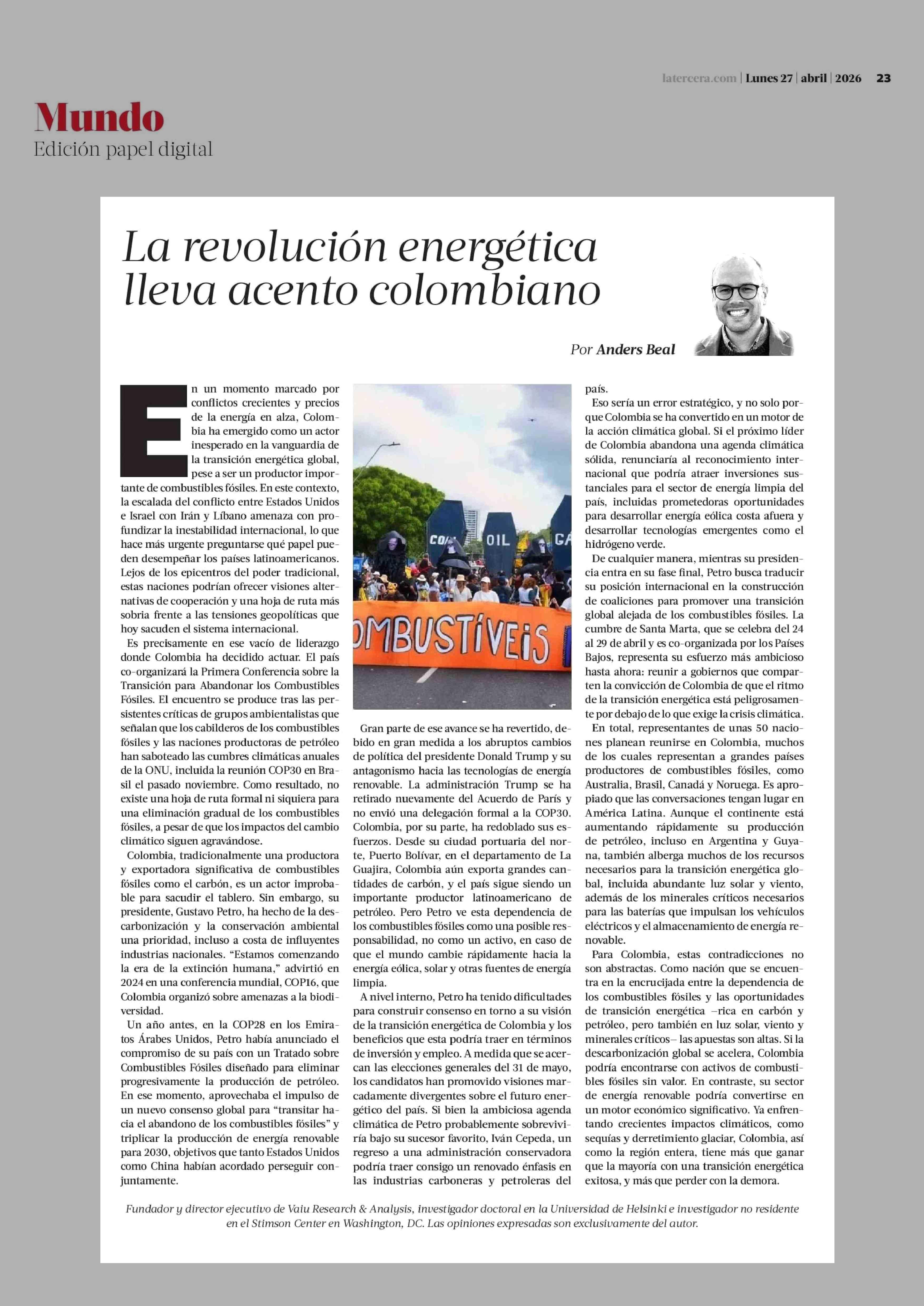 La revolución energética lleva acento colombiano 27-04-2026 La Tercera |