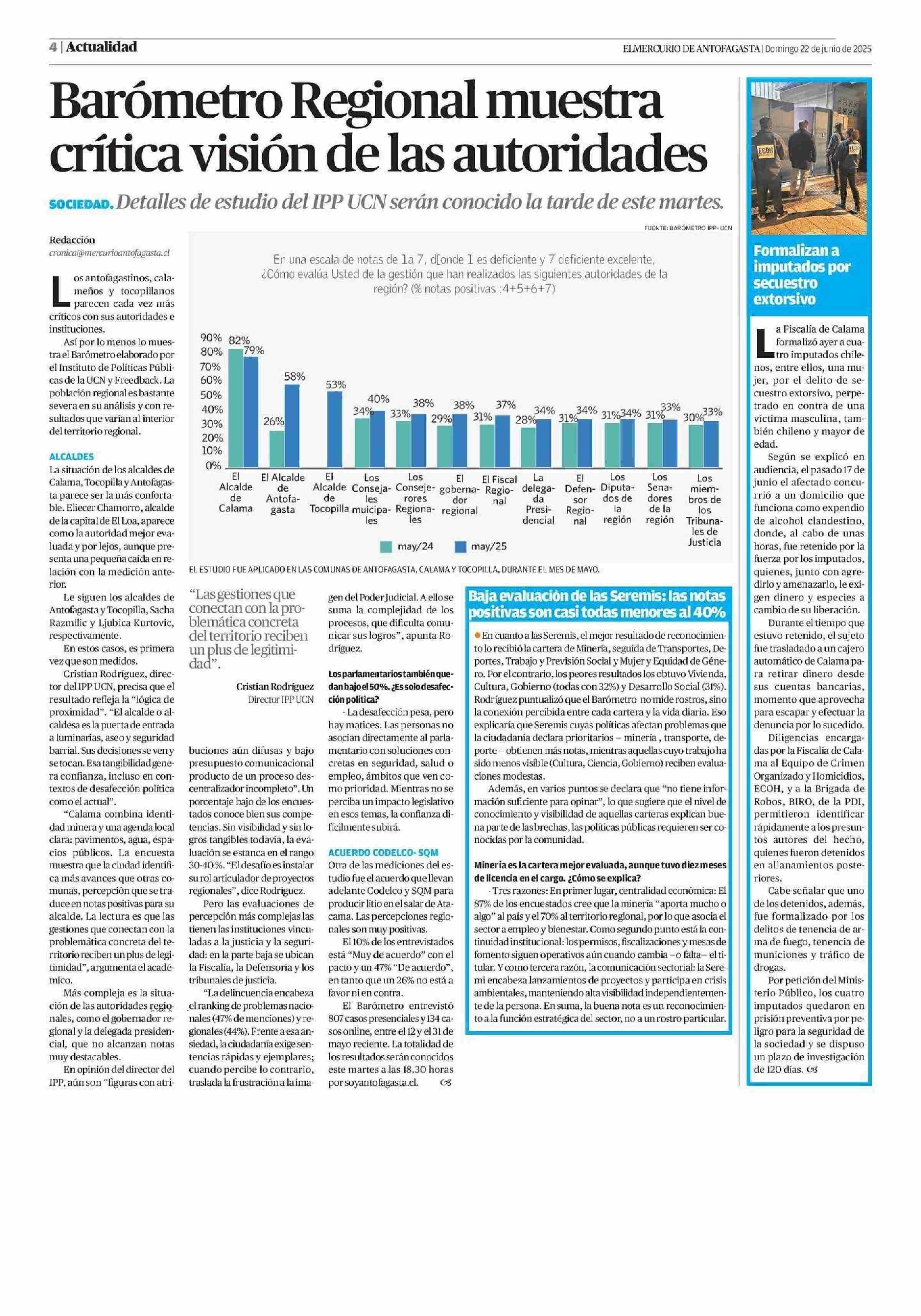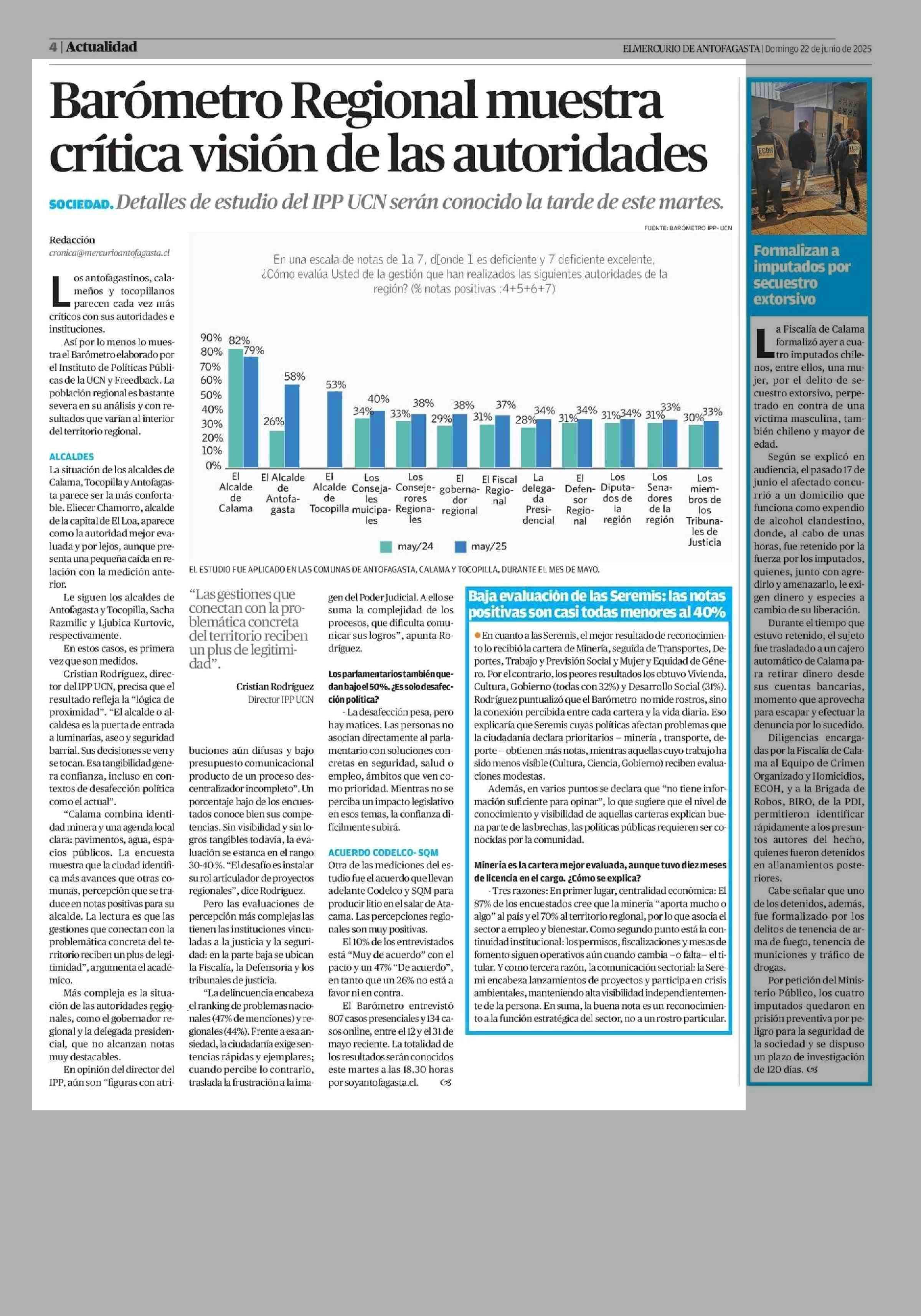 Barómetro Regional muestra crítica visión de las autoridades 22-06-2025 El Mercurio de Antofagasta |