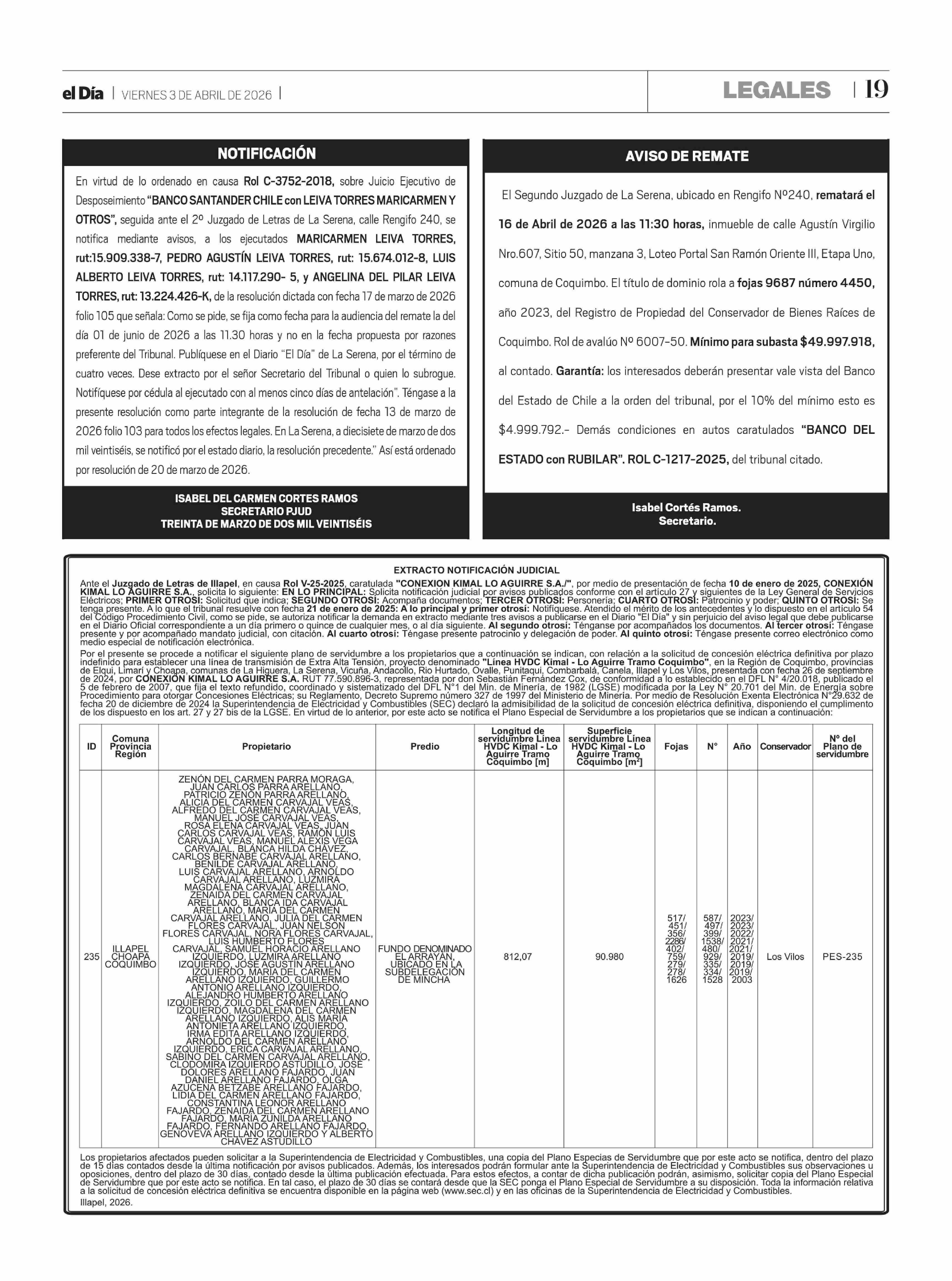 Título: EXTRACTO NOTIFICACIÓN JUDICIAL Ante el Juzgado de Letras de Illapel, en causa Rol V-25-2025, caratulada "CONEXION KIMAL LO AGUIRRE S.A./