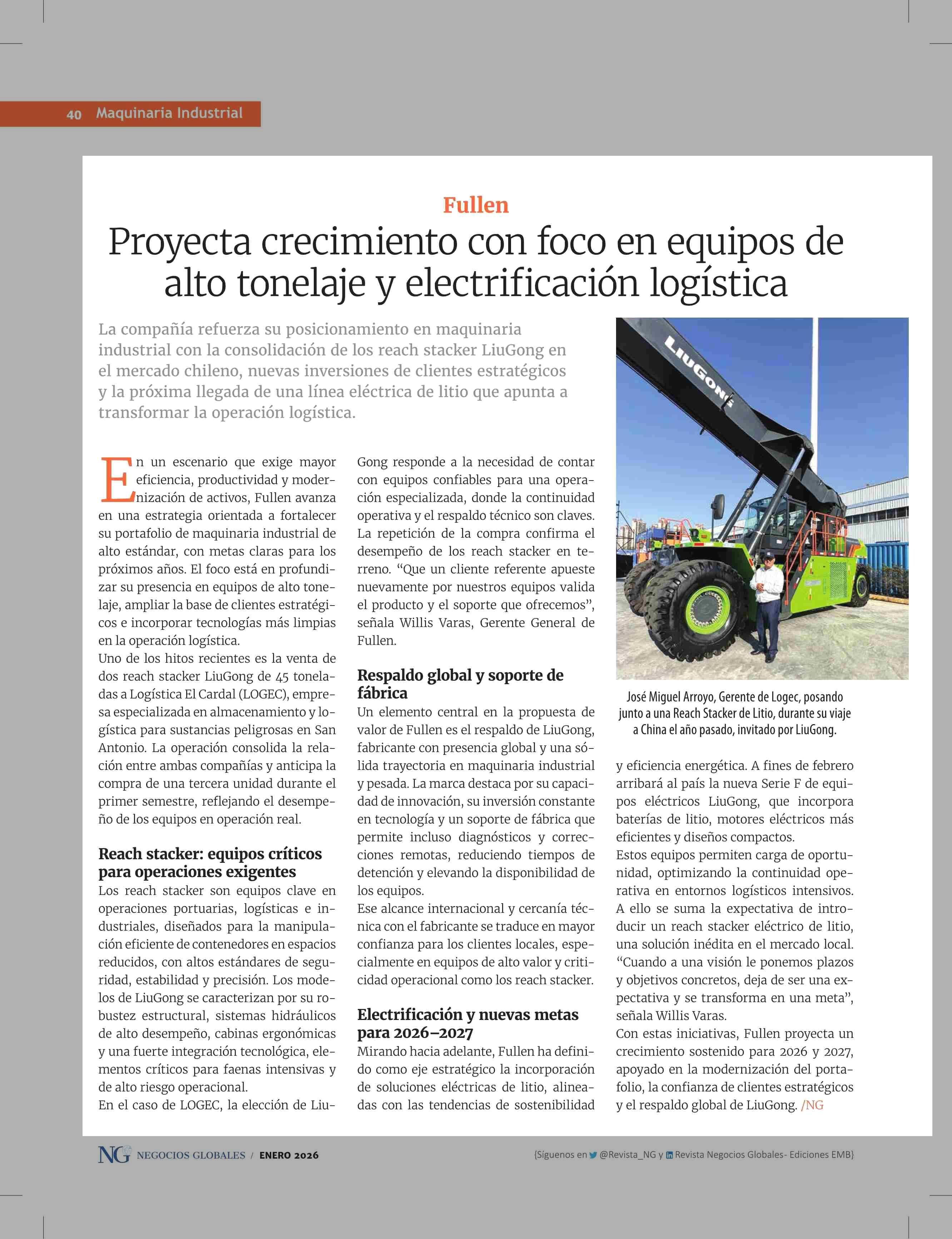 Proyecta crecimiento con foco en equipos de alto tonelaje y electrificación logística 21-01-2026 Revista NG |