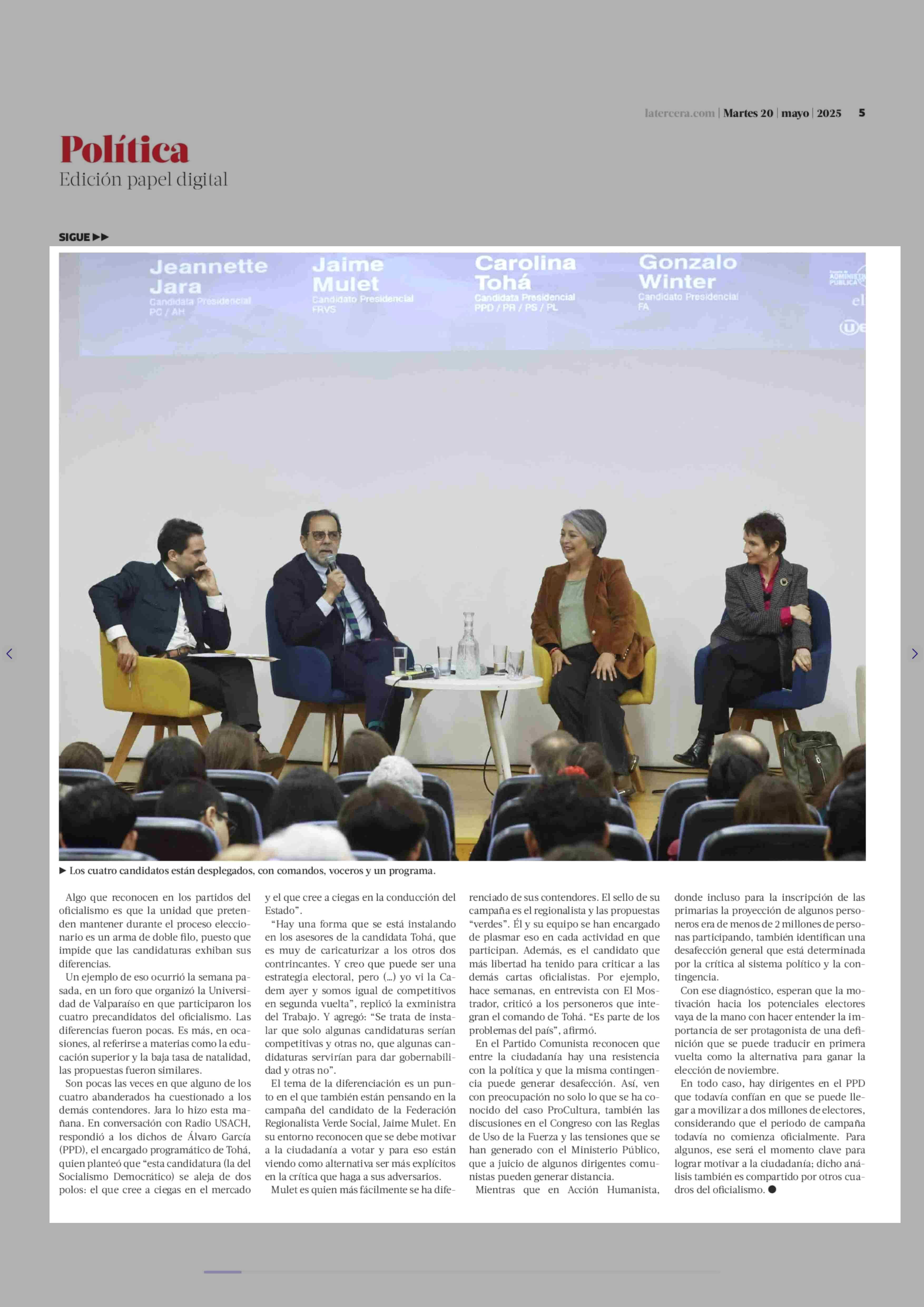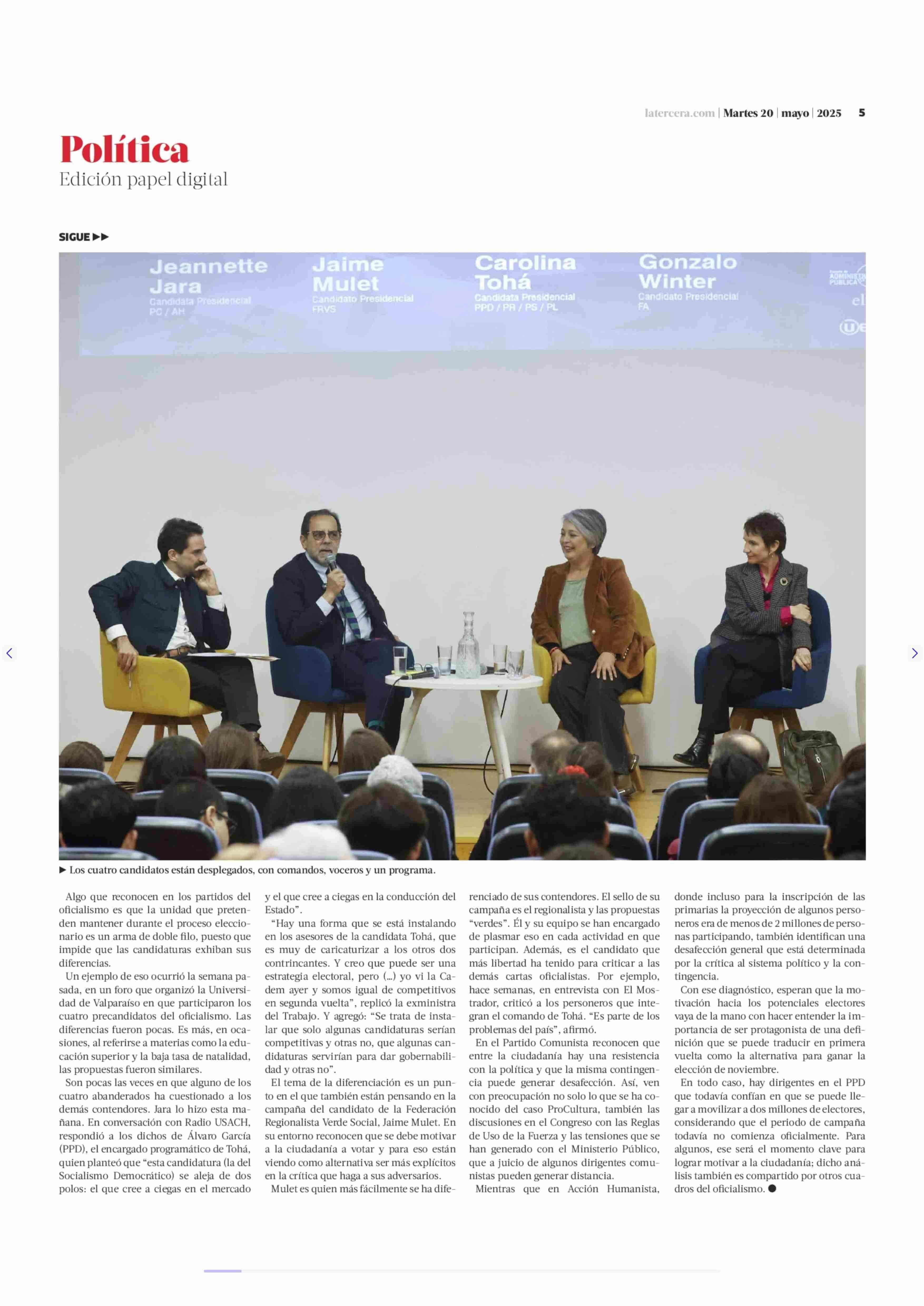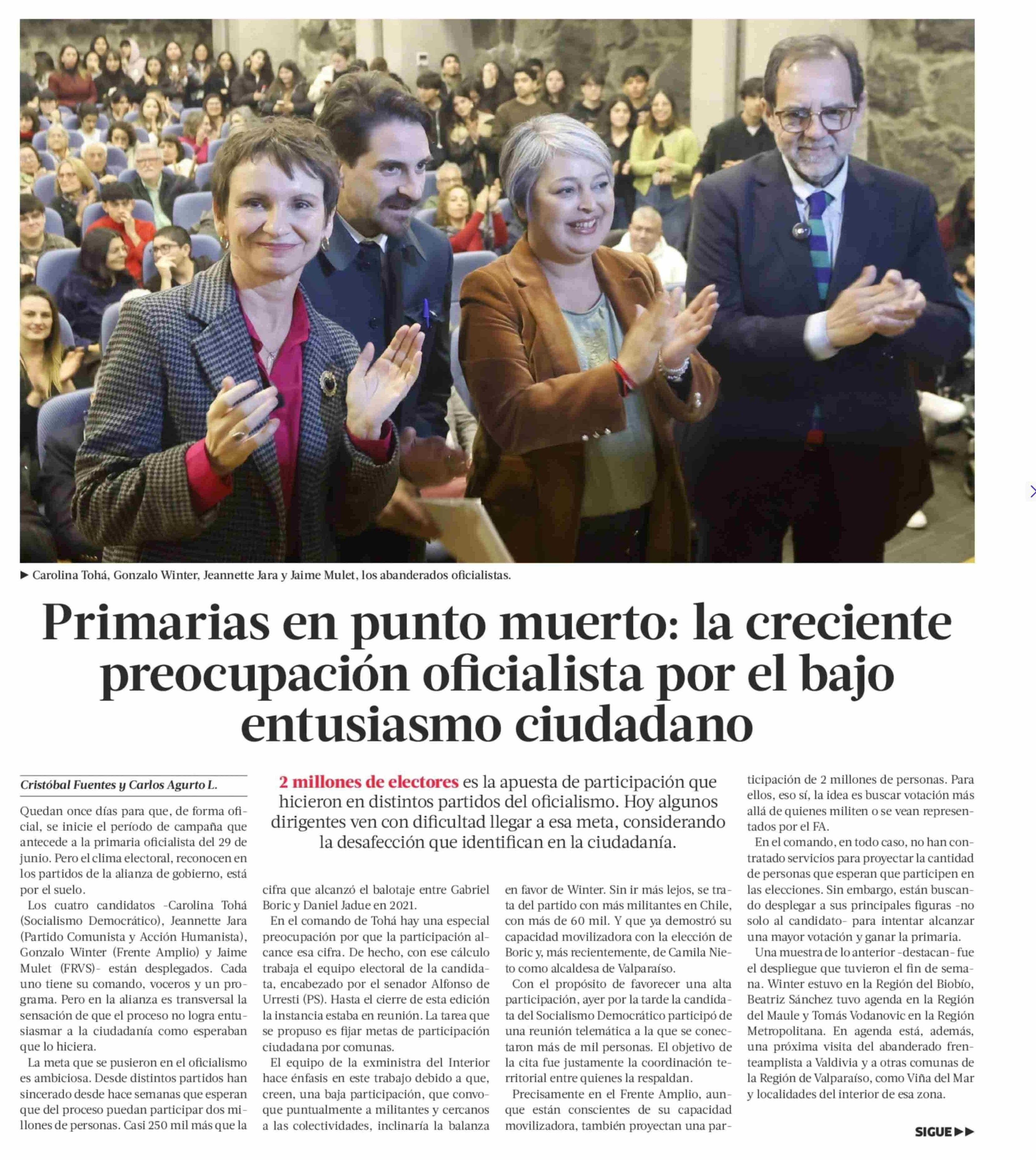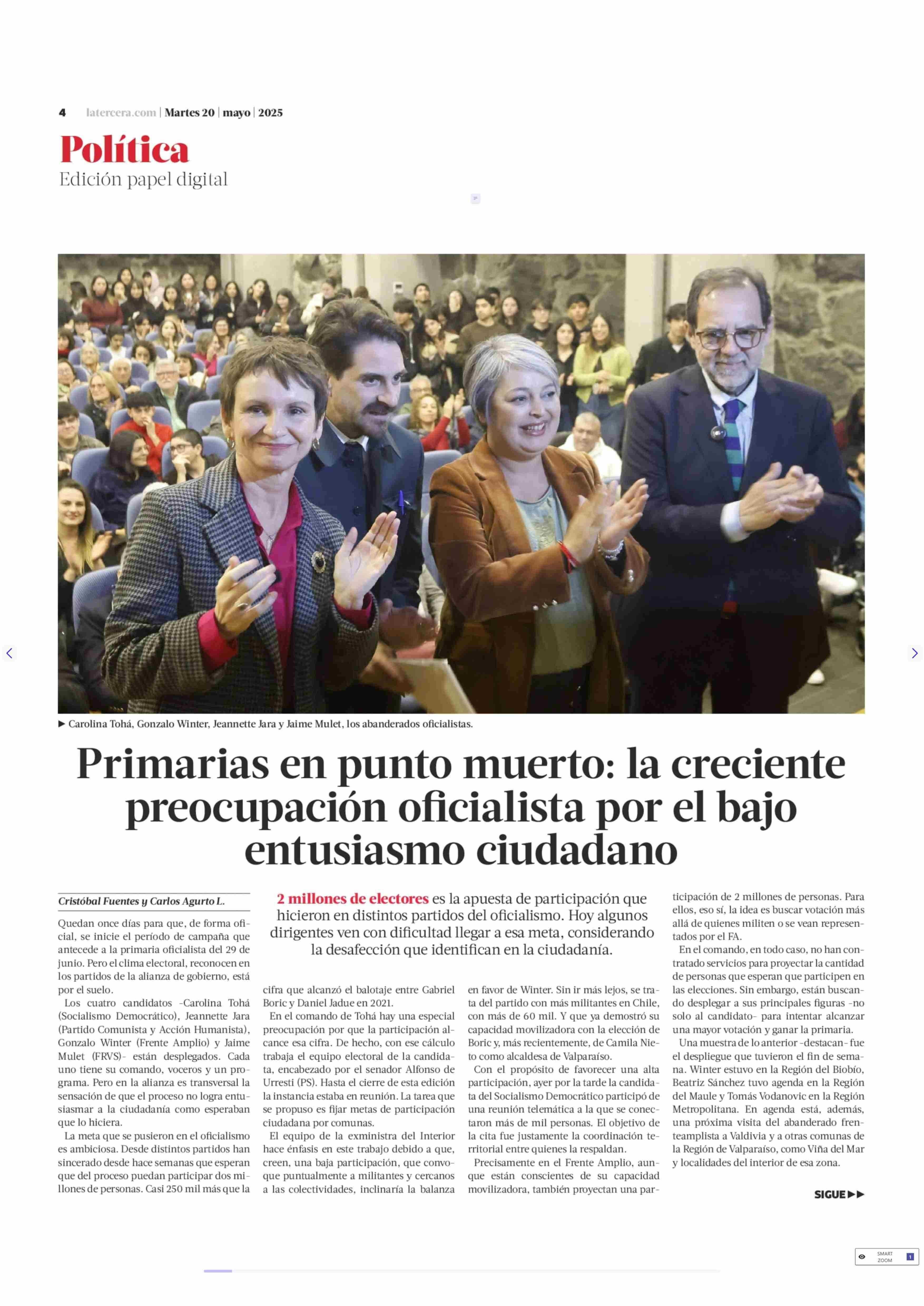 Primarias en punto muerto: la creciente preocupación oficialista por el bajo entusiasmo ciudadano 20-05-2025 La Tercera |