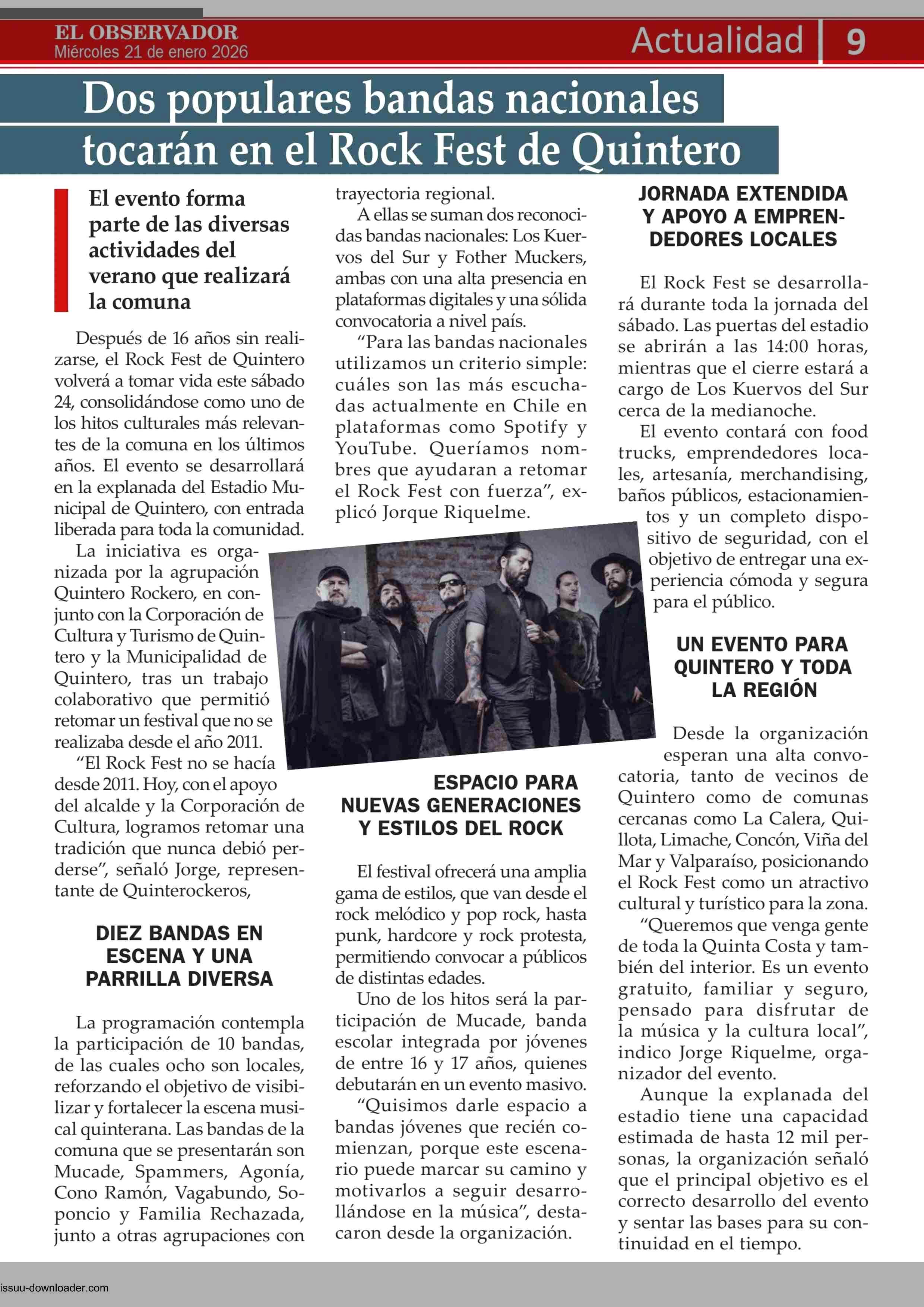 Dos populares bandas nacionales tocarán en el Rock Fest de Ouintero 21-01-2026 El Observador Vespertino |