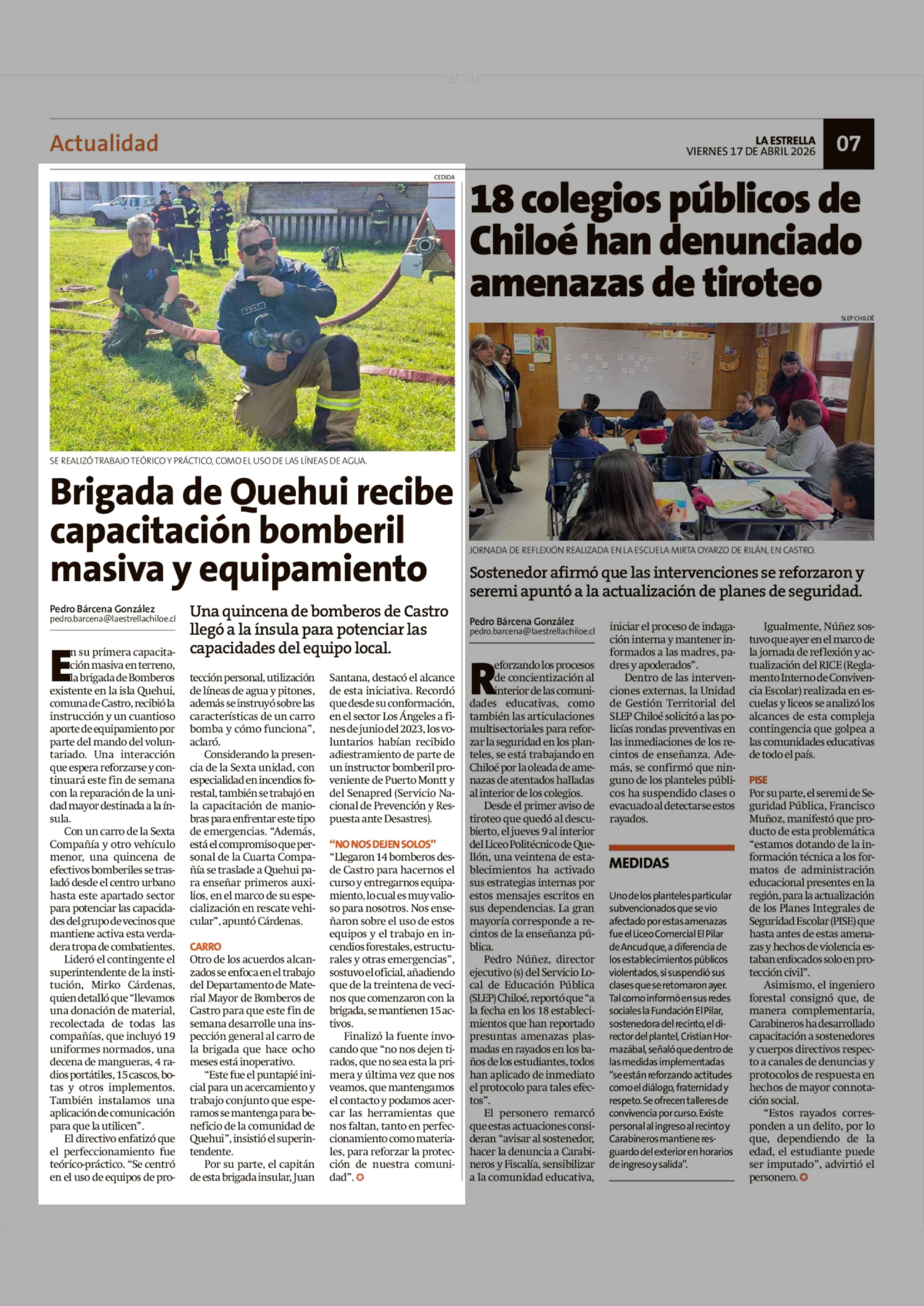 Brigada de Quehui recibe capacitación bomberil masiva y equipamiento 17-04-2026 La Estrella de Chiloé |