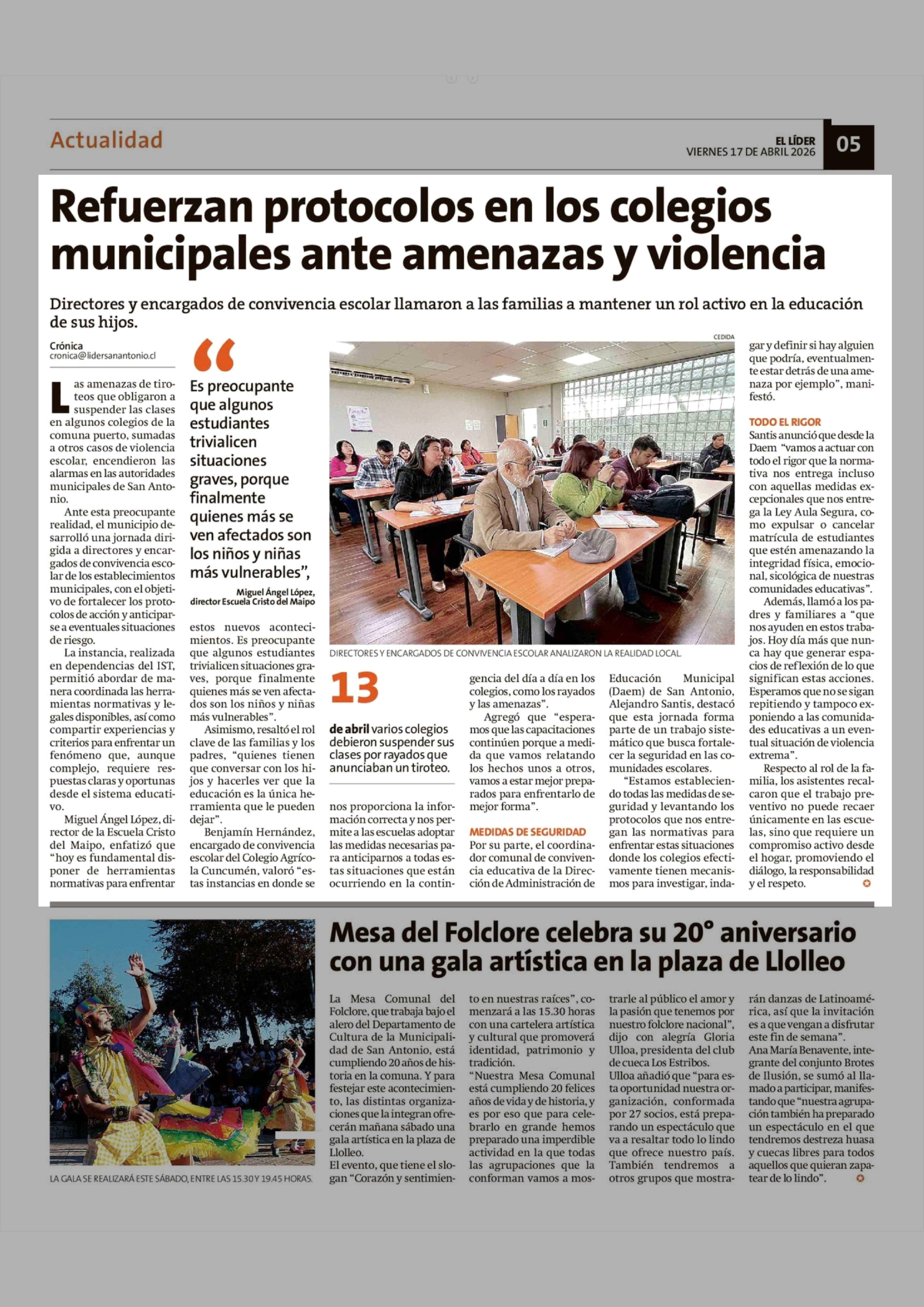 Refuerzan protocolos en los colegios municipales ante amenazas y violencia 17-04-2026 El Líder |