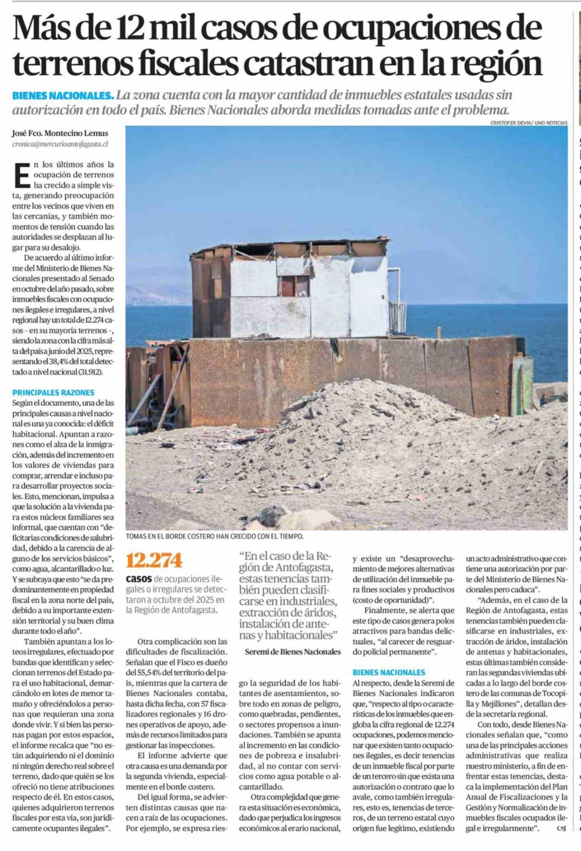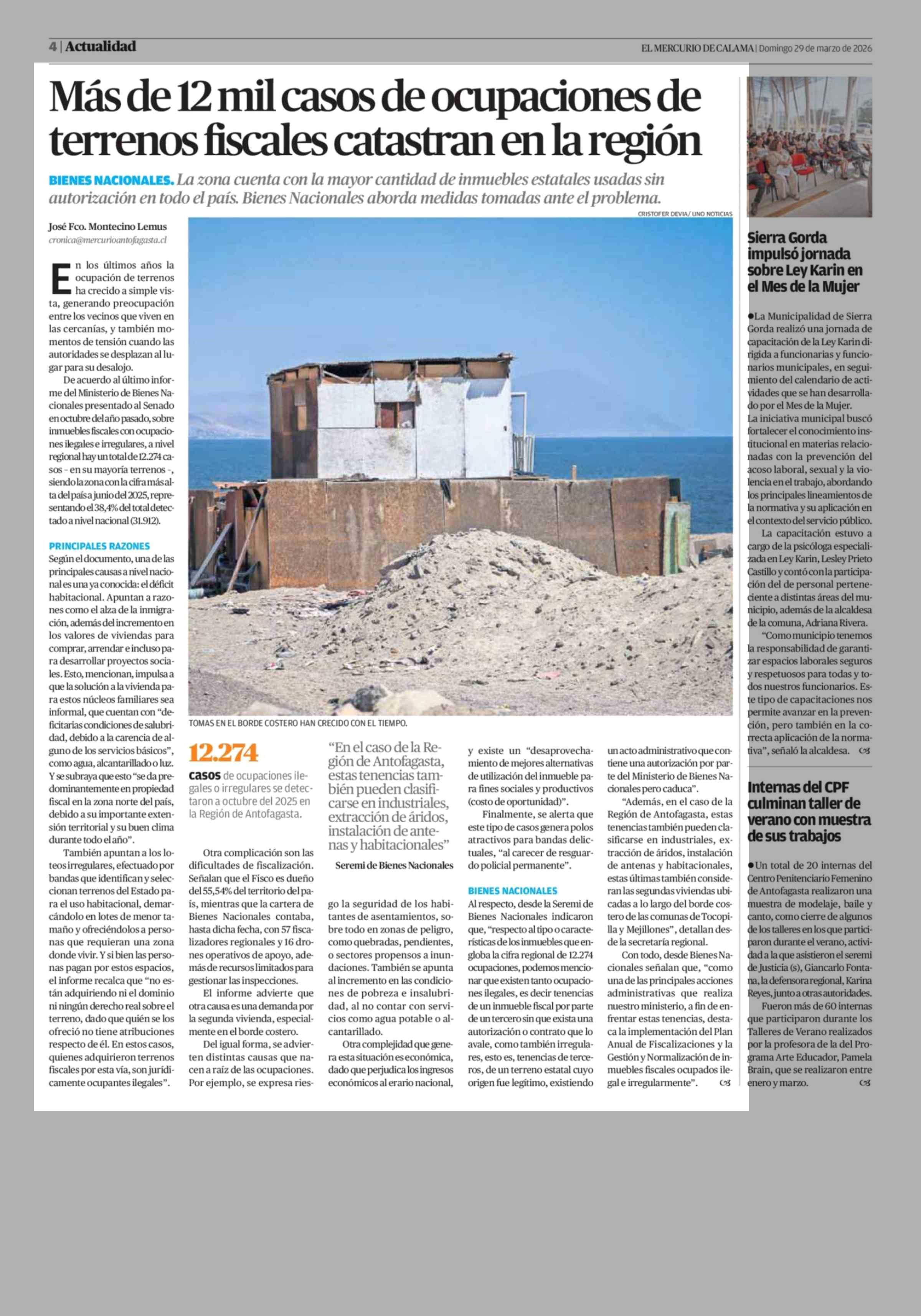 Más de 12 mil casos de ocupaciones de terrenos fiscales catastran en la región 29-03-2026 El Mercurio de Calama |