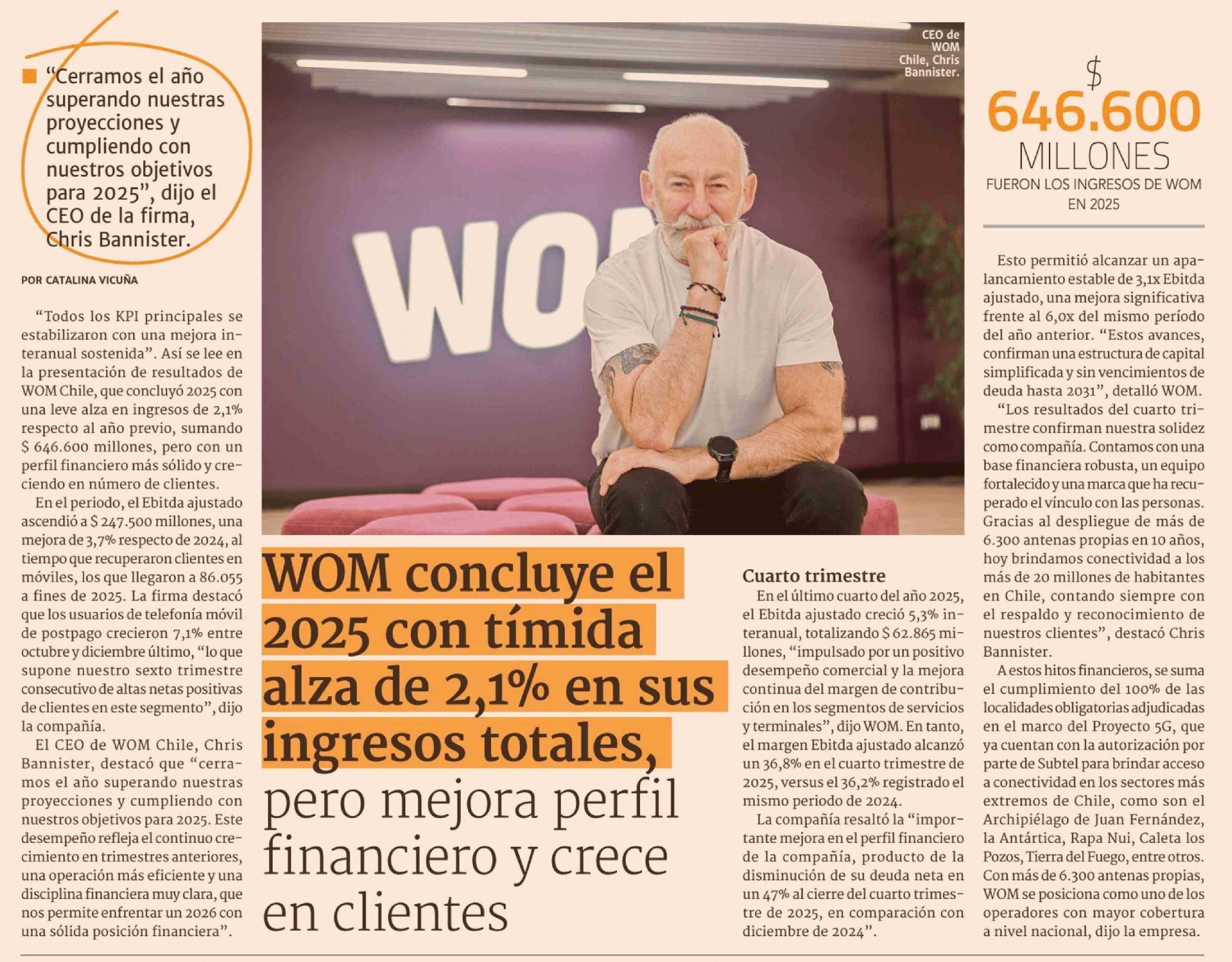 Título: WOM concluye el 2025 con tímida alza de 2,1% en sus ingresos totales, pero mejora perfil financiero y crece en clientes