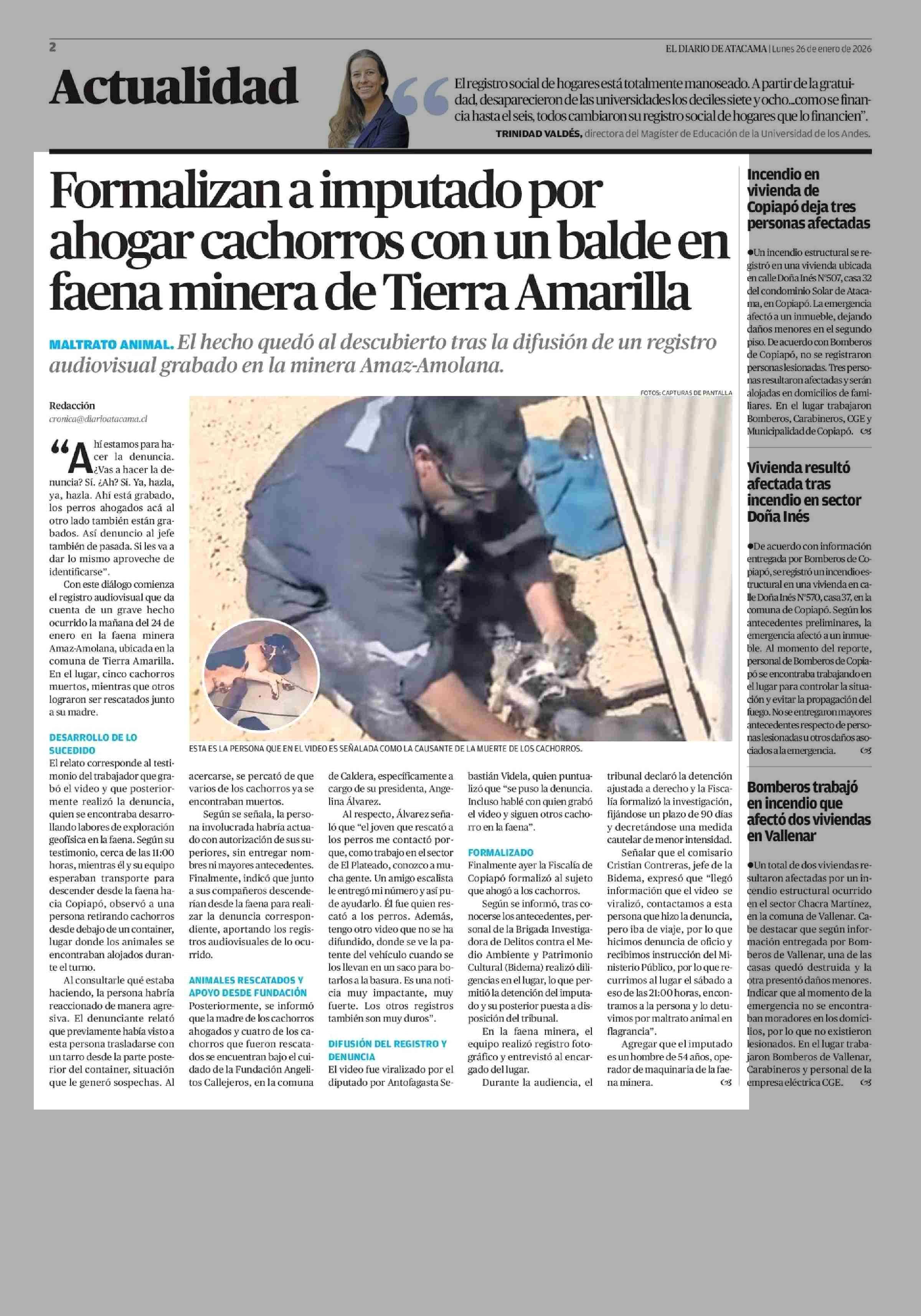Formalizan a imputado por ahogar cachorros con un balde en faena minera de Tierra Amarilla 26-01-2026 El Diario de Atacama |