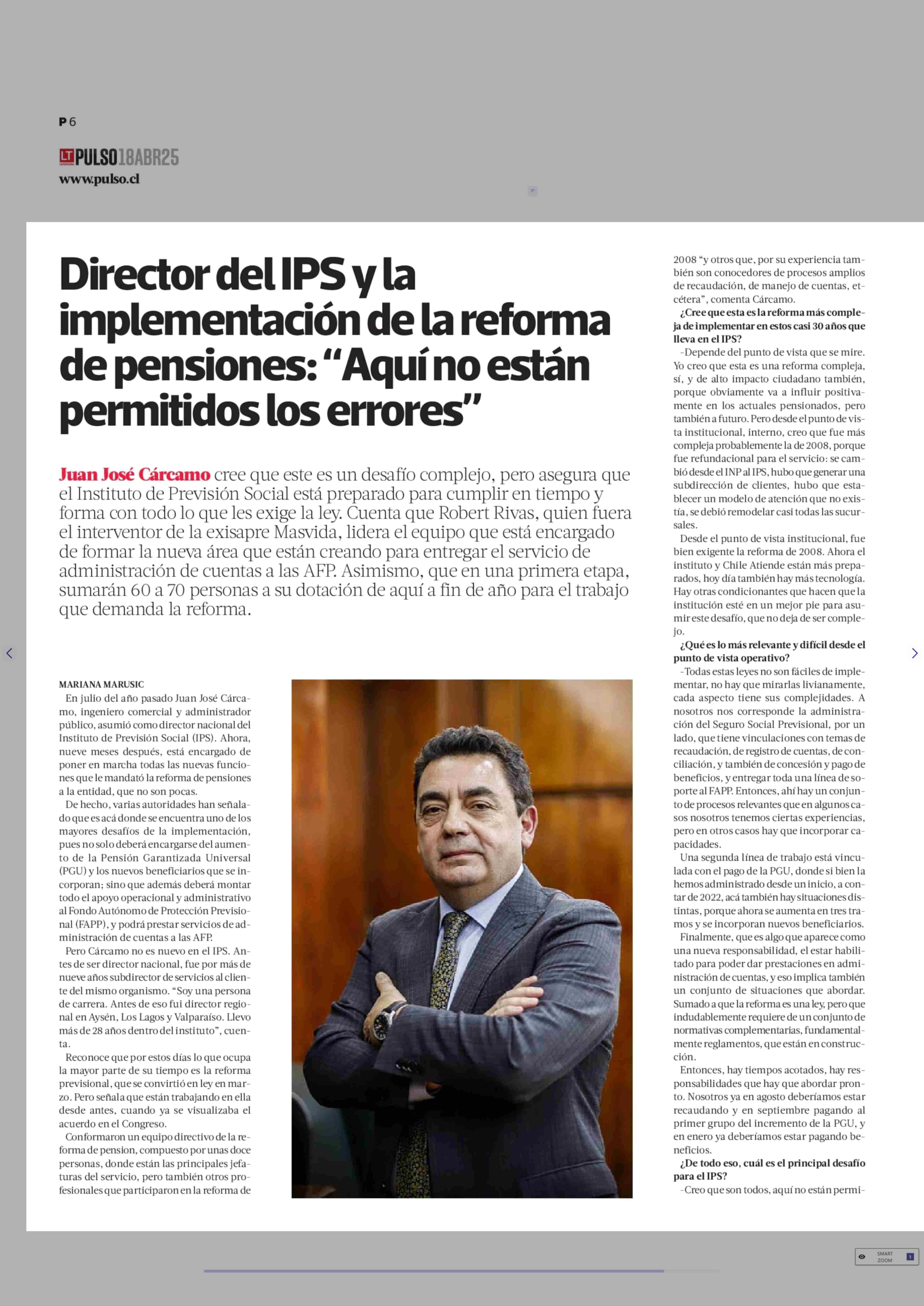 Director del IPS y la implementación de la reforma de pensiones: “Aquí no están permitidos los errores” 18-04-2025 La Tercera |