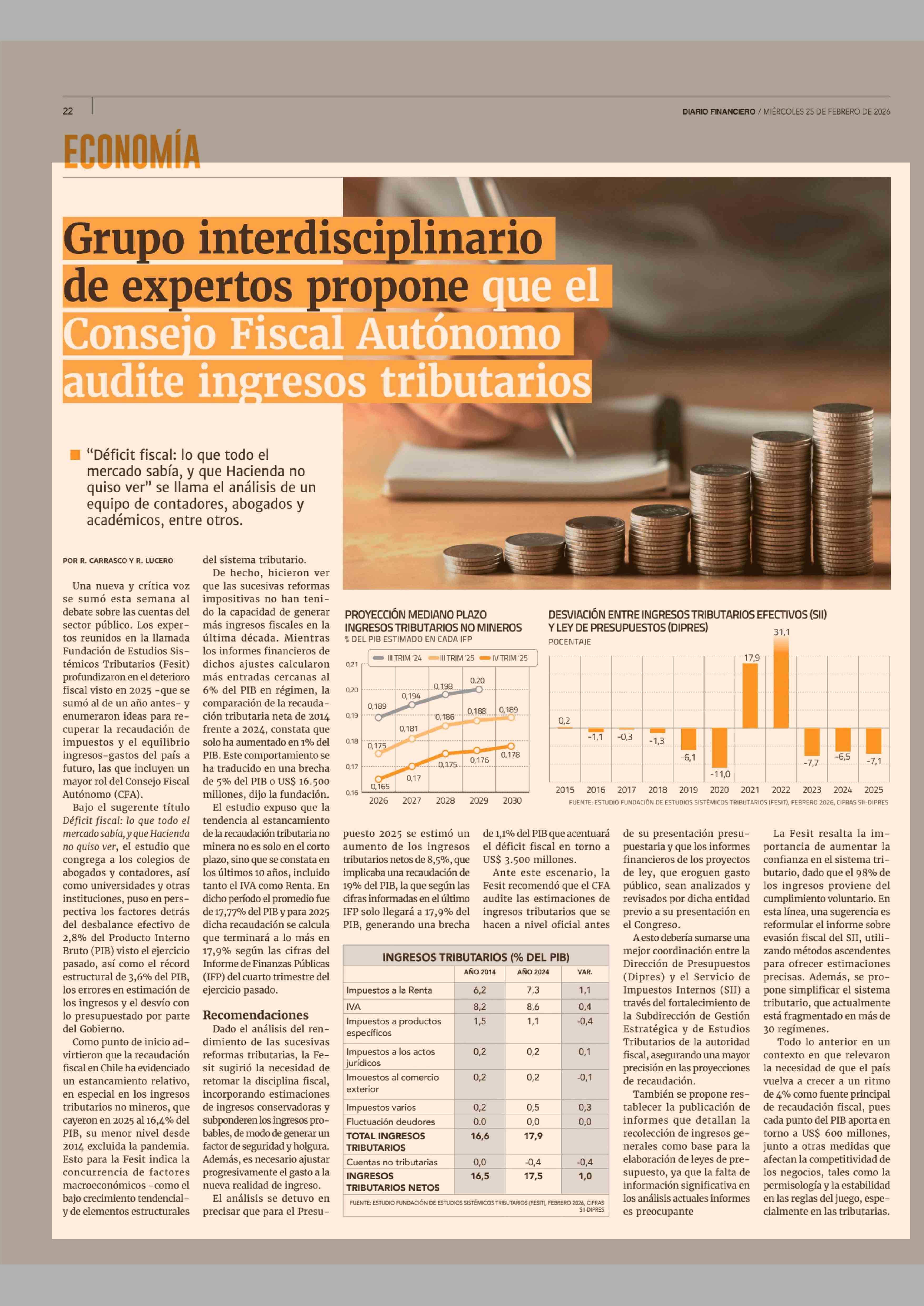 Grupo interdisciplinario de expertos propone que el Consejo Fiscal Autónomo audite ingresos tributarios 25-02-2026 Diario Financiero |