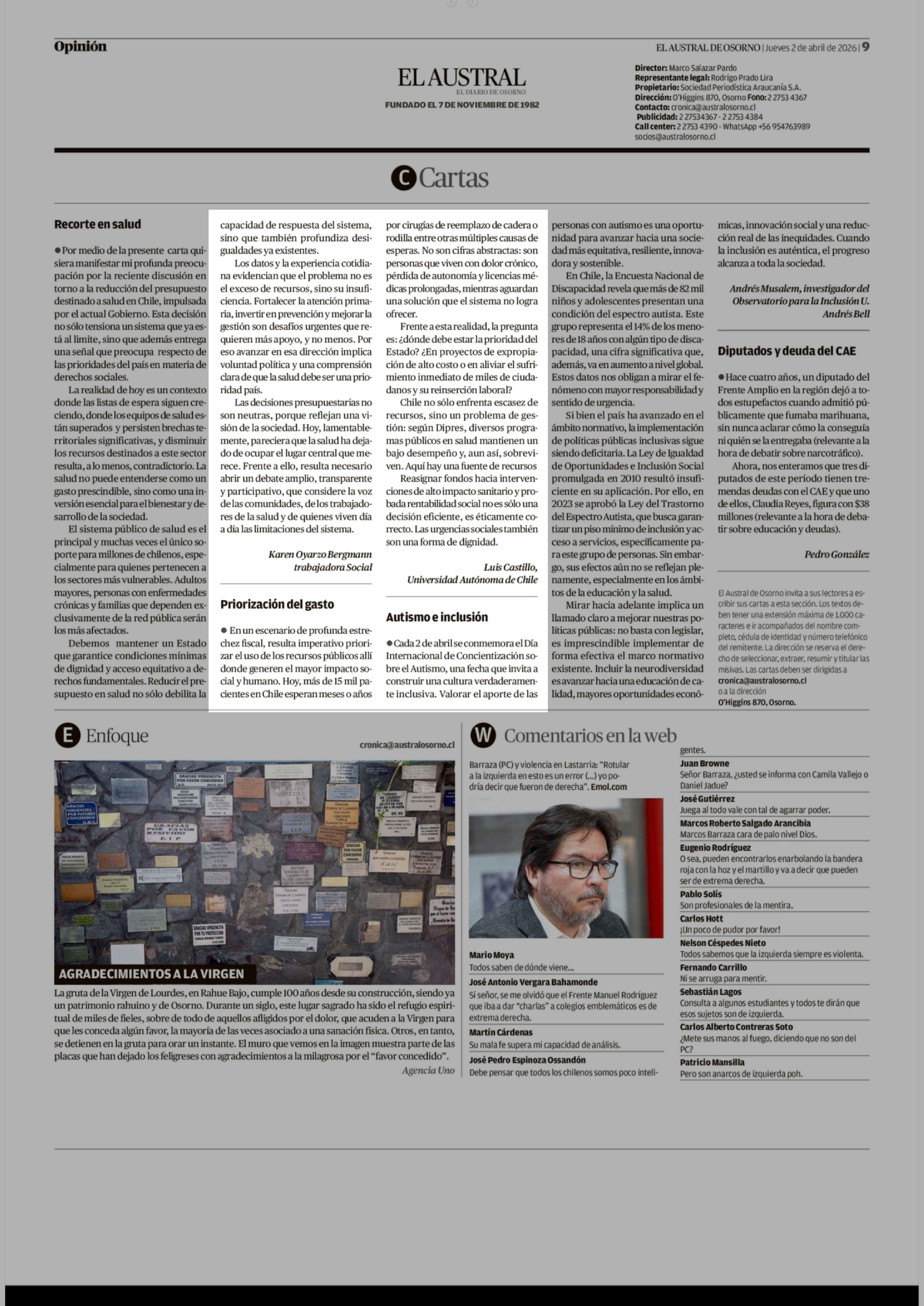 Cartas: Priorización del gasto 02-04-2026 El Austral de Osorno |